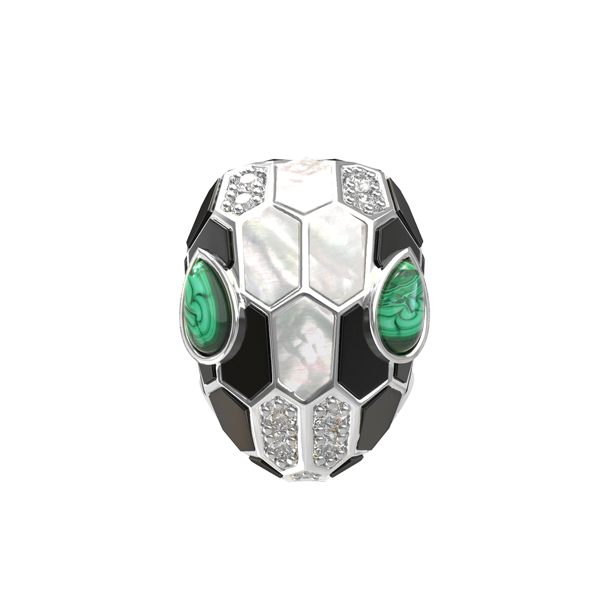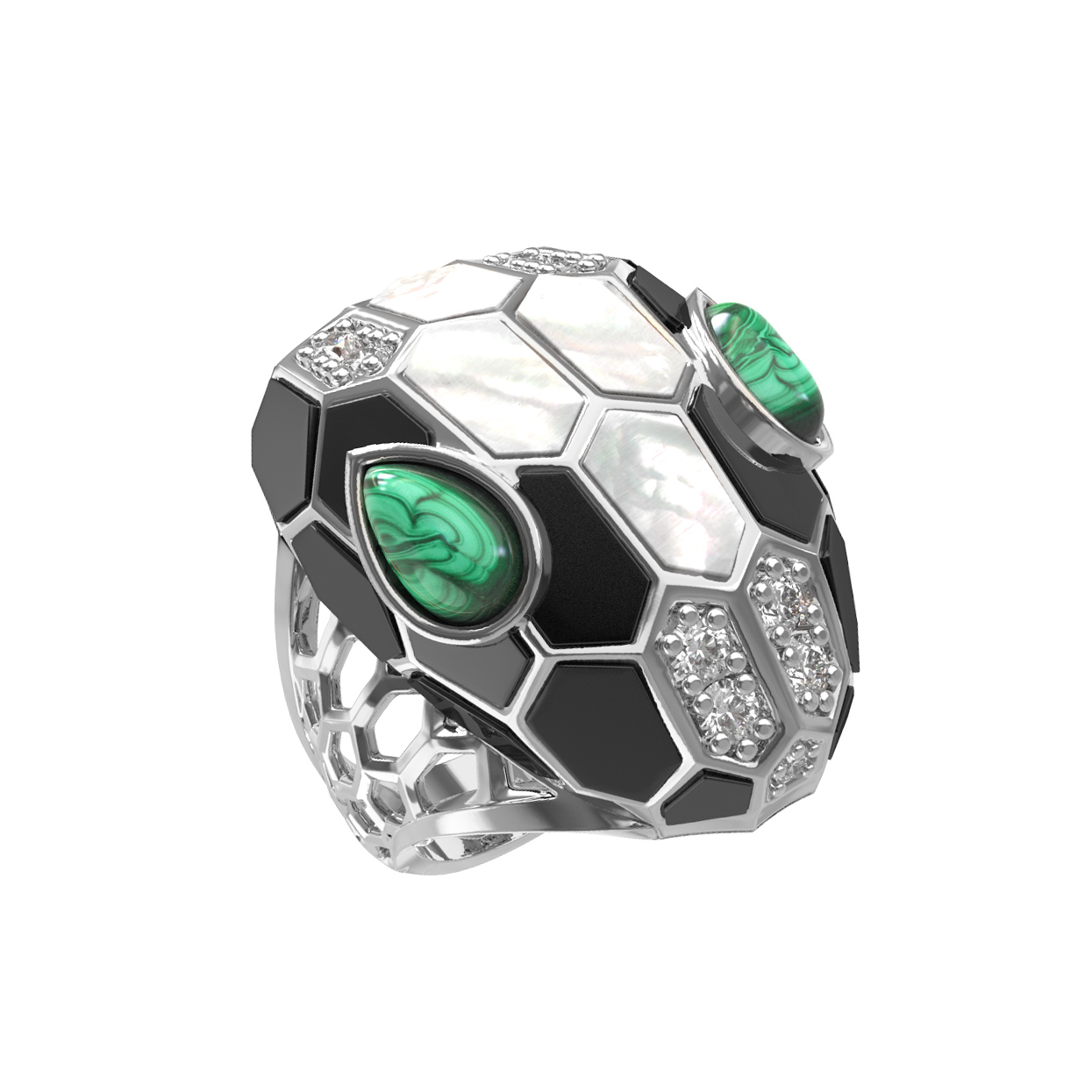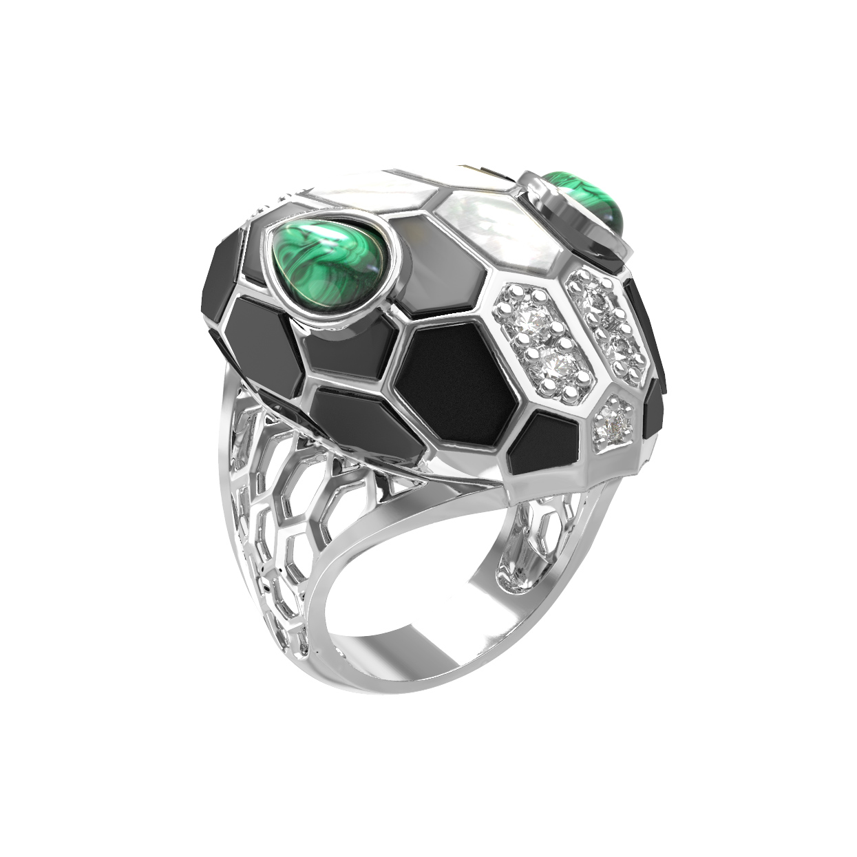 Кольцо из белого золота c бриллиантами, рубином, ониксом, малахитом и перламутром