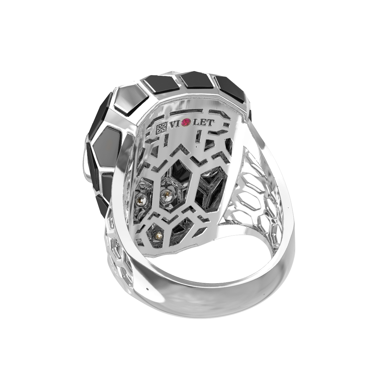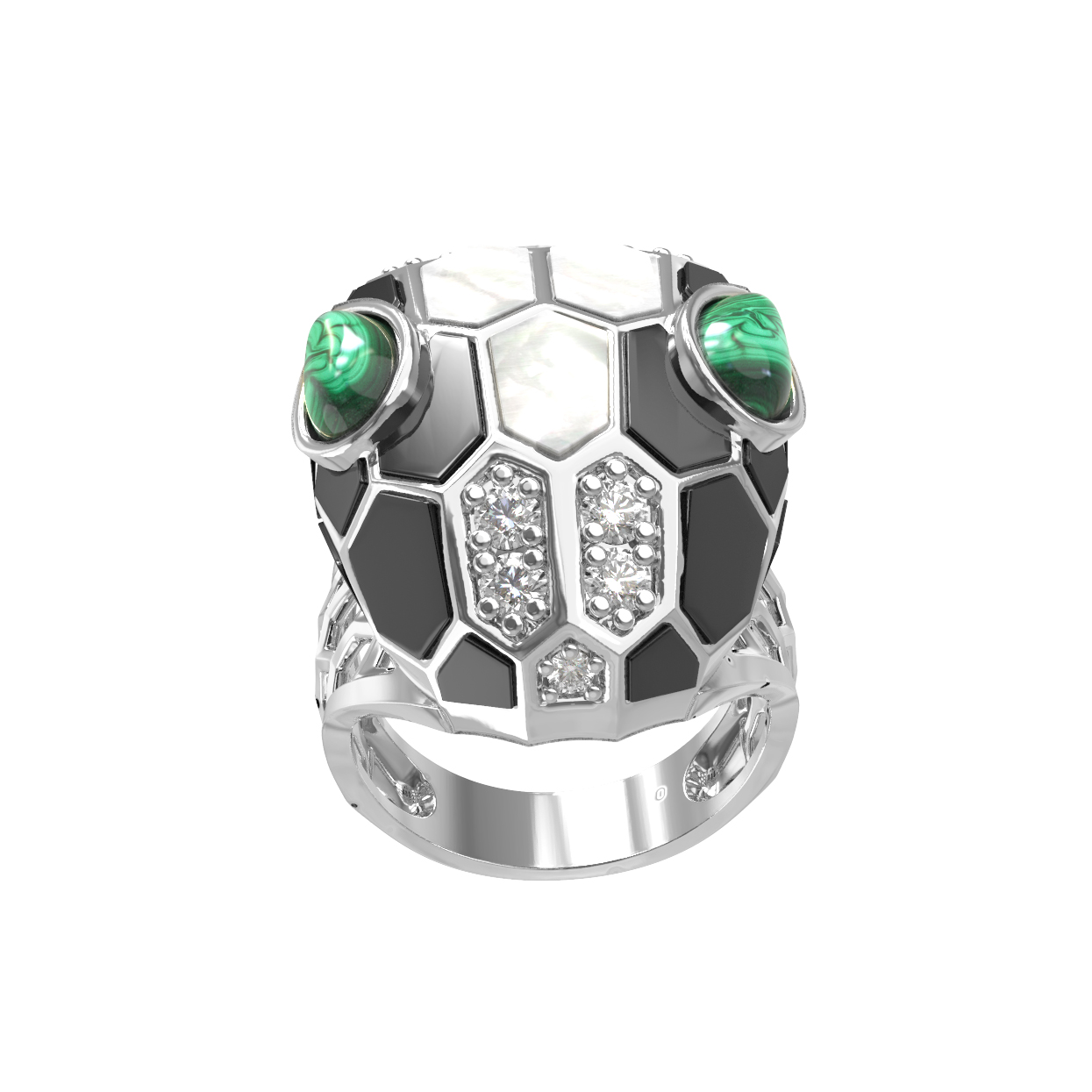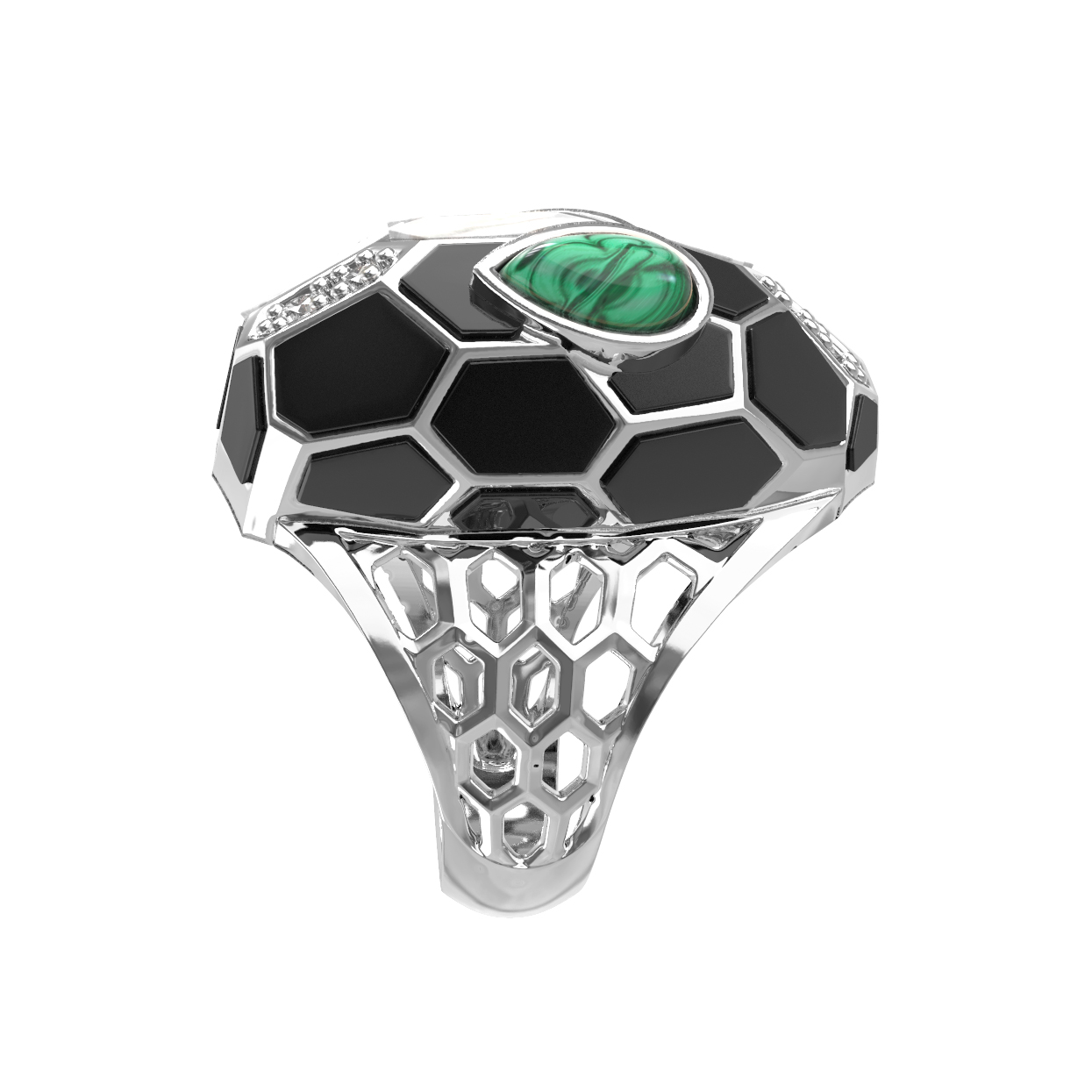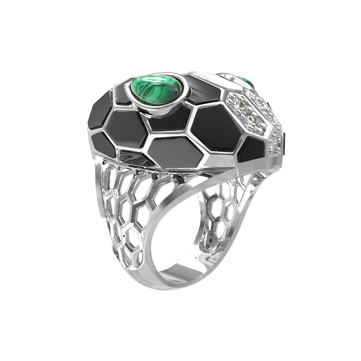 Кольцо из белого золота c бриллиантами, рубином, ониксом, малахитом и перламутром