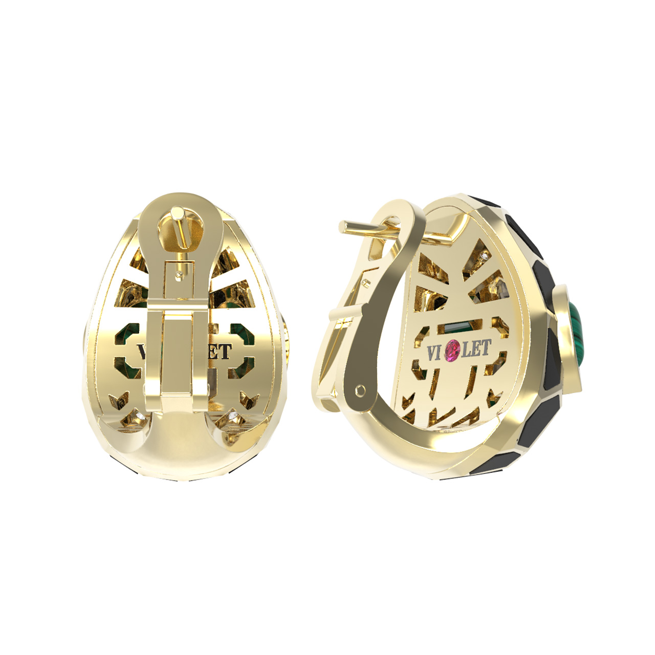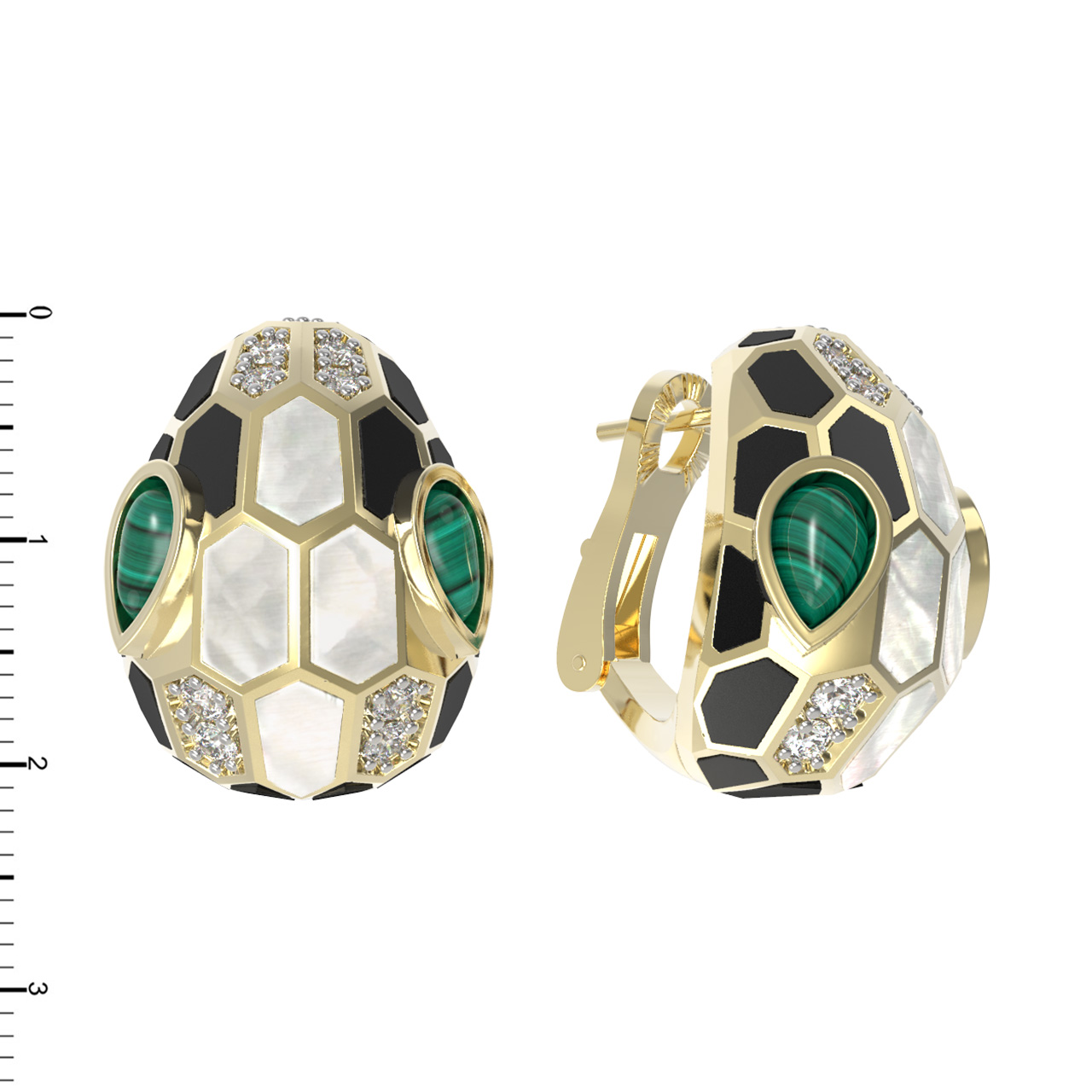 Серьги из лимонного золота c бриллиантами, рубином, ониксом, малахитом и перламутром