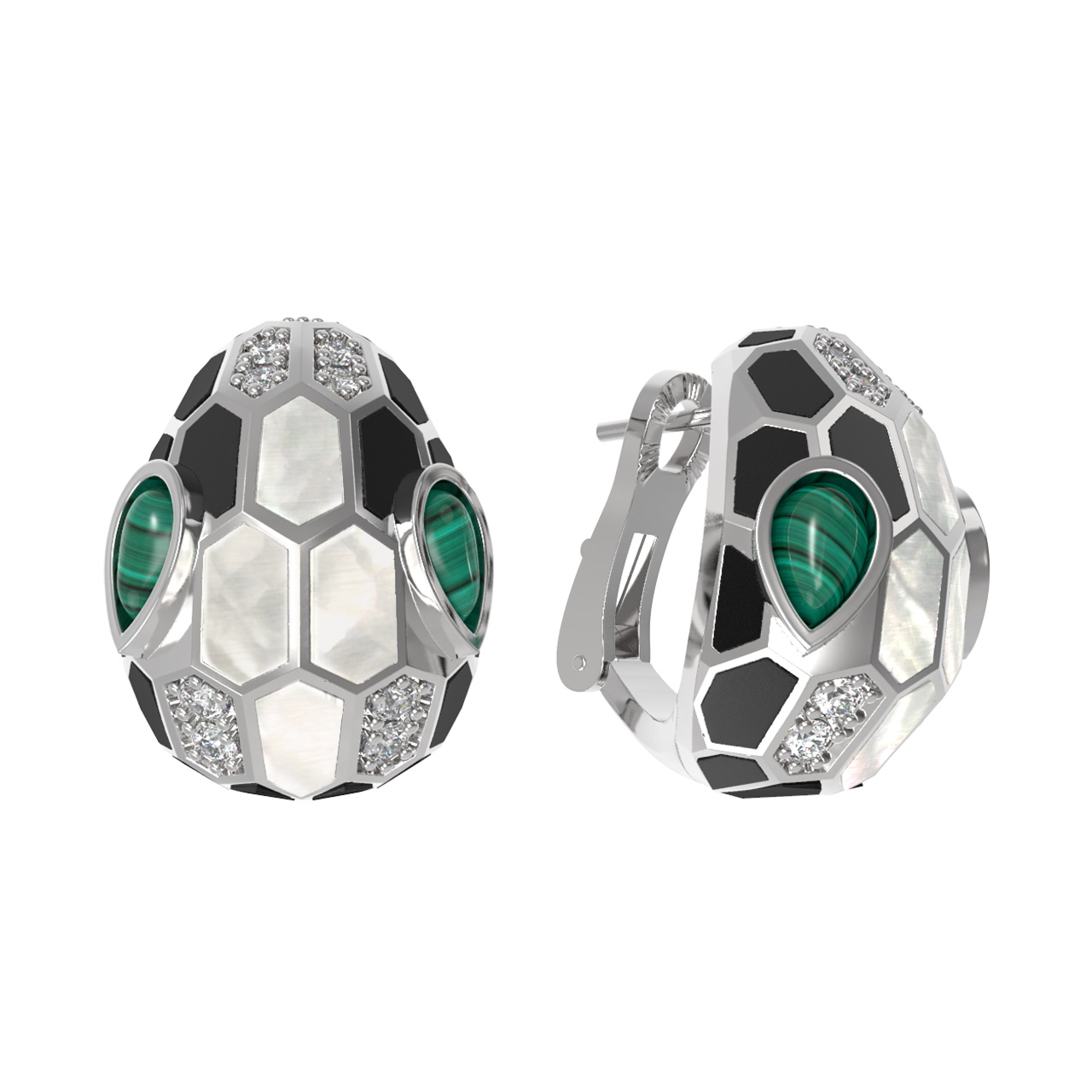 Серьги из белого золота c бриллиантами, рубином, ониксом, малахитом и перламутром