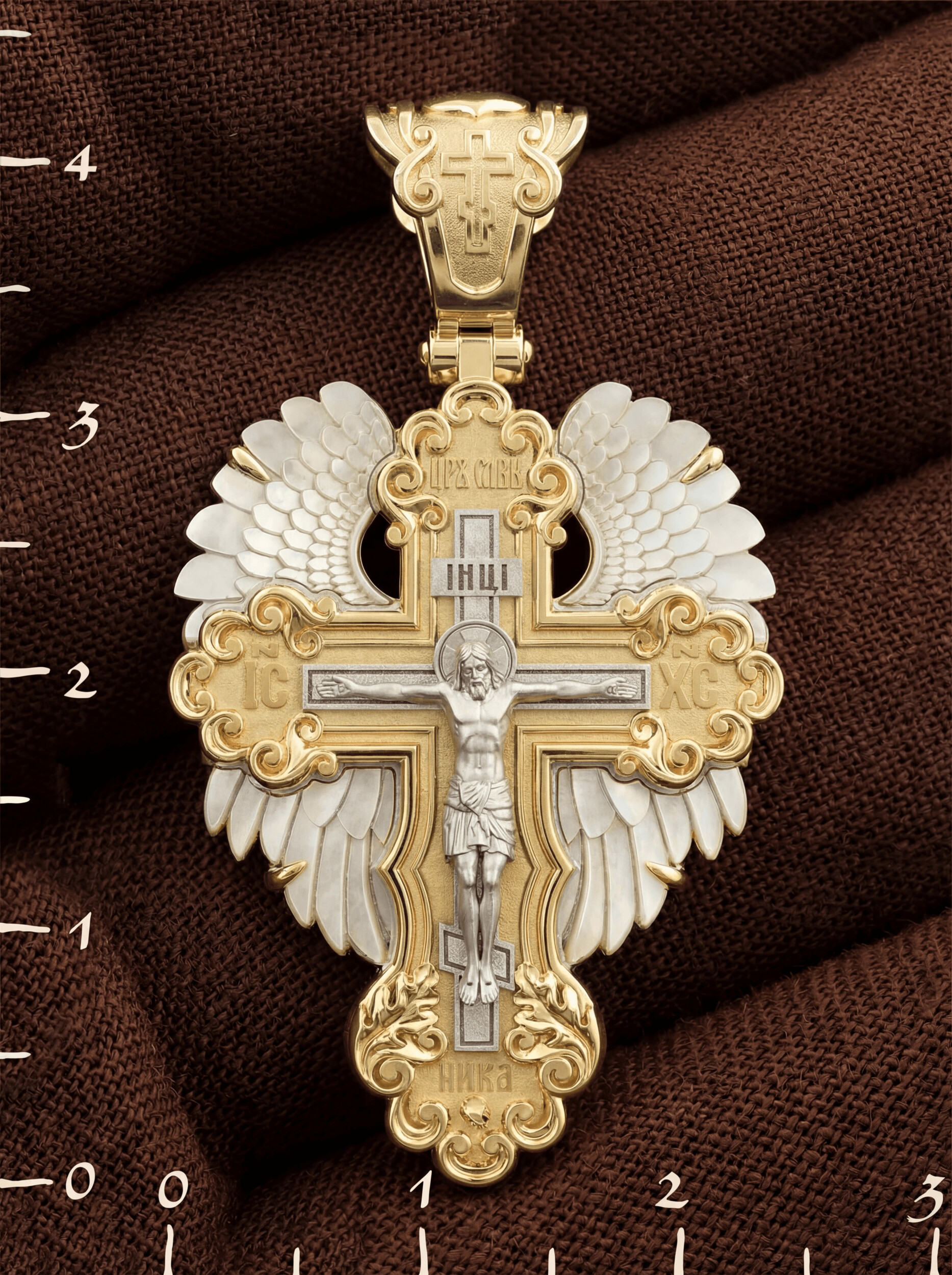 На лицевой стороне креста изображено Распятие Господа и Спасителя нашего Иисуса Христа. В Голгофе сокрыта непостижимая тайна бесконечной правды и любви Бога. Крест стал символом победы добра над злом, жизни над смертью, напоминанием бесконечной Божьей любви, предметом радости. Воплотившийся Сын Божий Своею кровью освятил крест и сделал его проводником Своей благодати, источником освящения верующих. Господь сказал: кто хочет идти за Мною, отвергнись себя, и возьми крест свой, и следуй за Мною. (Мк. 8: 34). Над Распятием помещена надпись «Царь Славы». Ниже расположена перекладина которая символизирует титло — табличку, на которой, согласно Евангелию, было начертано: Иисус Назорей Царь Иудейский (IНЦI). Надпись «IС ХС» означает Иисус Христос, помещается на разных сторонах поперечной перекладины креста. В нижней части креста помещено слово «НИКА», что означает «победитель». Крест стоит на горе камней, символизирующих Голгофу. В ее основании различается череп — это голова Адама.