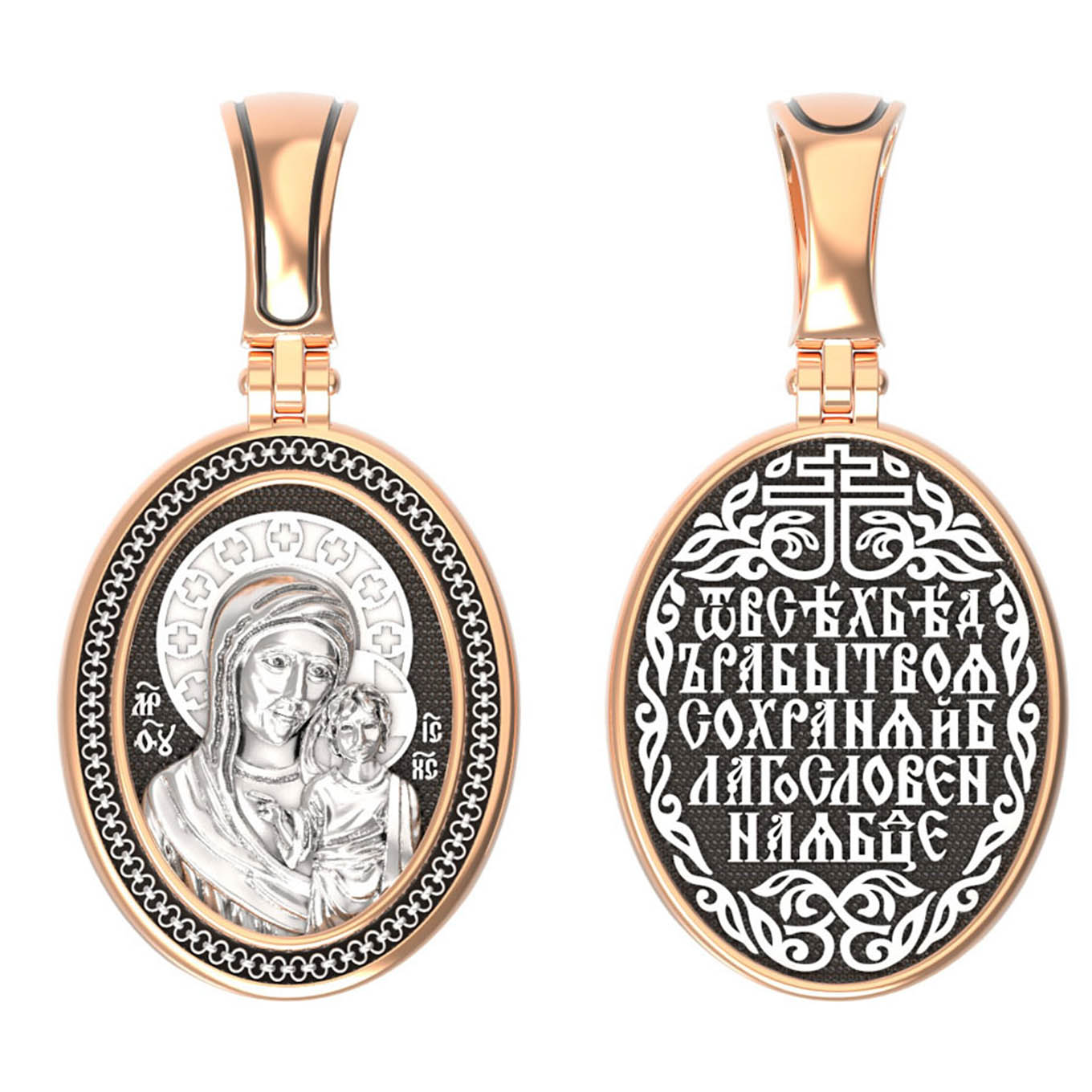 На лицевой части образка изображена Казанская икона Божией Матери — одна из самых почитаемых в России чудотворных икон Богородицы. Богословское значение Казанской иконы — указать верующим истинный Путь к спасению, который лежит через Христа. Только Божия Матерь имеет настолько сильное дерзновение к Спасителю, что может ходатайствовать перед Ним за всех верных. Именно этот образ дарится новой повенчанной паре, как хранитель очага и семейная реликвия. Молитва перед Казанской иконой Божьей Матери помогает во всех сложных случаях жизни, в болезнях, во всех печалях, невзгодах, скорбях. Уникальная история появления, чудеса, случившиеся по молитвам православных людей возле образа — все это делает Казанскую Богородицу особенной, среди тысяч других икон.