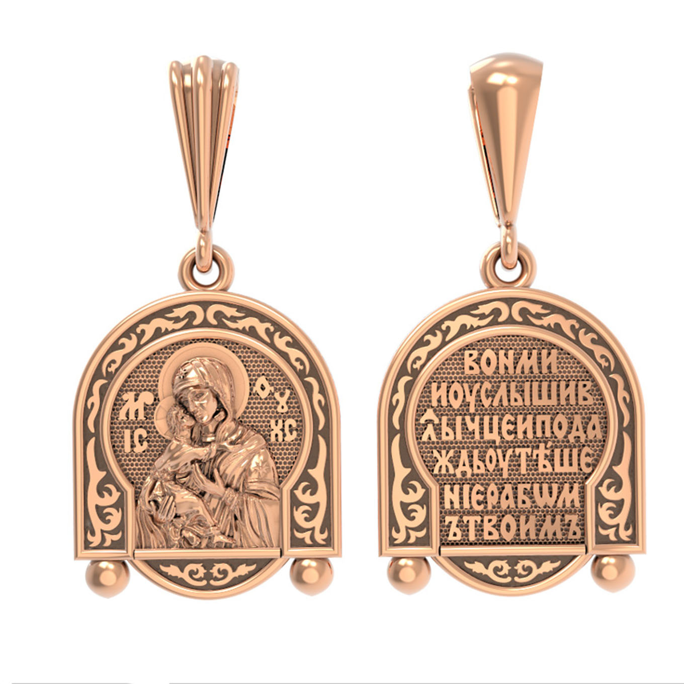 Лицевую сторону возглавляет Владимирская икона Божией Матери — самая великая русская святыня, многие века бывшая олицетворением нашей земли. Перед ней венчались на царство государи, избирались патриархи. Пречистой Богородице Владимирской клялись в верности Отечеству солдаты и за нее умирали на поле брани. Именно на ее защиту более всего уповала Россия в самые страшные периоды своей истории. Владимирская икона Божией Матери, по преданию, была написана на доске трапезного стола из дома Иисуса Христа. На Русь она была привезена в начале XII века и с тех пор почитается как главная святыня нашего Отечества. Перед ней молитвенно просят Богородицу об исцелении от телесных недугов, в частности, заболеваний сердца и сердечнососудистой системы. За помощью к ней обращаются во время бедствий, когда нуждаются в защите от врагов.