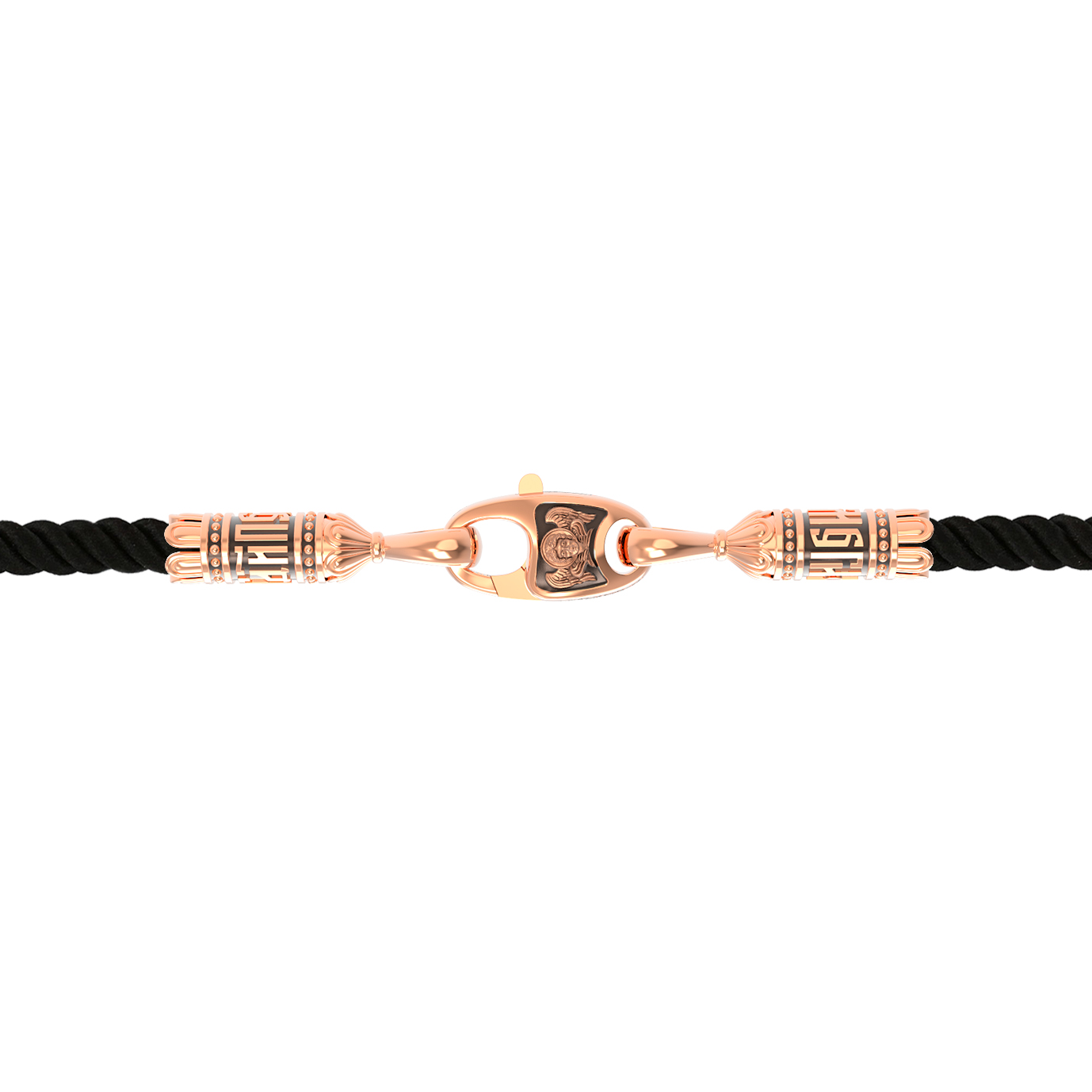 На концах цепи-шнурка расположены концевики с надписью: «Спаси и сохрани». Соединяет концевики замочек-карабин в форме рыбки. На замочке изображен шестикрылый Серафим.