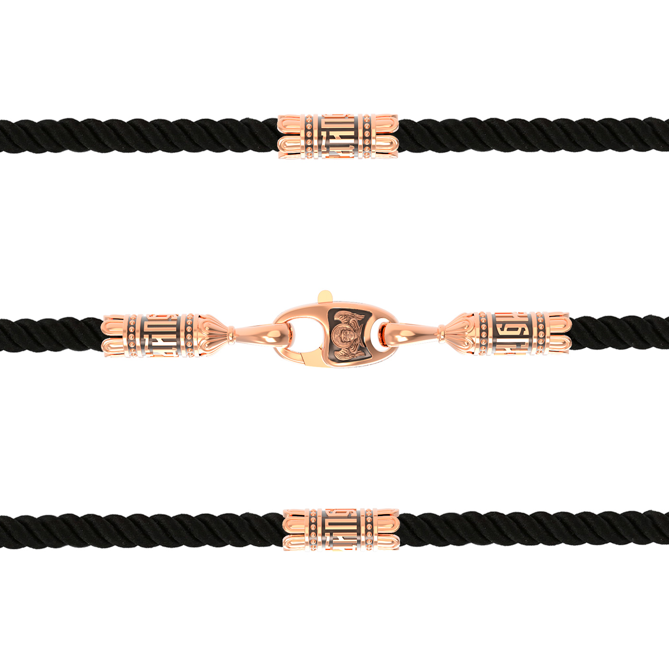 На шнурке цепи-шнурка расположены вставки, а на концах концевики с надписью: «Спаси и сохрани». Соединяет концевики замочек-карабин в форме рыбки. На замочке изображен шестикрылый Серафим.