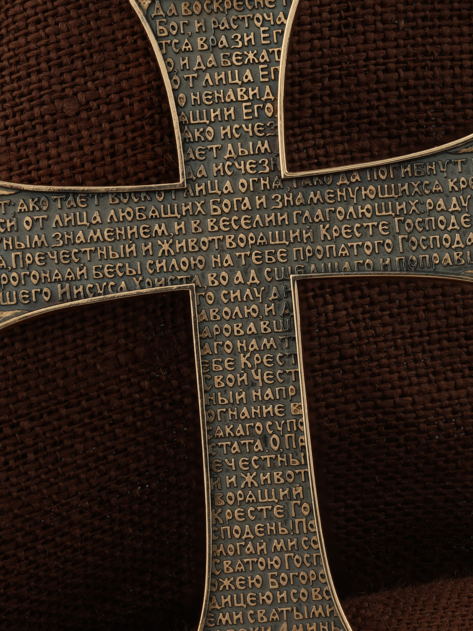 На оборотной стороне креста размещена молитва Честному и Животворящему Кресту Господню: «Да воскреснет Бог, и расточатся врази Его, и да бежат от лица Его ненавидящии Его. Яко исчезает дым, да исчезнут; яко тает воск от лица огня, тако да погибнут беси от лица любящих Бога и знаменующихся крестным знамением, и в веселии глаголющих: радуйся, Пречестный и Животворящий Кресте Господень, прогоняяй бесы силою на тебе пропятаго Господа нашего Иисуса Христа, во ад сшедшаго и поправшаго силу диаволю, и даровавшаго нам тебе Крест Свой Честный на прогнание всякаго супостата. О, Пречестный и Животворящий Кресте Господень! Помогай ми со Святою Госпожею Девою Богородицею и со всеми святыми во веки. Аминь».