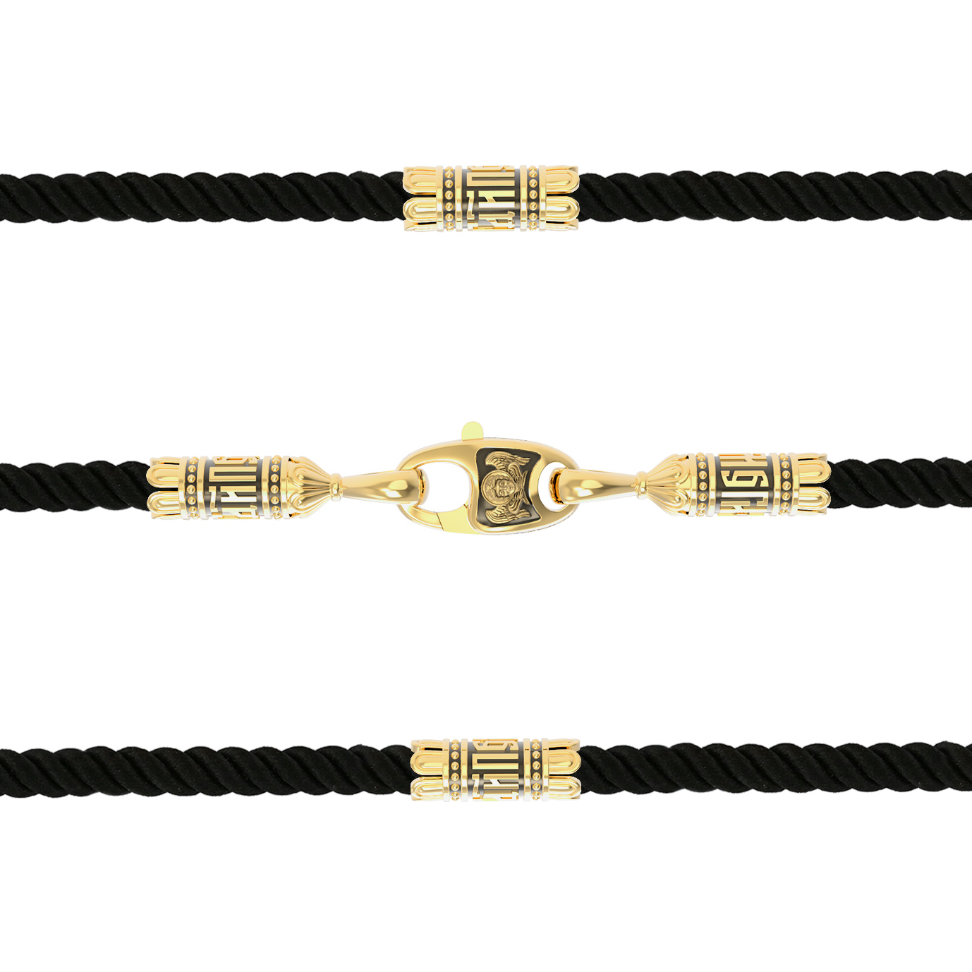 На шнурке цепи-шнурка расположены вставки, а на концах концевики с надписью: «Спаси и сохрани». Соединяет концевики замочек-карабин в форме рыбки. На замочке изображен шестикрылый Серафим.