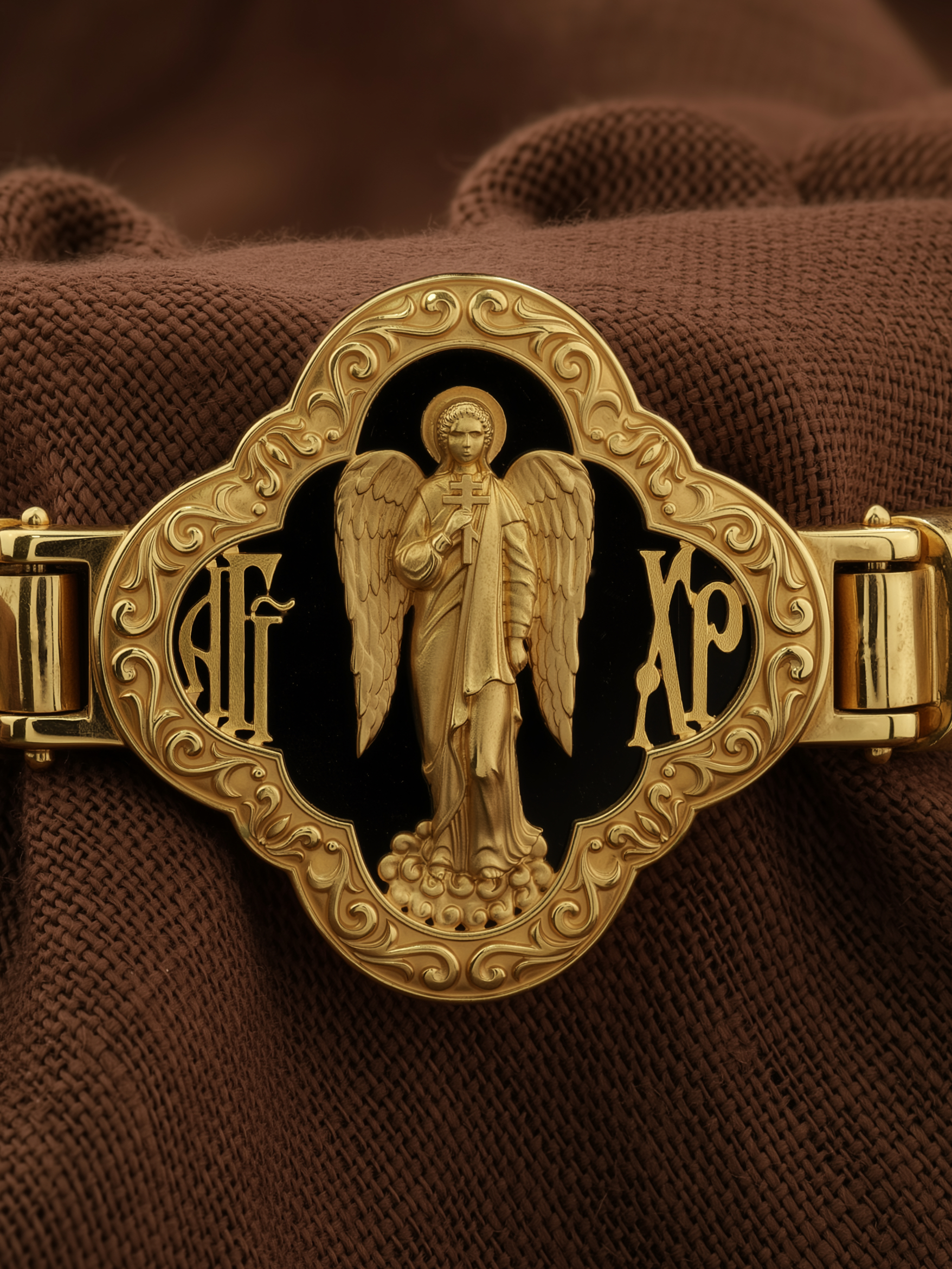 На лицевой стороне основного звена изображён Святой Ангел-Хранитель. Ангел Хранитель — это Ангел приставляемый Богом к человеку при крещении для охраны и помощи в добрых делах. Он невидимо находится при человеке на протяжении всей его жизни, если человек сохраняет в себе любовь к Богу и истинную веру перед Ним. Ангел-Xранитель делают для нас все, что служит к истинному нашему благу и спасению. Невидимо пребывая при нас постоянно, он, руководствуя нас ко спасению, не только по нашему желанию таинственно наставляет нас на все доброе и полезное, не только возносит наши молитвы к Богу, но еще и сам от себя охраняют и защищают нас от врагов видимых и невидимых и ходатайствует за нас пред Богом. Ангел-Хранитель так любит нас, как никто на земле любить не может. Ангел-Хранитель — присный друг наш, незримый тихий собеседник, пресладостный утешитель. Одного лишь каждому из нас он желает — спасения души; к этому он направляет все свои заботы. И если видит нас также заботящимися о спасении, радуется, если же видит нас пребывающими в нерадении о душе своей, скорбит.