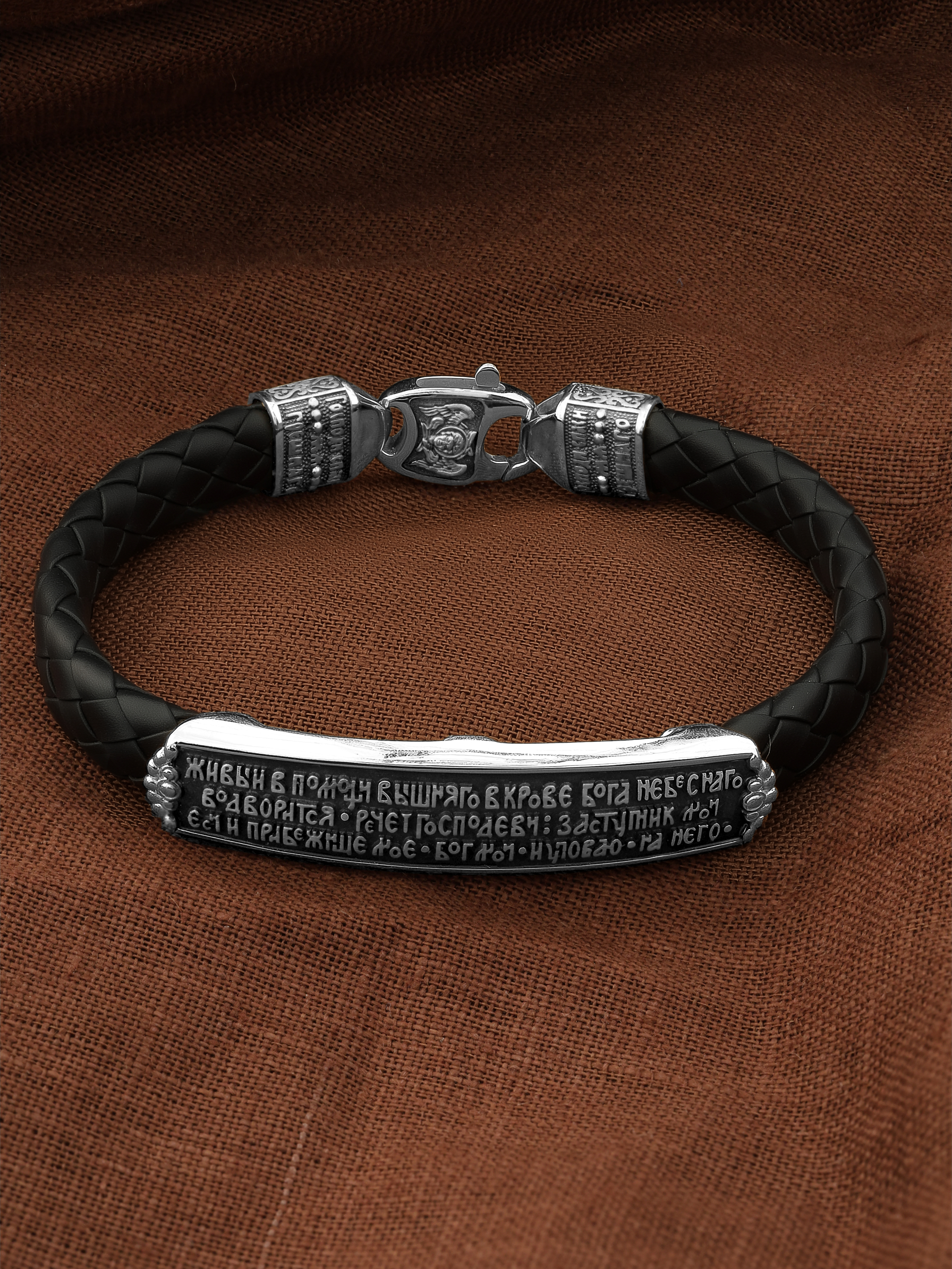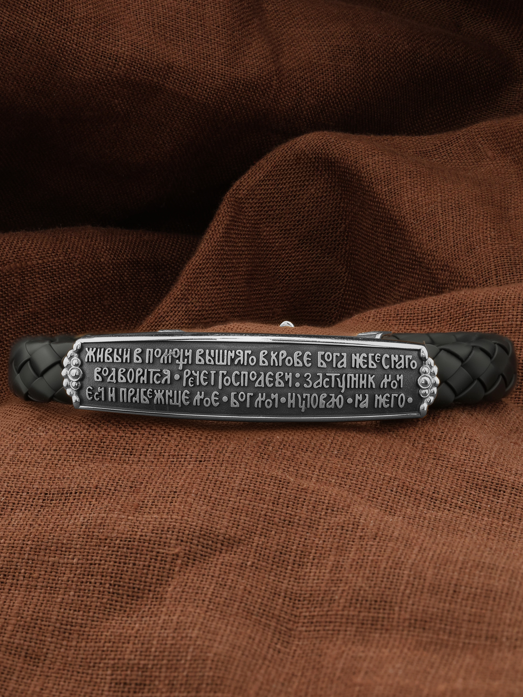 На основном звене браслета написана молитва: «Живый в помощи Вышняго, в крове Бога Небеснаго водворится. Речет Господеви: Заступник мой еси и Прибежище мое, Бог мой, и уповаю на Него.»