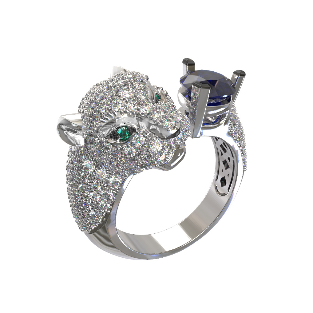 Кольцо из белого золота c бриллиантами, сапфиром и изумрудом