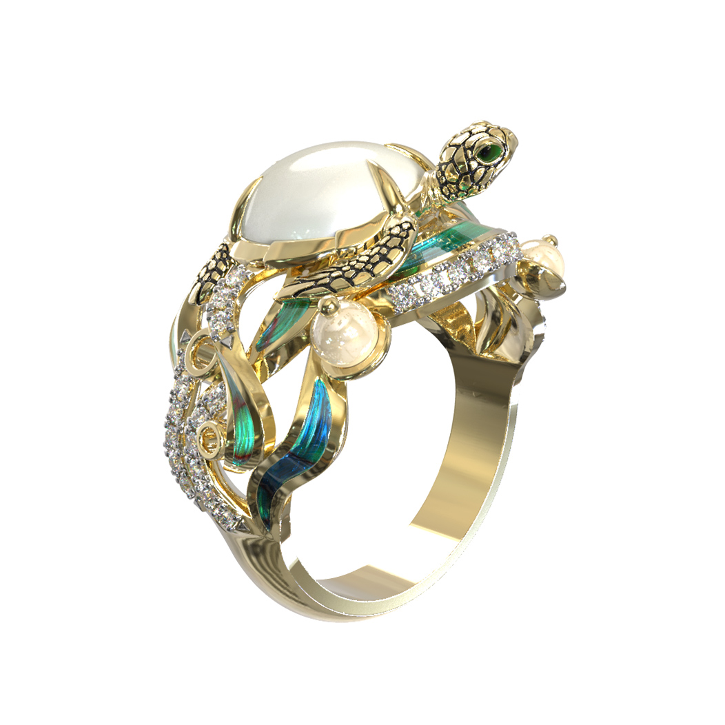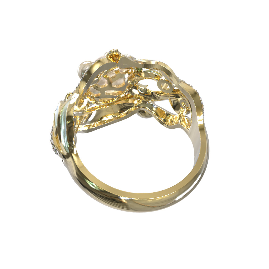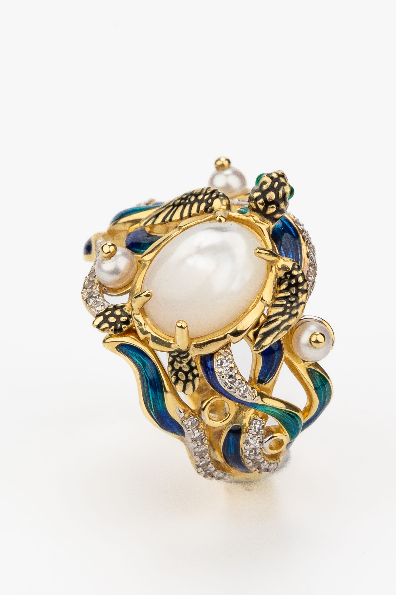Кольцо из лимонного золота c эмалью, бриллиантами, жемчугом и перламутром