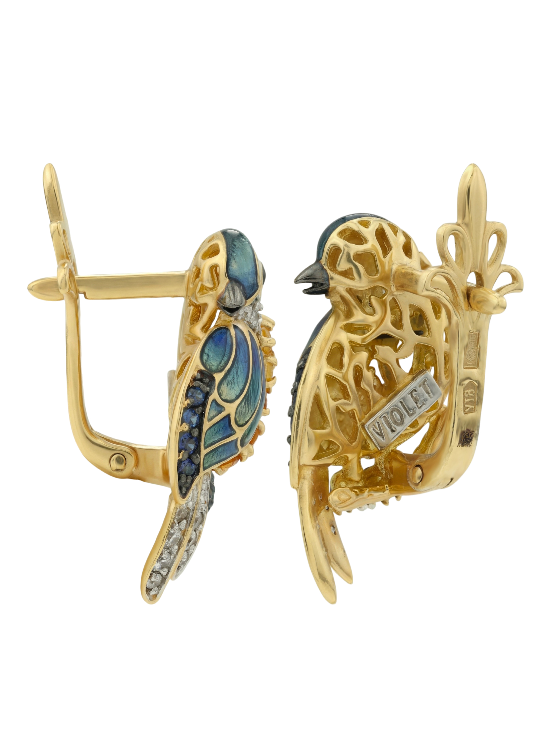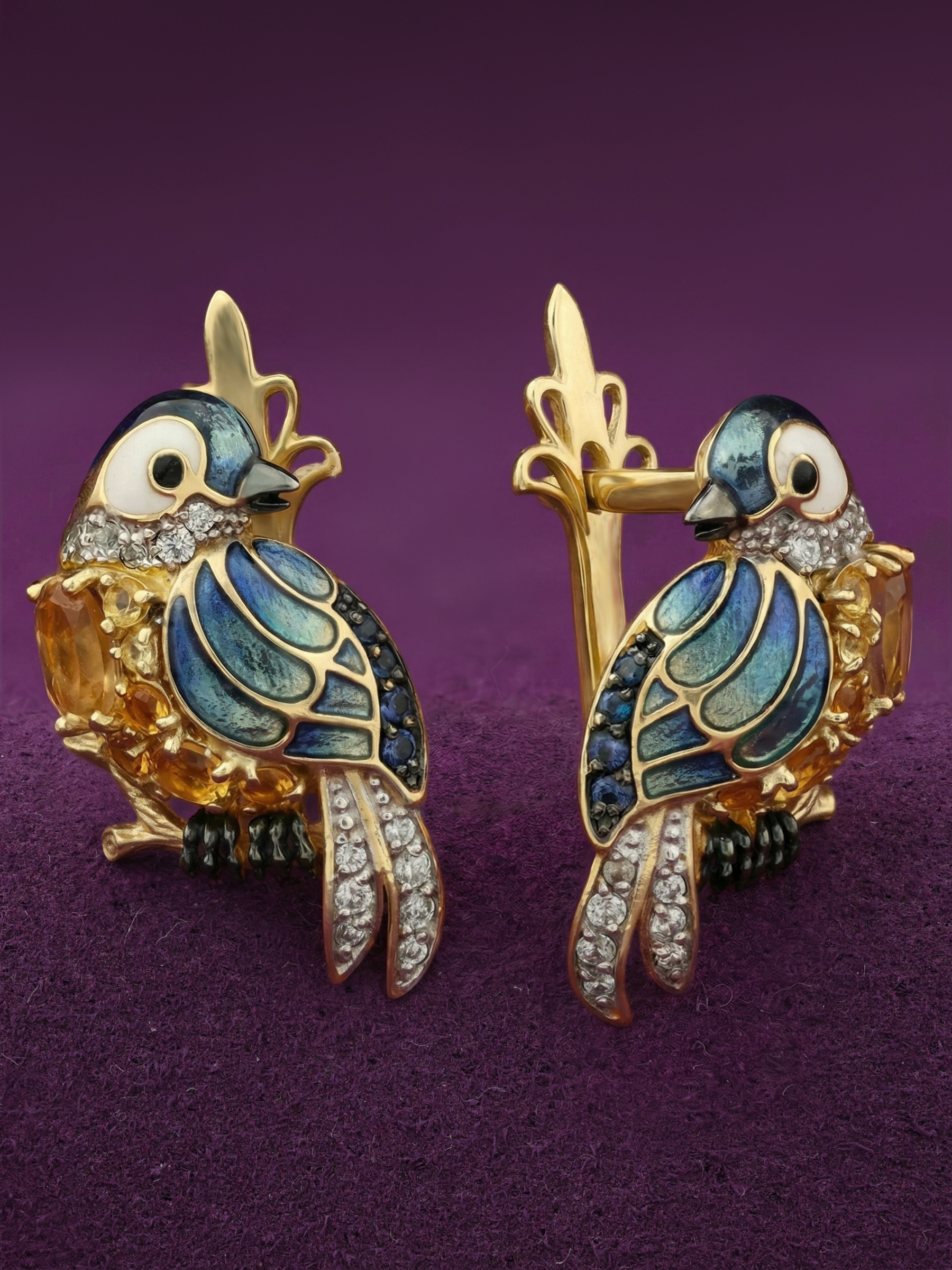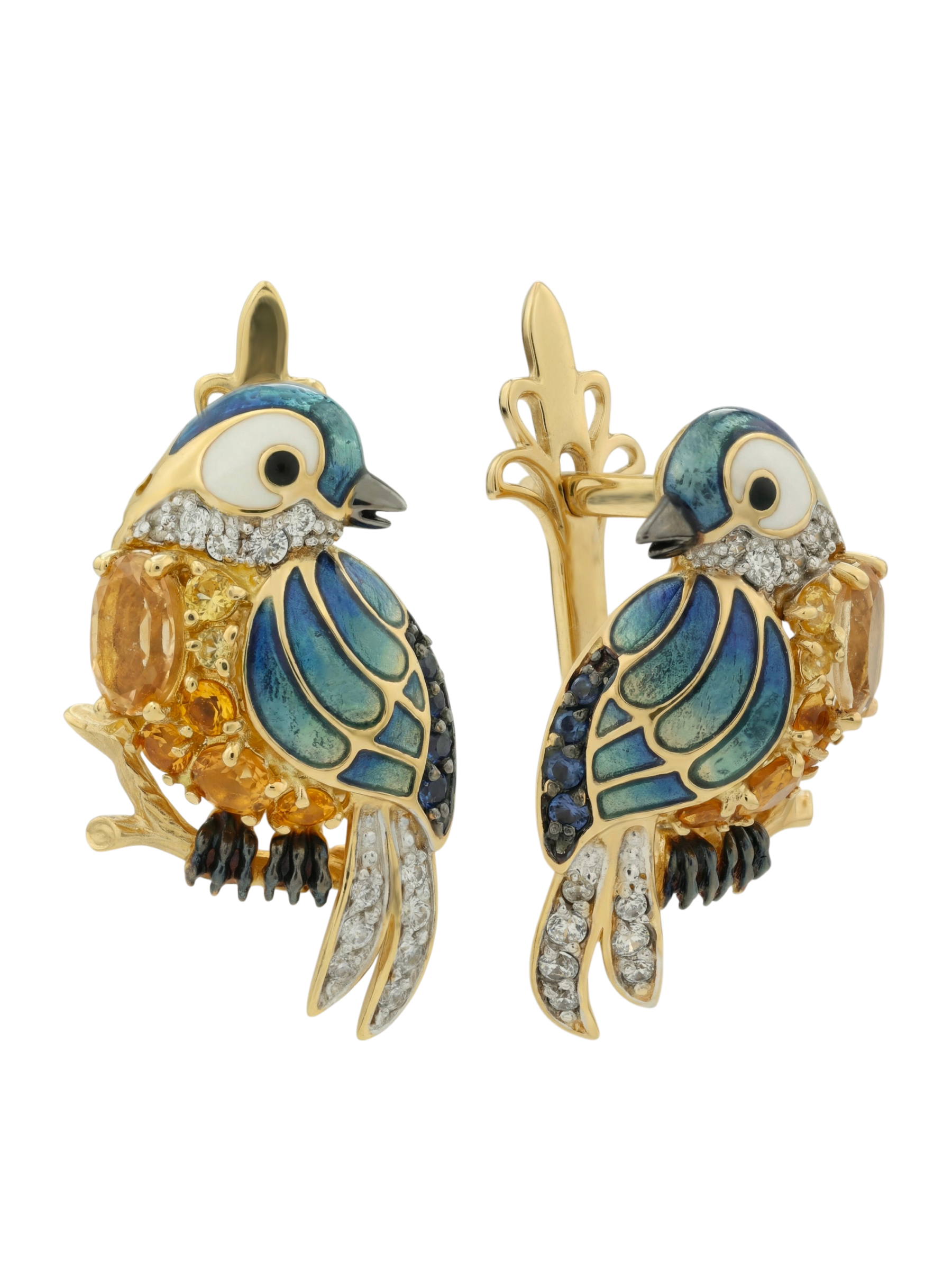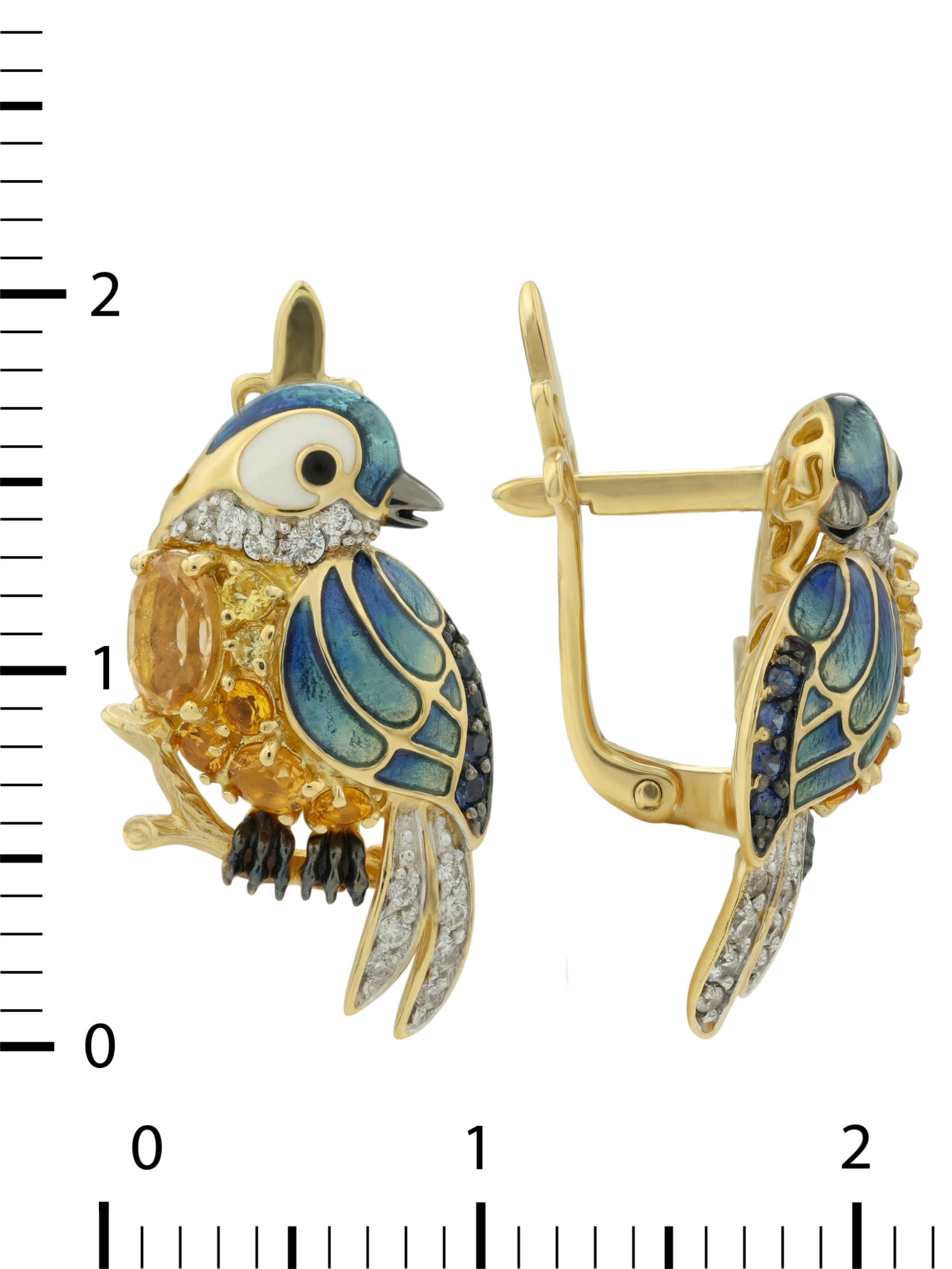 Серьги из лимонного золота c эмалью, фианитом, цитрином и сапфиром