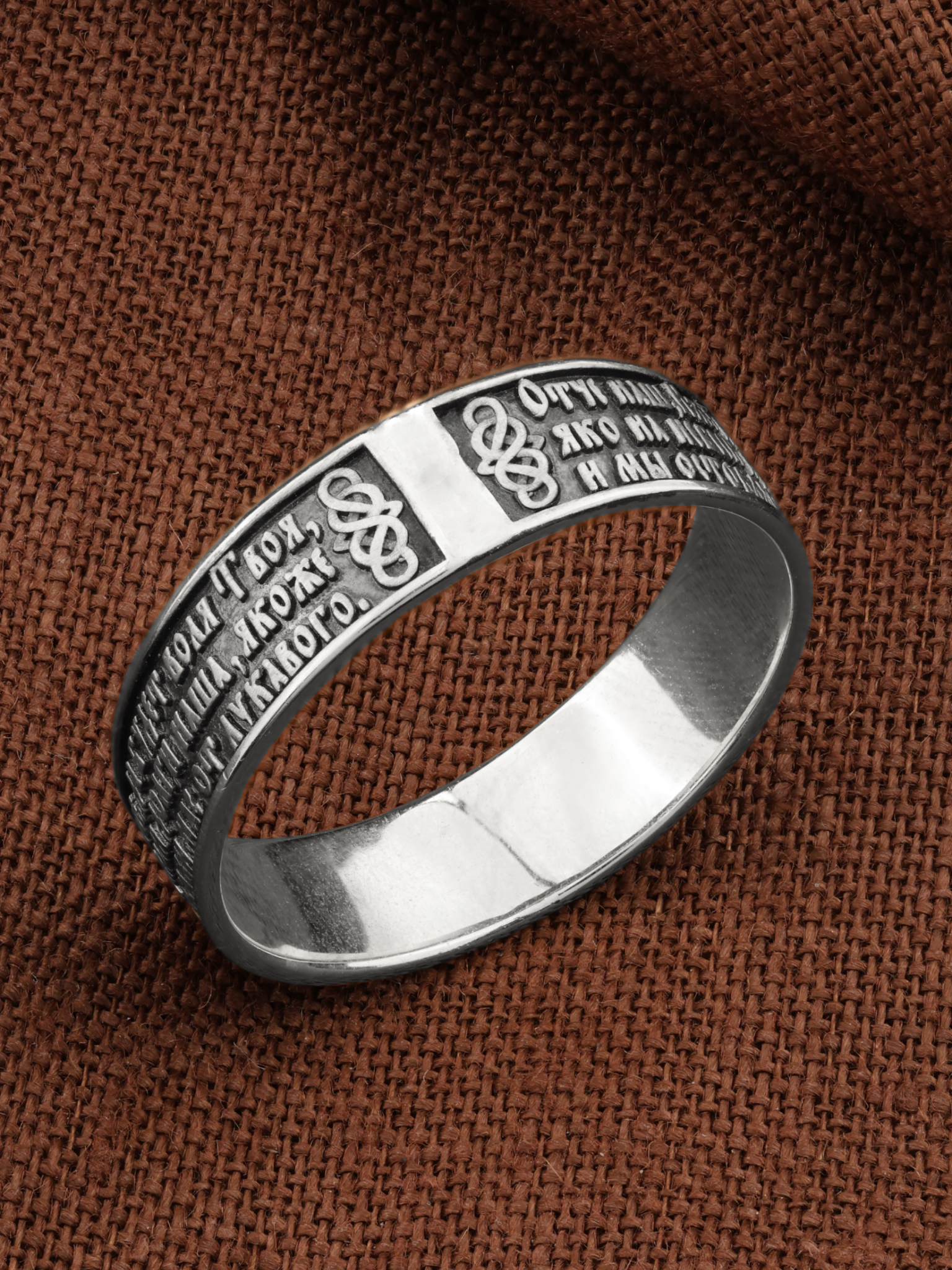 На лицевой стороне кольца отображена Божественная молитва к Богу Отцу, которую, Господь Иисус Христос дал своим ученикам. Молитва Господня приводится в Евангелиях в двух вариантах, более пространном в Евангелии от Матфея и кратком — в Евангелии от Луки. Различны и обстоятельства при которых Христос произносит текст молитвы. В Евангелии от Матфея «Отче наш» входит в состав Нагорной проповеди. Евангелист Лука пишет, что апостолы обратились к Спасителю: «Господи! Научи нас молиться, как и Иоанн научил учеников своих » (Лк. 11, 1). «Отче наш, Иже еси на небесе? х! Да святится имя Твое, да прии? дет Царствие Твое, да будет воля Твоя, яко на небеси? и на земли?. Хлеб наш насущный да? ждь нам дне? сь; и оста? ви нам до? лги наша, якоже и мы оставляем должнико? м нашим; и не введи нас во искушение, но изба? ви нас от лукаваго.»