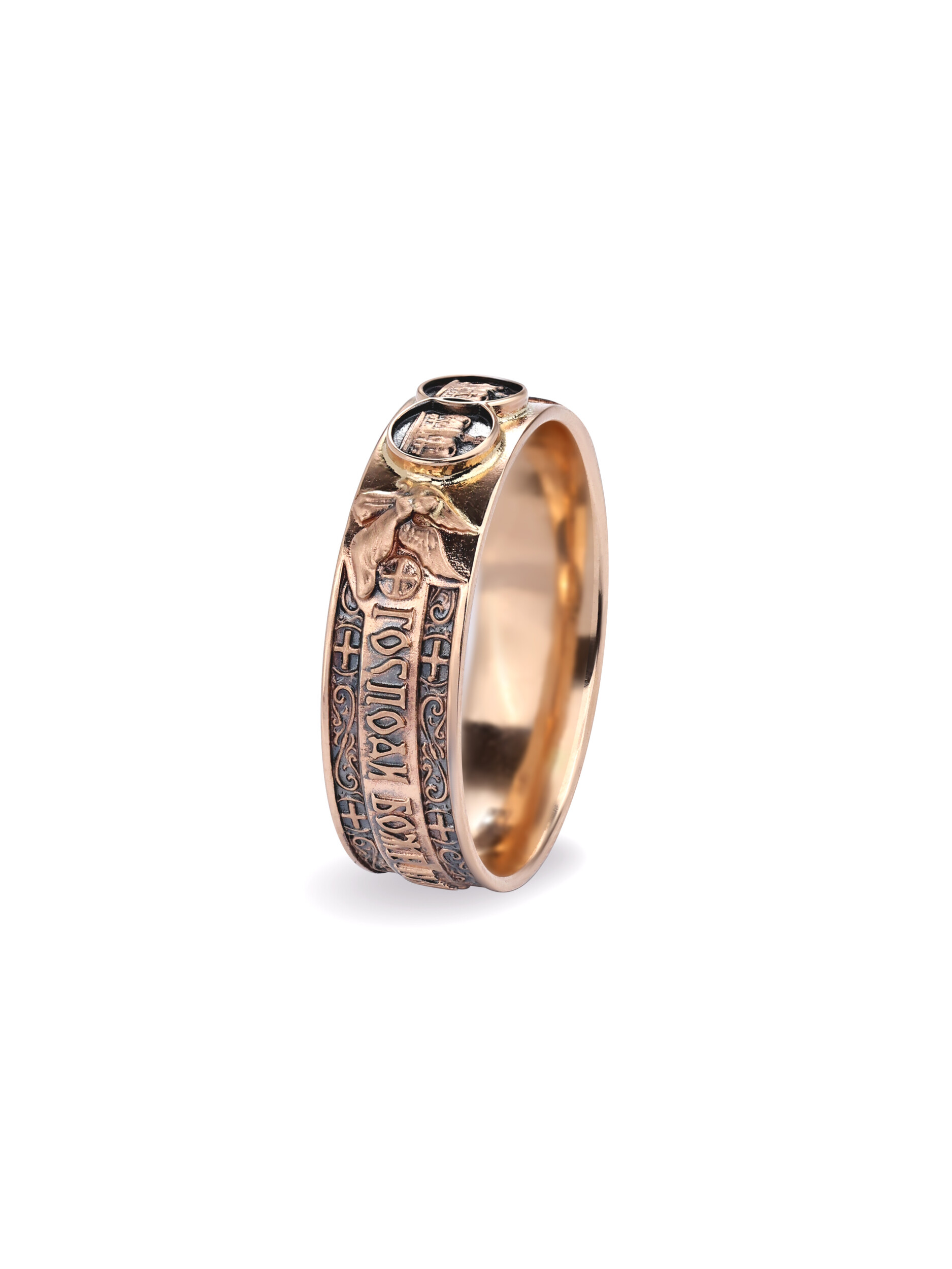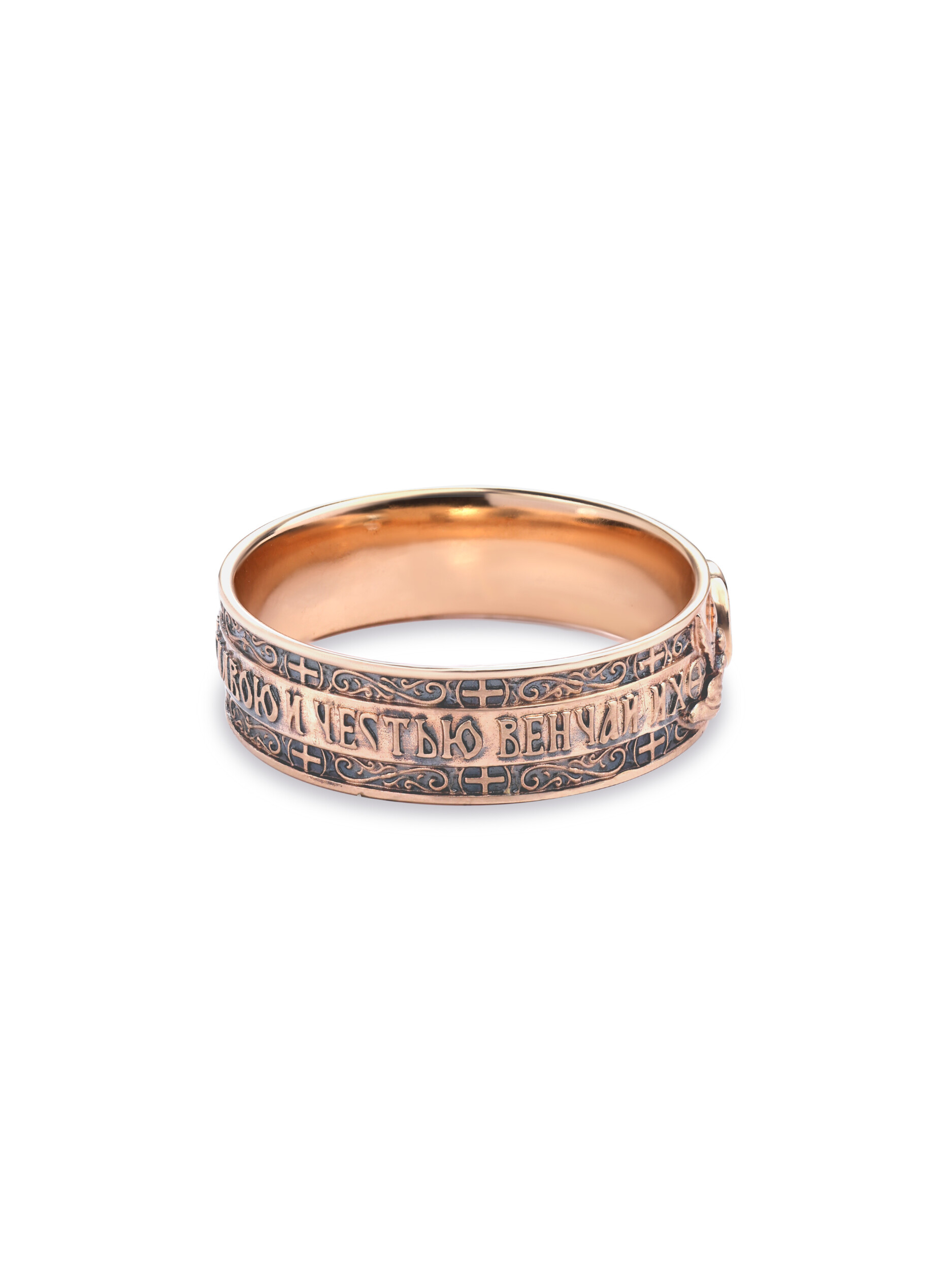 На лицевой стороне между Херувимов в кругах, символизирующих обручальные кольца, изображены венчальные венцы, и по кольцу написана молитва «Господи Боже Наш славою и честью венчай их»