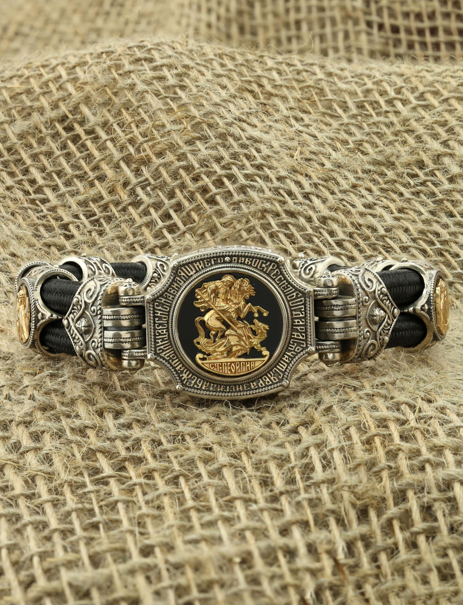 Браслет из серебра и золота c ониксом и шёлковым шнурком