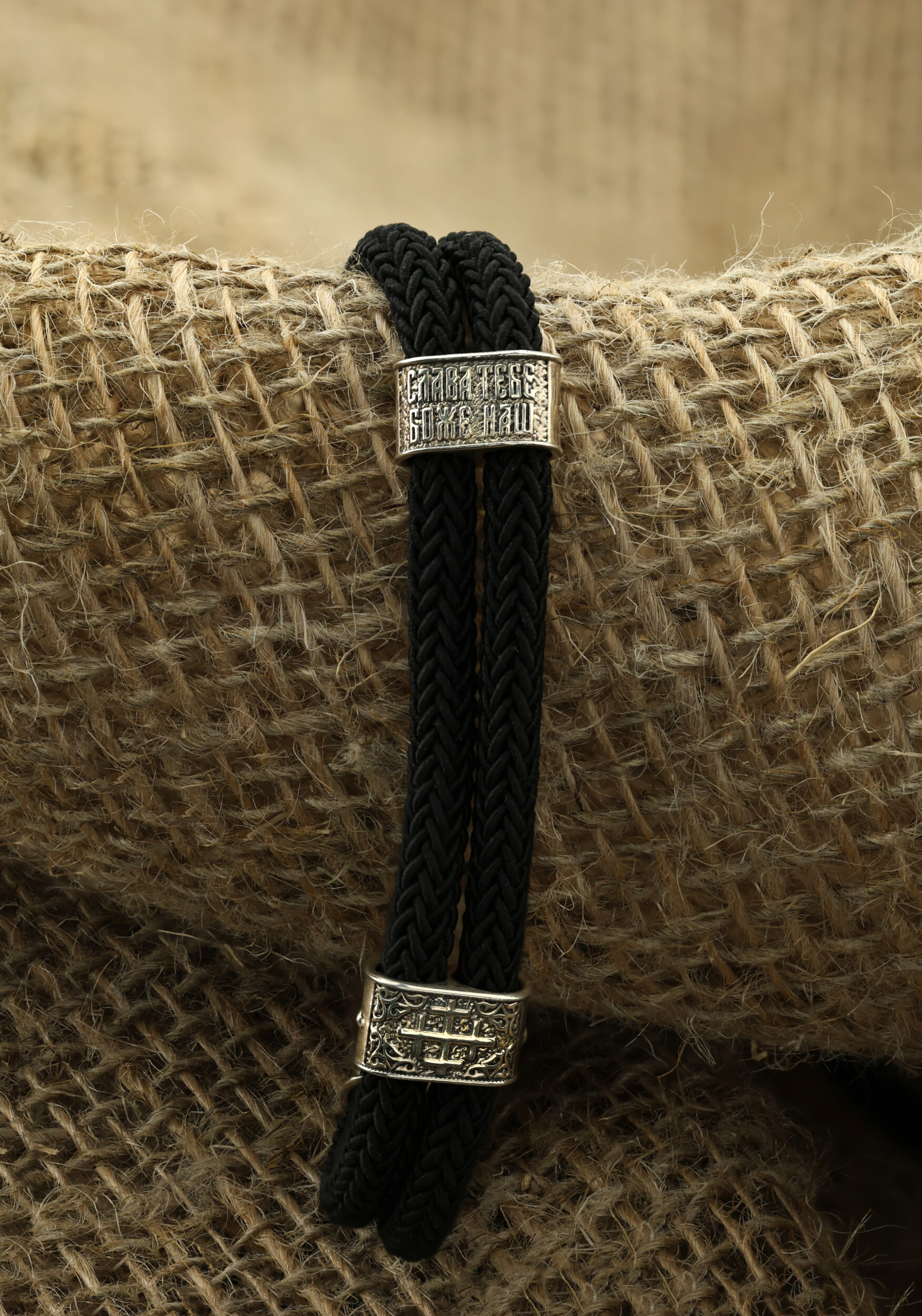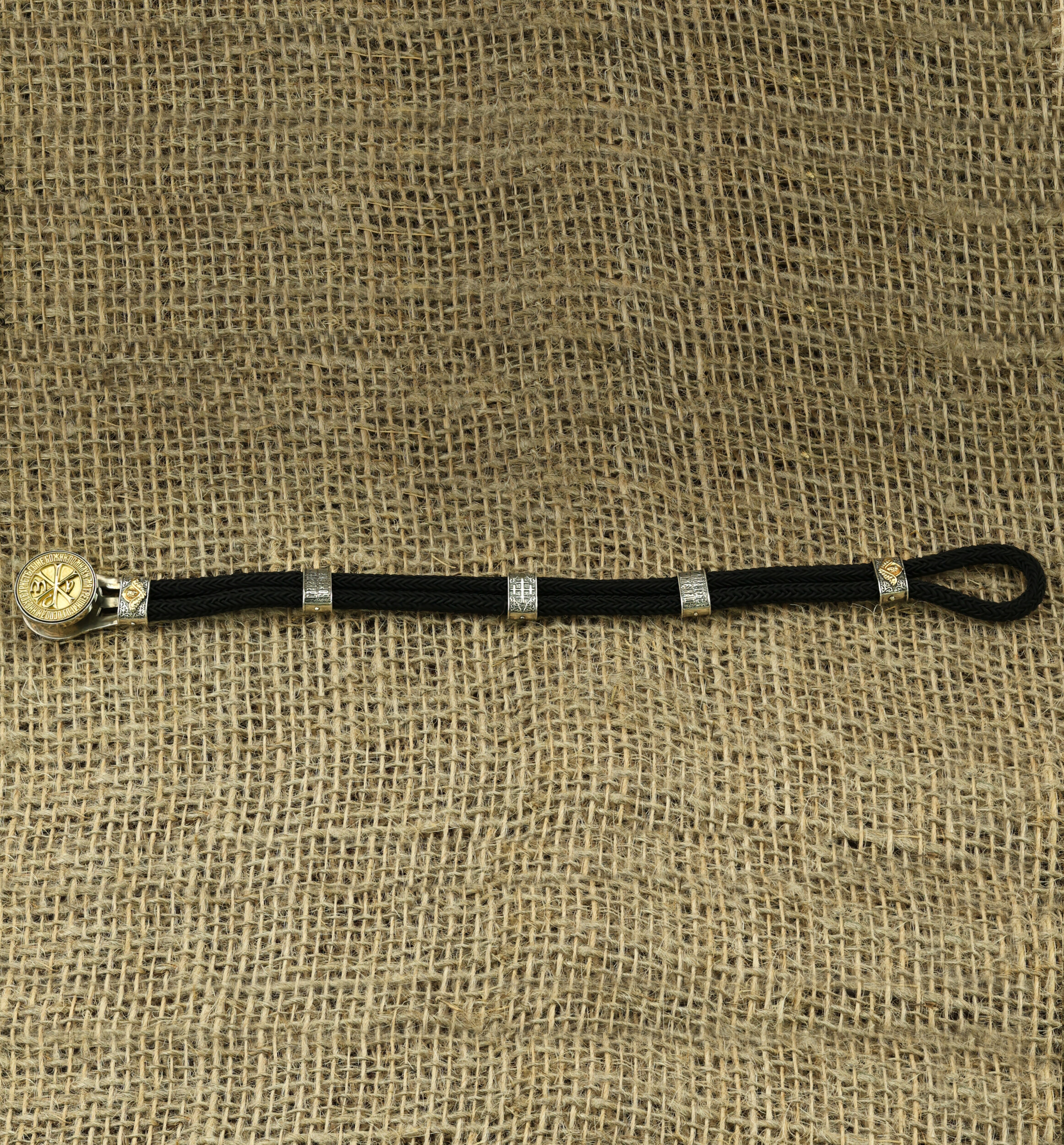Именно монограмму Спасителя увидел Константин Великий перед битвой и был настолько воодушевлен, что отдал приказ поместить Хризму на все свои штандарты. После чего одержал победу. С тех самых пор каждый верующий чувствует на себе ее силу. Она состоит из двух букв —Х («хи») и Р («ро»). По краям монограммы мы видим буквы «альфа» и «омега». Они также символизируют Христа, отсылая нас к к тексту Откровения: «Аз есмь Альфа и Омега, начало и конец, говорит Господь, Который есть и был и грядет, Вседержитель» (Откр 1:8). По контуру размещены слова Иисусовой молитвы: «Господи, Иисусе Христе, Сыне Божий, помилуй мя, грешнаго». Также браслет украшен двумя вставками с изображением Херувимов, вставкой с изображением Креста и двумя вставками с молитвой: «Слава тебе, Боже наш».