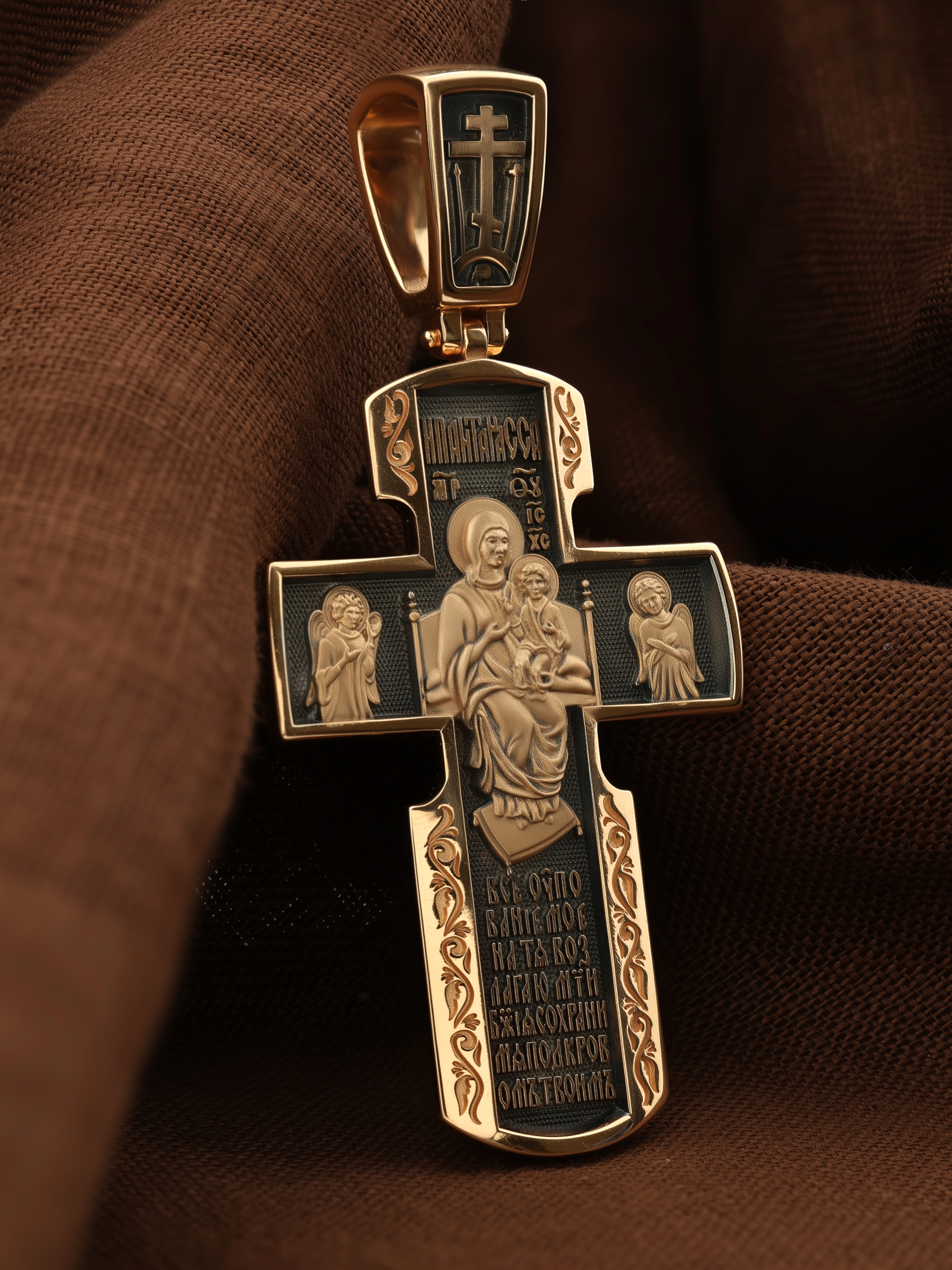 Внизу креста написана молитва обращенная к Божией Матери «Все упование мое на Тя возлагаю, Мати Божия, сохрани мя под кровом Твоим».