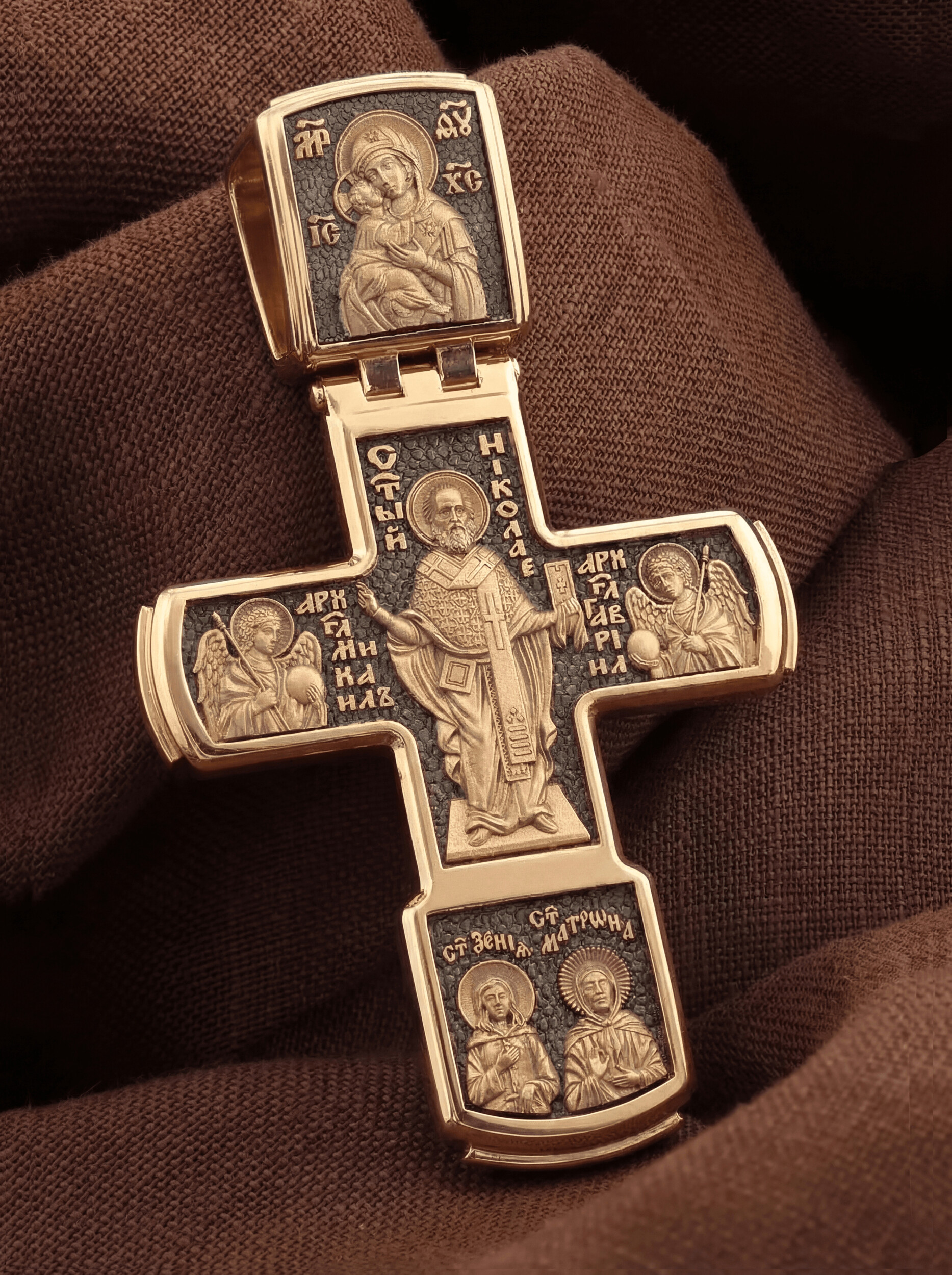 В центре на обороте — самый почитаемый в Православной Церкви святой, Николай Чудотворец, которого еще называют Николай Угодник за то, что он угодил своей жизнью Богу. Ему молятся, отправляясь в путешествие, особенно по морю, просят исцеления в различных недугах, помощи в торговых делах, учебе и поисках достойного супруга. С двух сторон от Николая Чудотворца помещены образы архангелов Михаила и Гавриила. Вверху — Владимирская икона Божией Матери — самая великая русская святыня, многие века бывшая олицетворением нашей земли. Перед ней венчались на царство государи, избирались патриархи. Пречистой Богородице Владимирской клялись в верности Отечеству солдаты и за нее умирали на поле брани. Именно на ее защиту более всего уповала Россия в самые страшные периоды своей истории. В нижнем клейме — иконы двух святых помощниц от всех недугов, блаженных Ксении Петербургской и Матроны Московской.