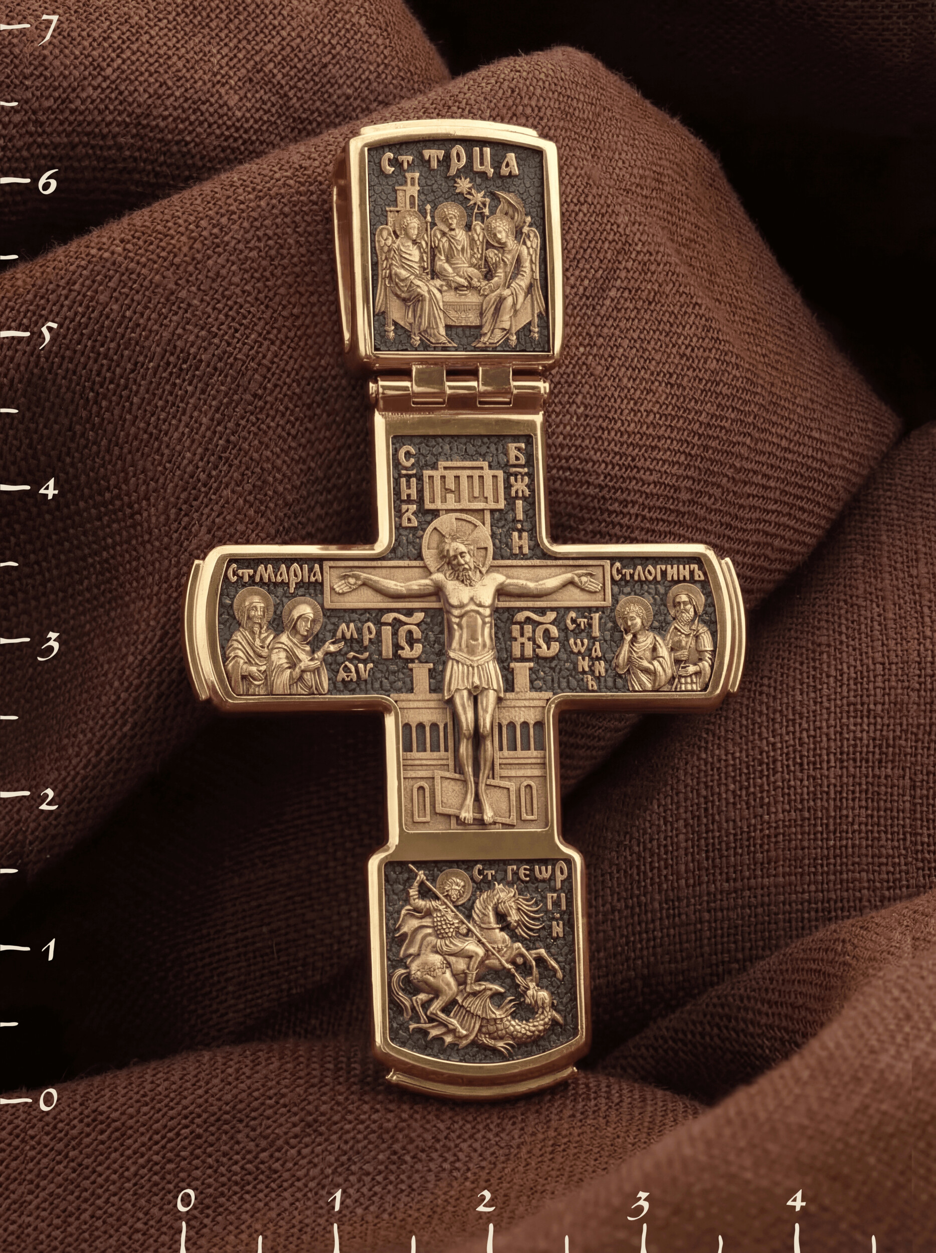 На кресте изображено Распятие Господа нашего Иисуса Христа. Ему предстоят Святая Мария Магдалина, Пресвятая Богородица, апостол Иоанн и Святой Иосиф, свидетели крестных страданий Господа. Вверху — икона Святой Троицы, на которой запечатлено явление Триединого Бога праотцу Аврааму в виде трех ангелов. В нижнем клейме изображено Чудо Святого Георгия о змие. Великомученик Георгий почитается как покровитель воинов, защитник от злых сил, помощник в духовной борьбе.