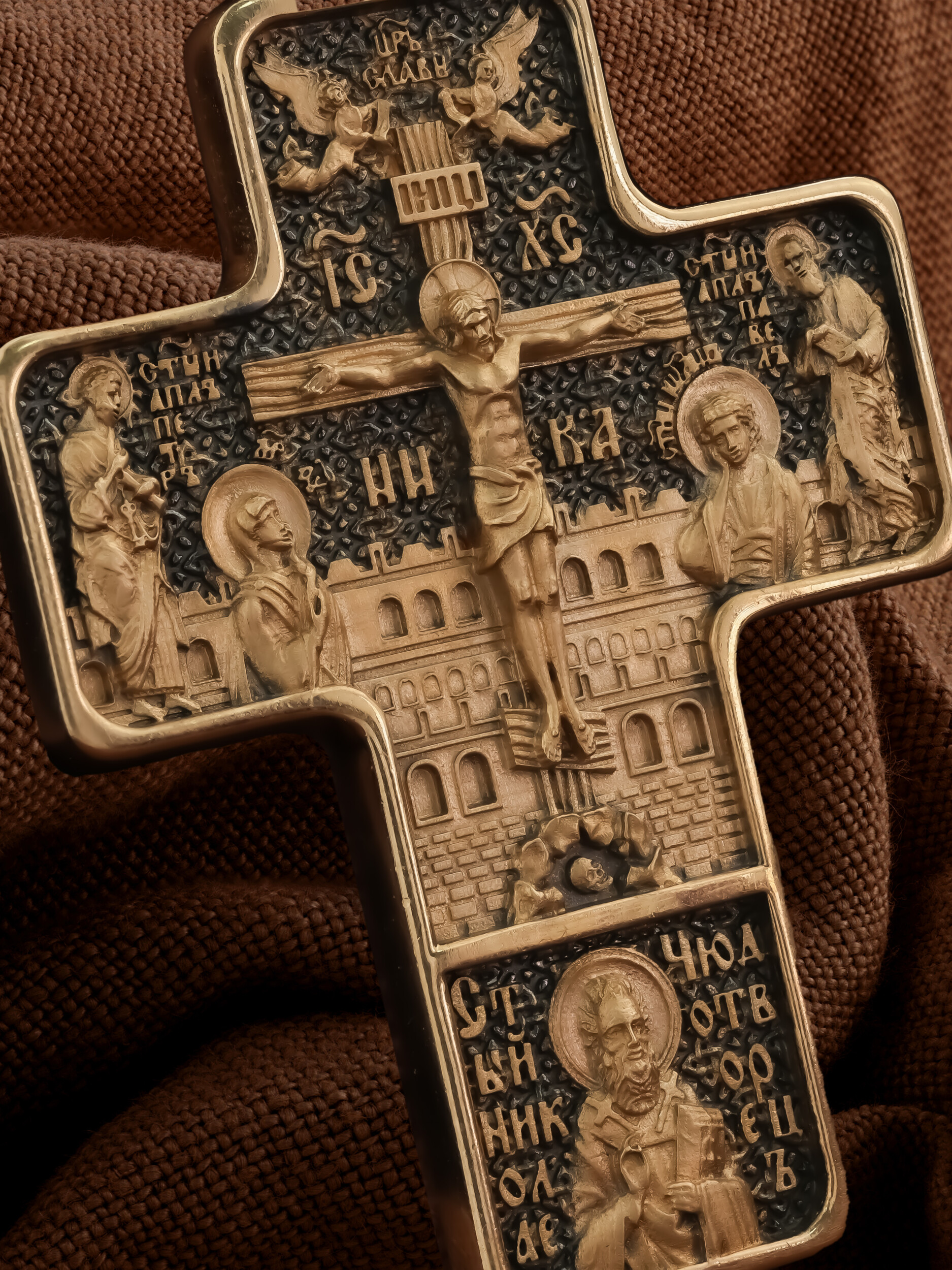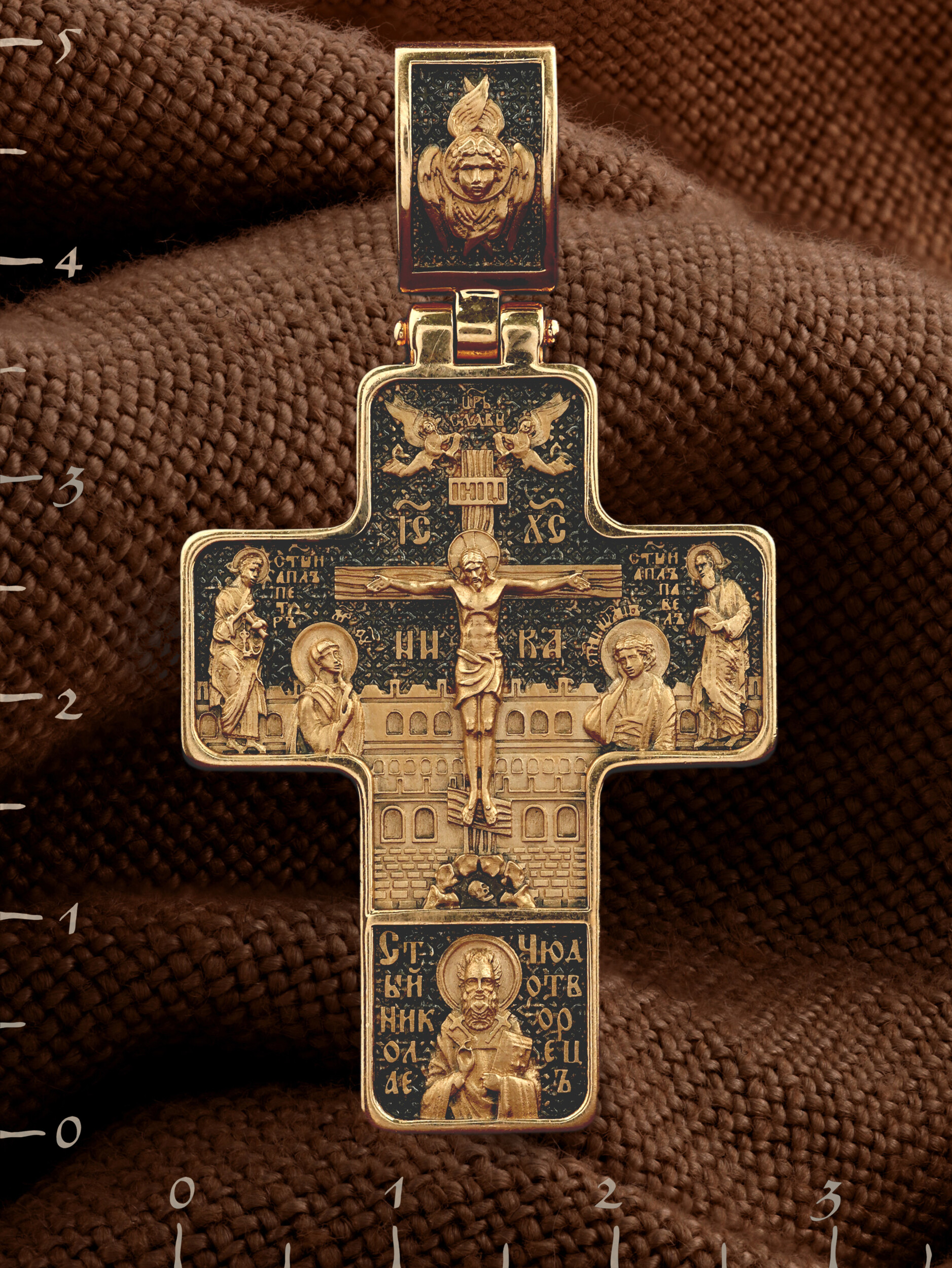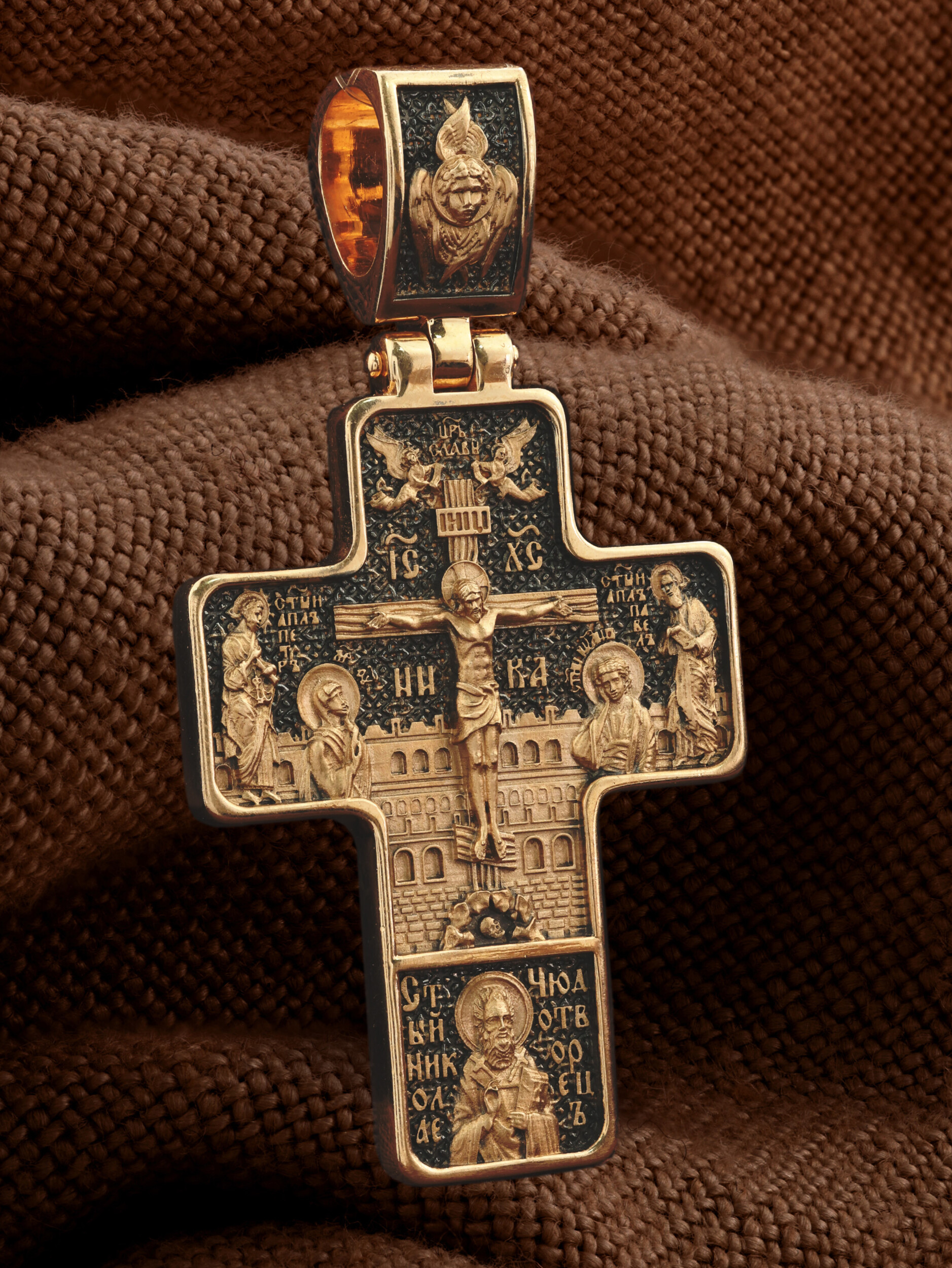 На лицевой стороне креста изображено Распятие Господа и Спасителя нашего Иисуса Христа, отдавшего Себя на смерть, для искупления грехов мира. Крест является символом жертвенной любви всеблагого Бога к падшим людям, всепобеждающим духовным оружием христиан, основанием и средоточием церковной жизни. Верхняя перекладина символизирует титло — табличку, на которой, согласно Евангелию, было начертано: Иисус Назорей Царь Иудейский (IНЦI). Распятие сопровождается надписями, олицетворяющими Христа. Надпись «IС» « ХС», что означает Иисус Христос, находится над поперечной перекладиной креста. Ниже помещено слово «НИКА», что означает «победитель». Над вершиной Распятия помещена надпись «Царь Славы» и изображены парящие ангелы со свитками в руках. Слева от Распятия изображена Пресвятая Богородица, справа — апостол и евангелист Иоанн Богослов, один из ближайших учеников Иисуса Христа.. По обеим сторонам от Распятия помещены образы святых Первоверховных Апостолов — Петра и Павла. За крестом высится Иерусалимская стена, в знак того, что Господь был распят вне стен города. Возвышение, на котором стоит Крест, символизирует гору Голгофу, на которой произошло Распятие. Под подножием Креста изображена покоящаяся голова (череп) Адама. Ниже Распятия помещен образ Святителя Николая архиепископа Мир Ликийских, Чудотвореца. На кулонном кольце изображен шестикрылый Серафим.