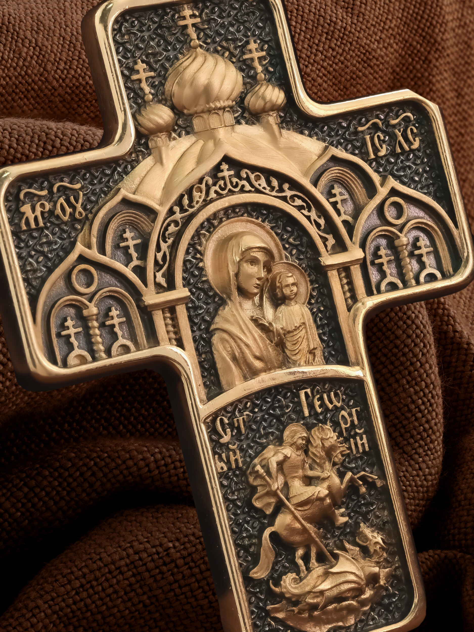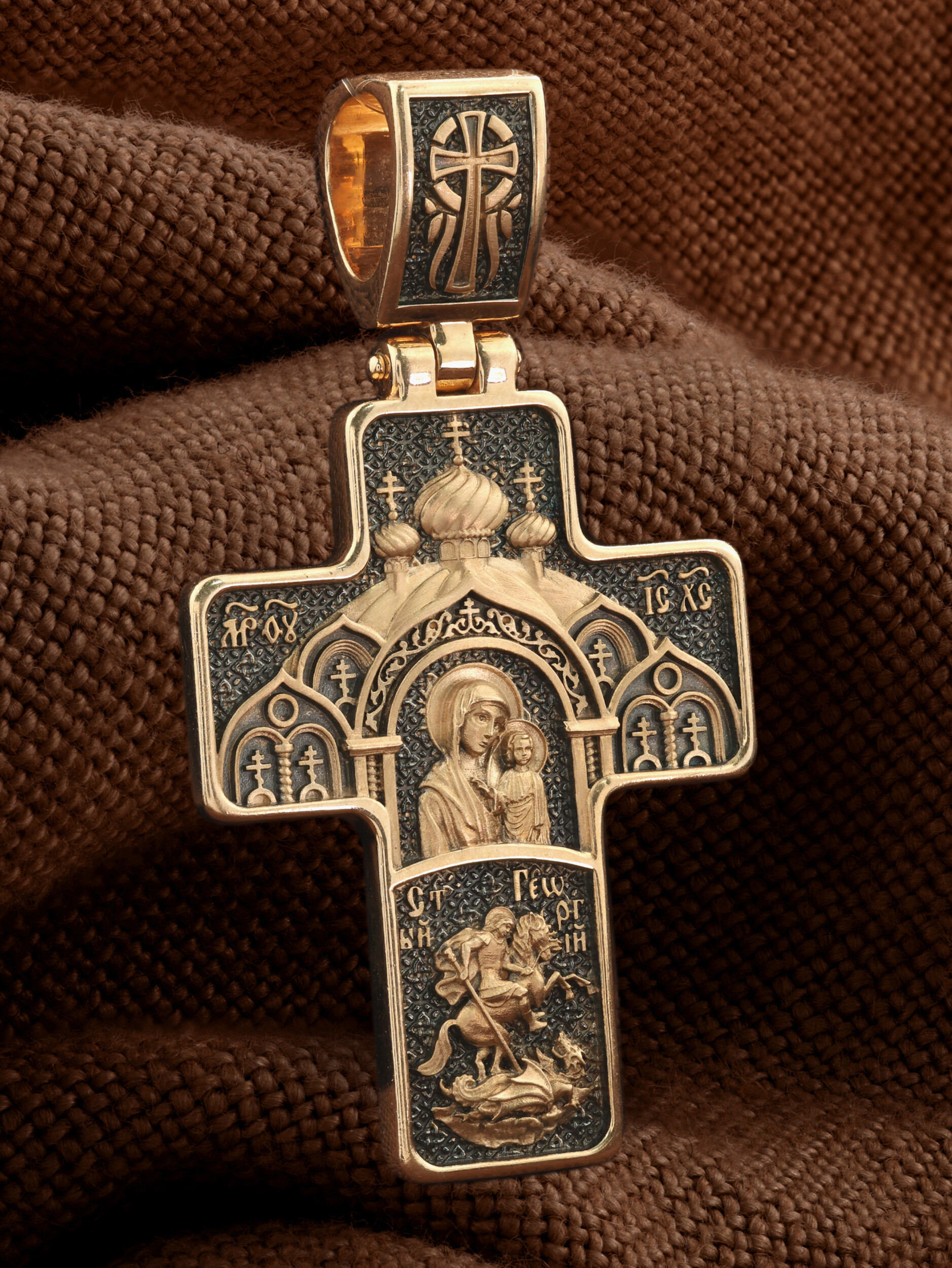 На центральной части оборотной стороны креста изображена Казанская икона Божией Матери в киоте. Она является одной из главных православных святынь на Руси. Ниже помещен образ Святого Великомученика Георгия Победоносца — одного из самых почитаемых и удивительных святых. На образке он изображен как воитель поражающий копьем огнедышащего змея. Змей символизирует собою сатанинские силы. На кулонном кольце помещен крест.