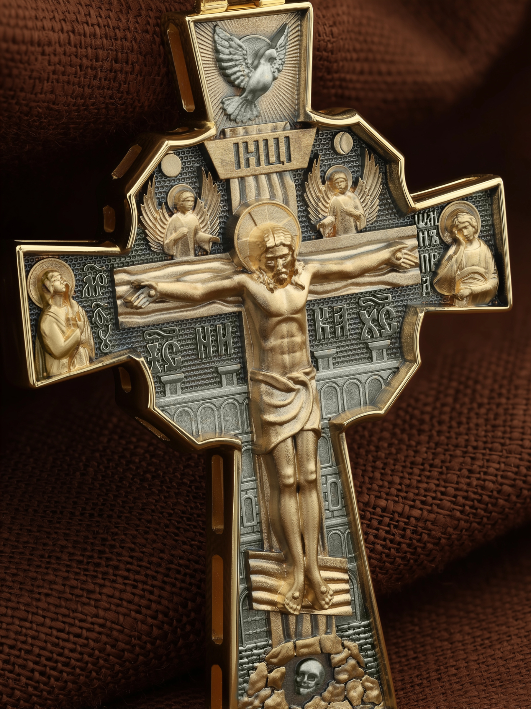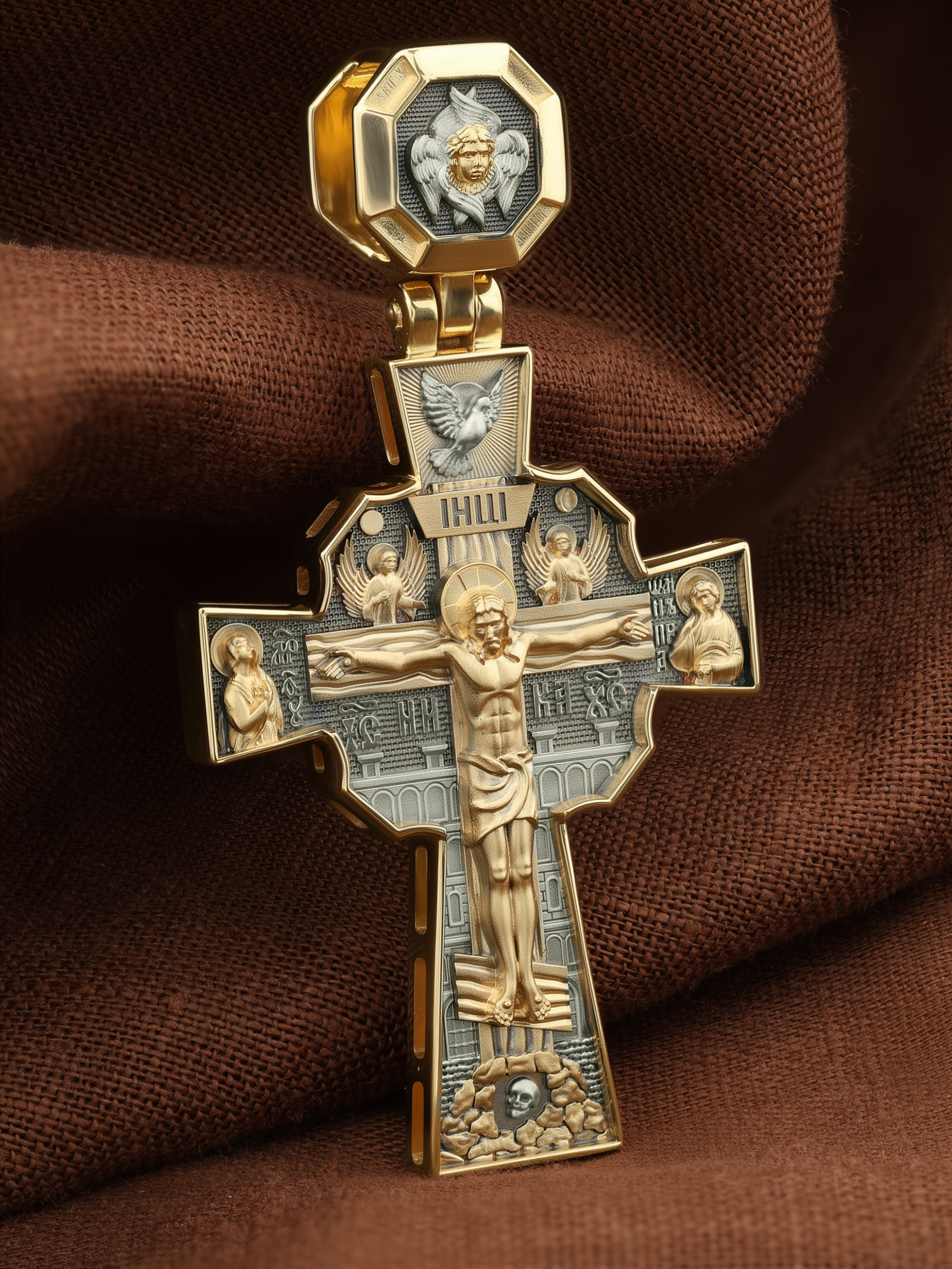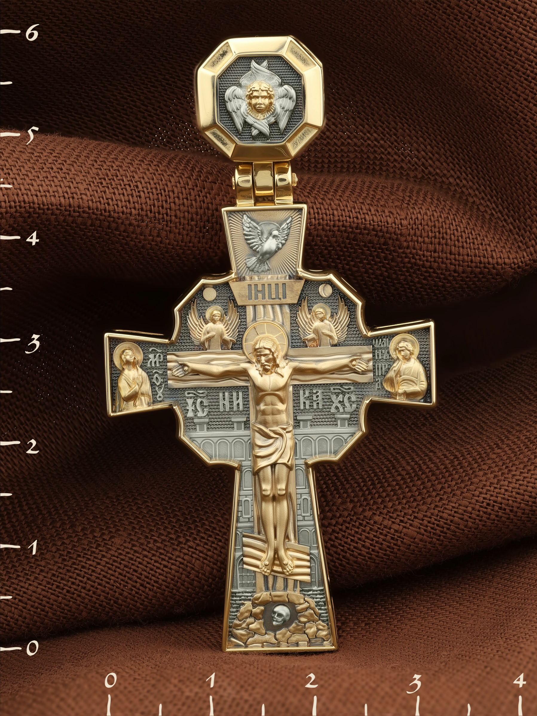 Над Распятием изображен парящий голубь — символ Святого Духа и Его благодати. На кулонном кольце изображен шестикрылый Серафим — самый приближенный к Господу Ангел.