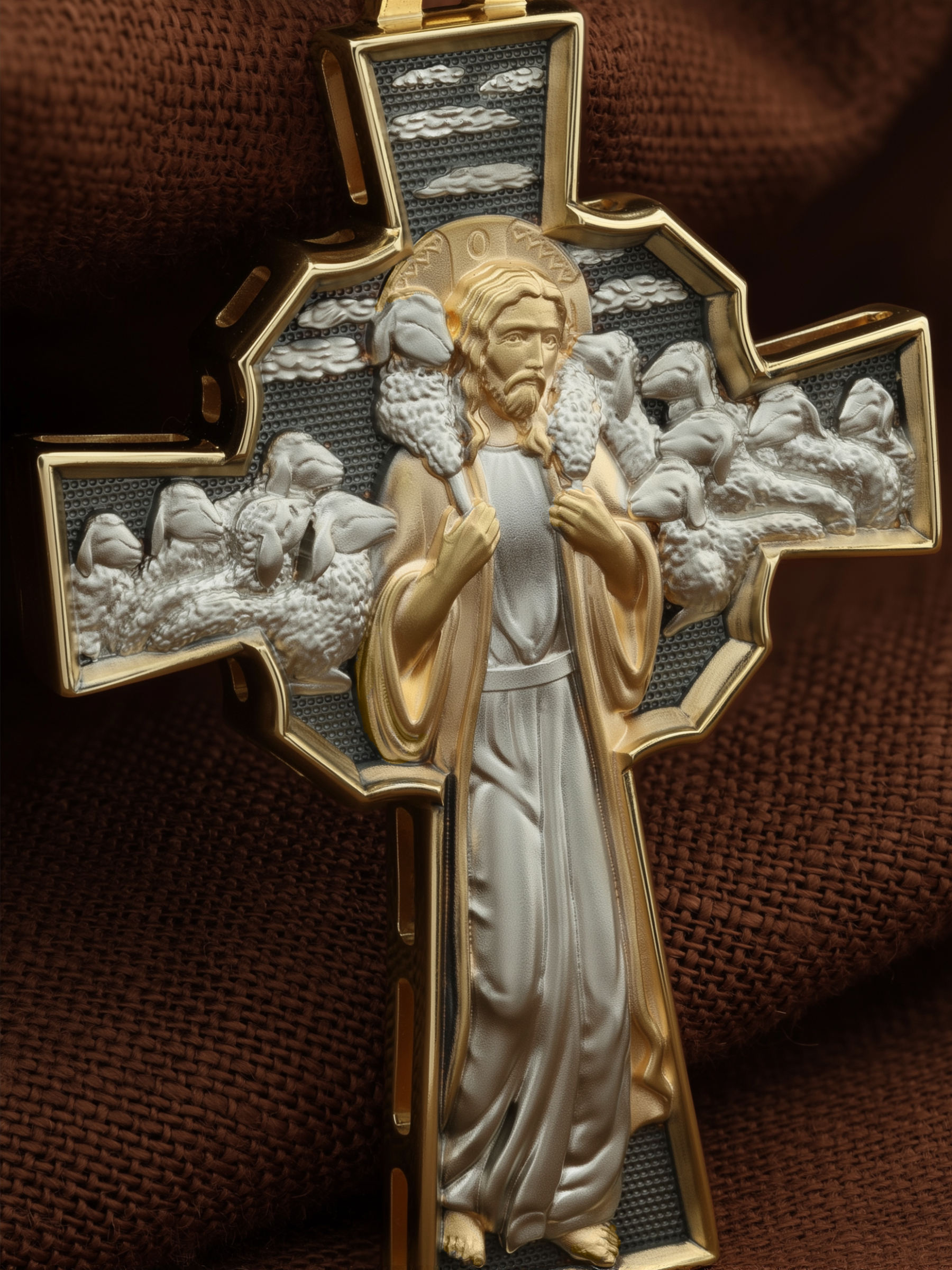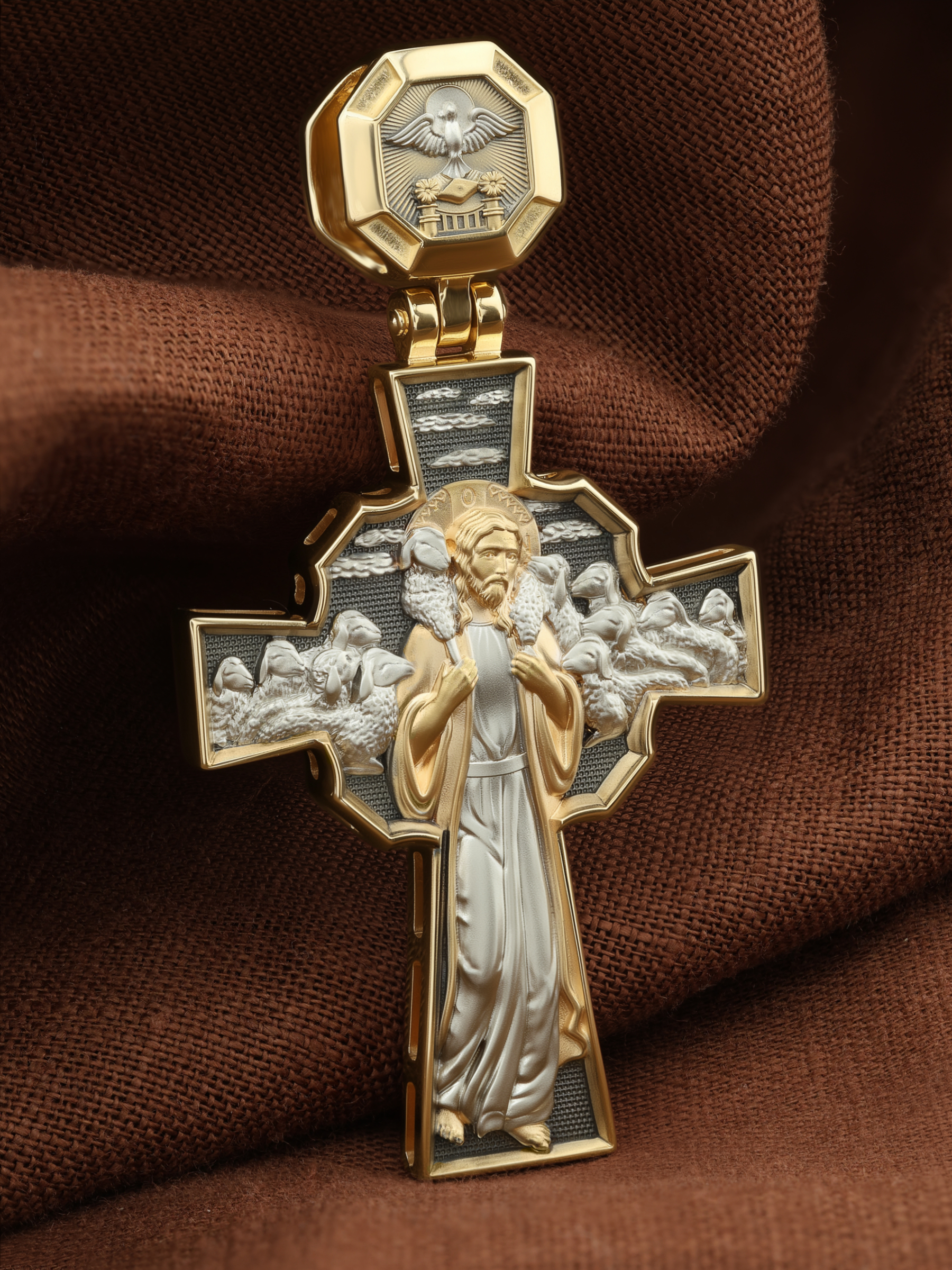 Но обратной стороне креста изображение Иисуса Христа. Добрый Пастырь — символическое именование и изображение Иисуса Христа, заимствованное из Ветхого Завета и повторенное Христом в Новом Завете в своей роли учителя. Иисус изображается с заблудшей овцой, вскинутой на плечи (Лк. 15:3−7).