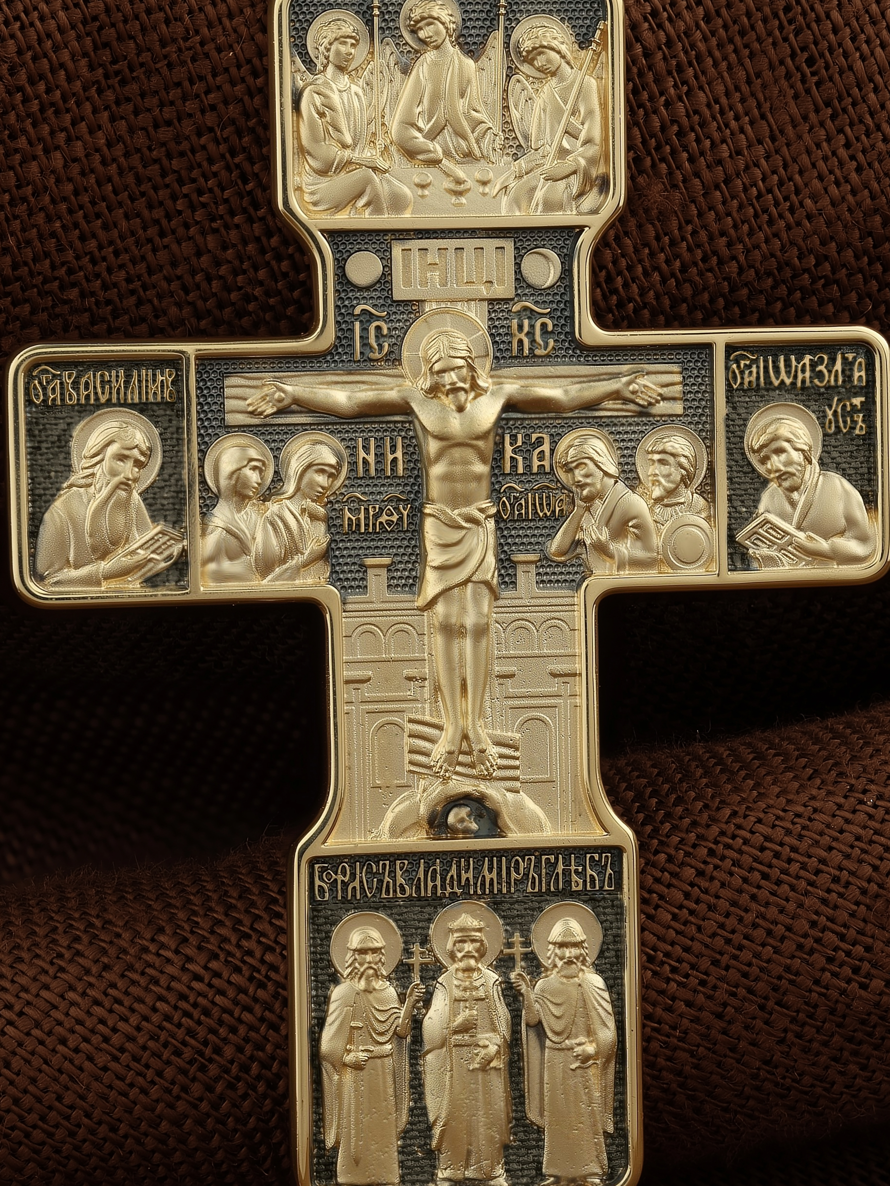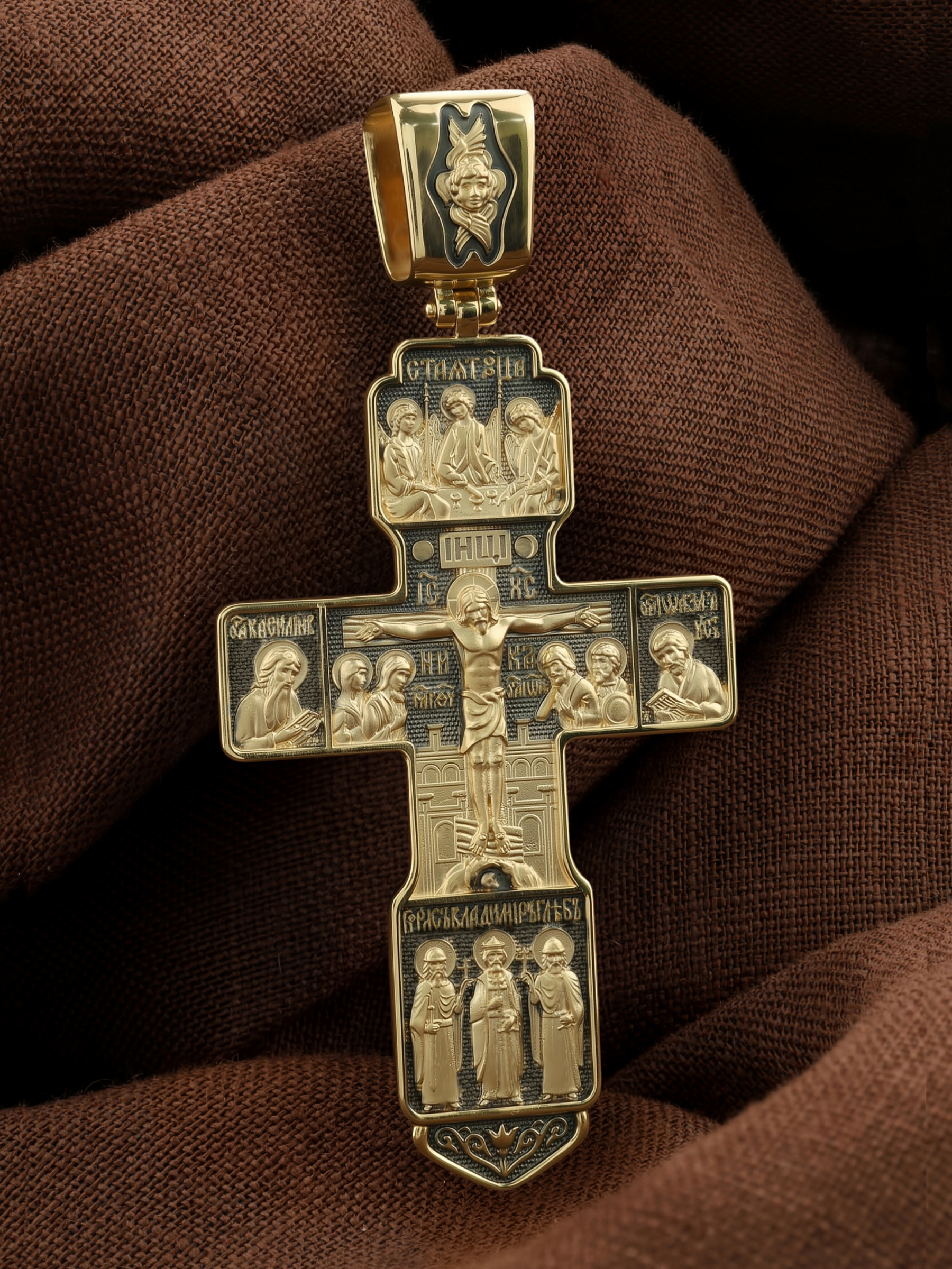 На концах горизонтальной балки креста помещены образы вселенских святителей и творцов литургии Василия Великого и Иоанна Златоуста. В кулонном кольце изображены райские врата с их стражем — Херувимом. Врата, которые открылись благодаря крестной жертве Христа.