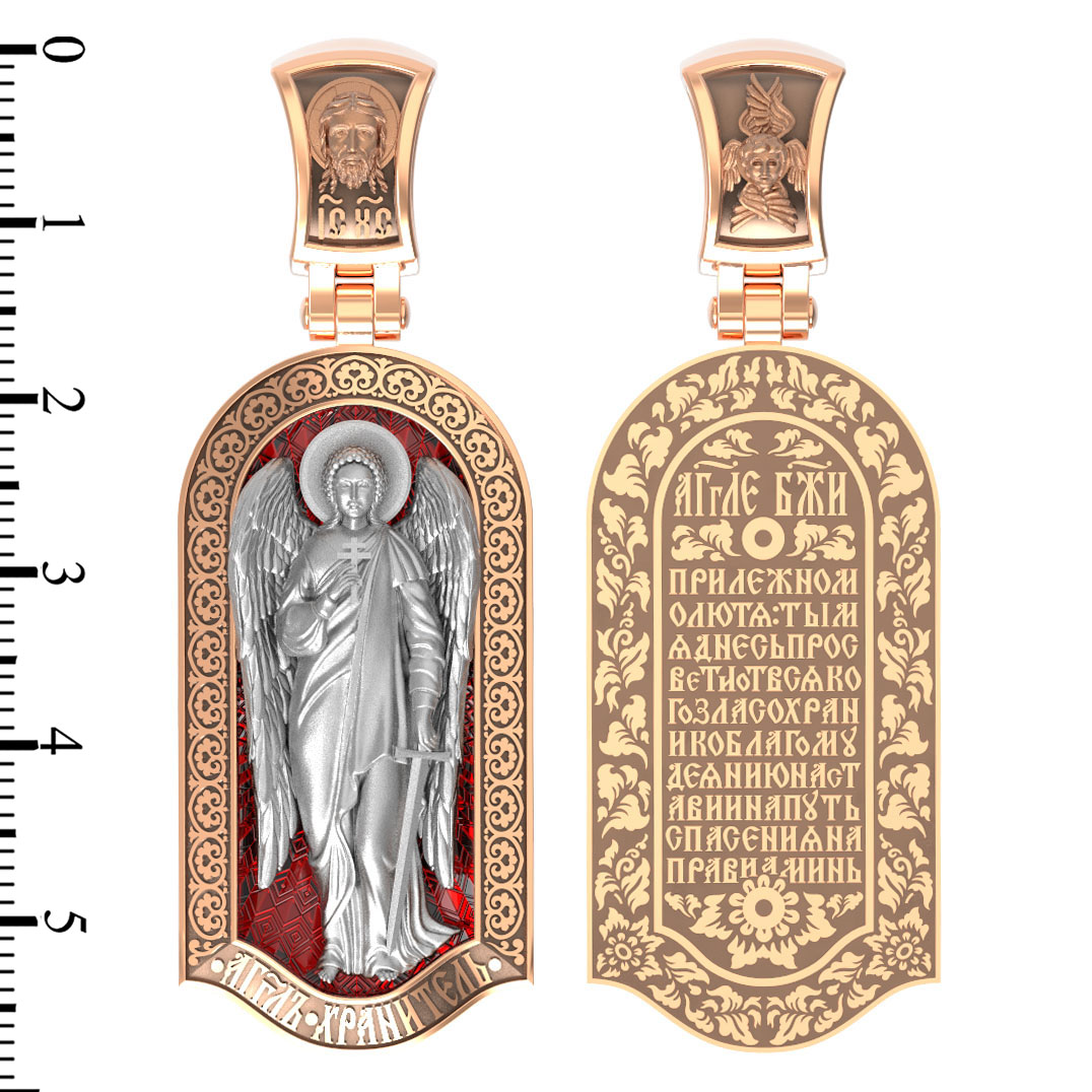 Основой композиции лицевой стороны является Ангела Хранителя. Образок Ангел Хранитель — это не просто украшение, а настоящая миниатюрная икона. В руках Ангел держит традиционные символические атрибуты Ангелов Хранителей: крест — знак послушания Христу и следования Его заповедям, меч — символ непримиримой борьбы, которую он ведет с бесами, отражая их нападения на людей. Слово «ангел» означает «вестник». Ангелы — верные служители Божьи, которых Господь посылает возвещать Свои повеления. Ангелы тварны, как и люди, но имеют другую природу. На иконах они изображаются в человеческом обличье с большими крыльями. Могучие крылья ангелов символизируют быстроту, с которой они исполняют повеления Бога, а небольшие ленточки у ушей –тороки, или слухи — показывают, что они всегда слышат Его голос.