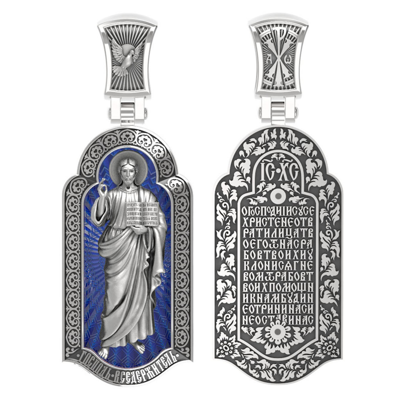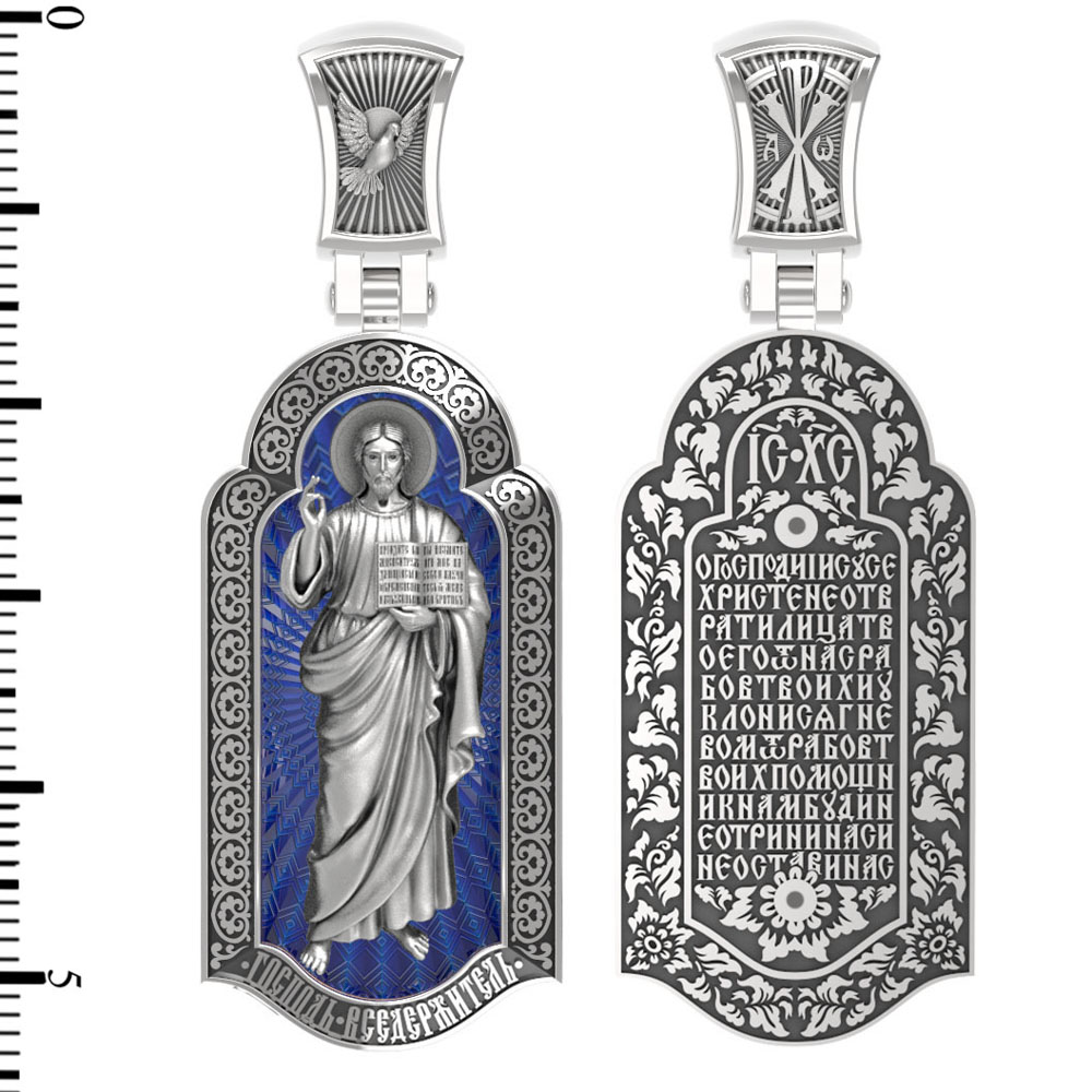 На лицевой стороне креста изображен Иисус Христос в образе Вседержителя, по-гречески «Пантократор». Это древнейший образ Спасителя, на котором Он представлен как властелин и правитель мира. Христос держит в руках Книгу, которая символизирует Книгу Бытия, то есть весь сотворенный Богом мир. В этой Книге судьбы всех людей, живущих на земле. Часто эту Книгу образно называют Книгой Жизни. Первое дошедшее до нас подобное изображение датируется VI веком и хранится в монастыре Святой Екатерины на горе Синай. Такие образы Христа с глубокой древности писались и в Палестине. Но Святая земля так часто подвергалась разграблению завоевателями, что древних икон там не осталось. Большинствоикон в храме Воскресения Христова были созданыв XIX веке.
