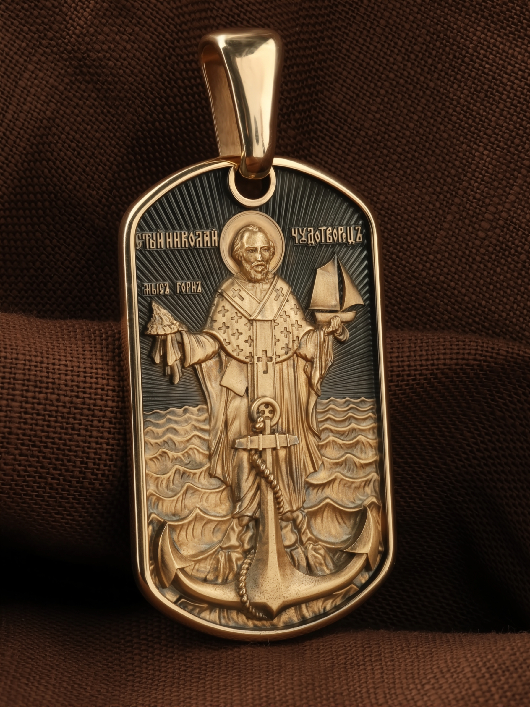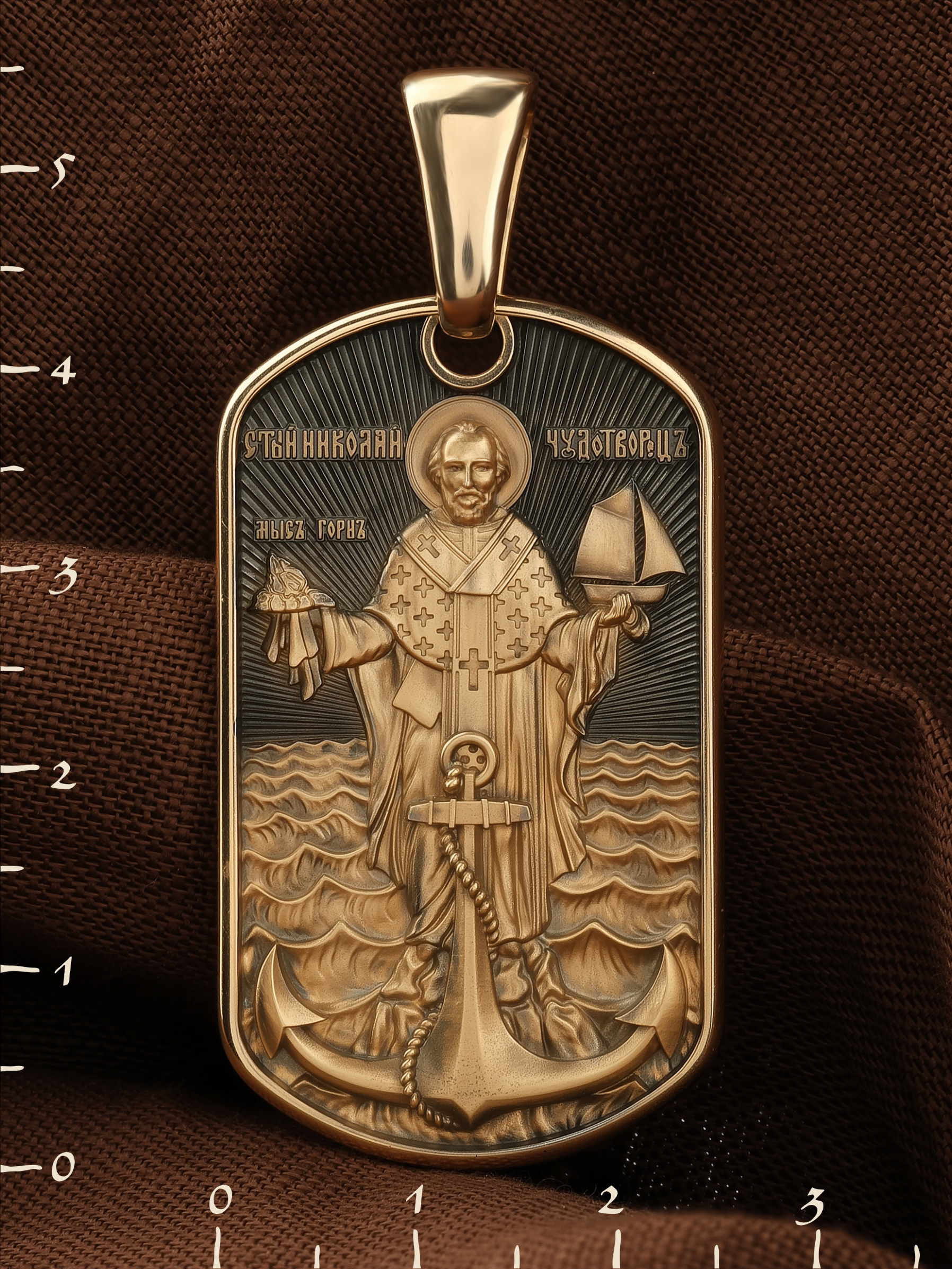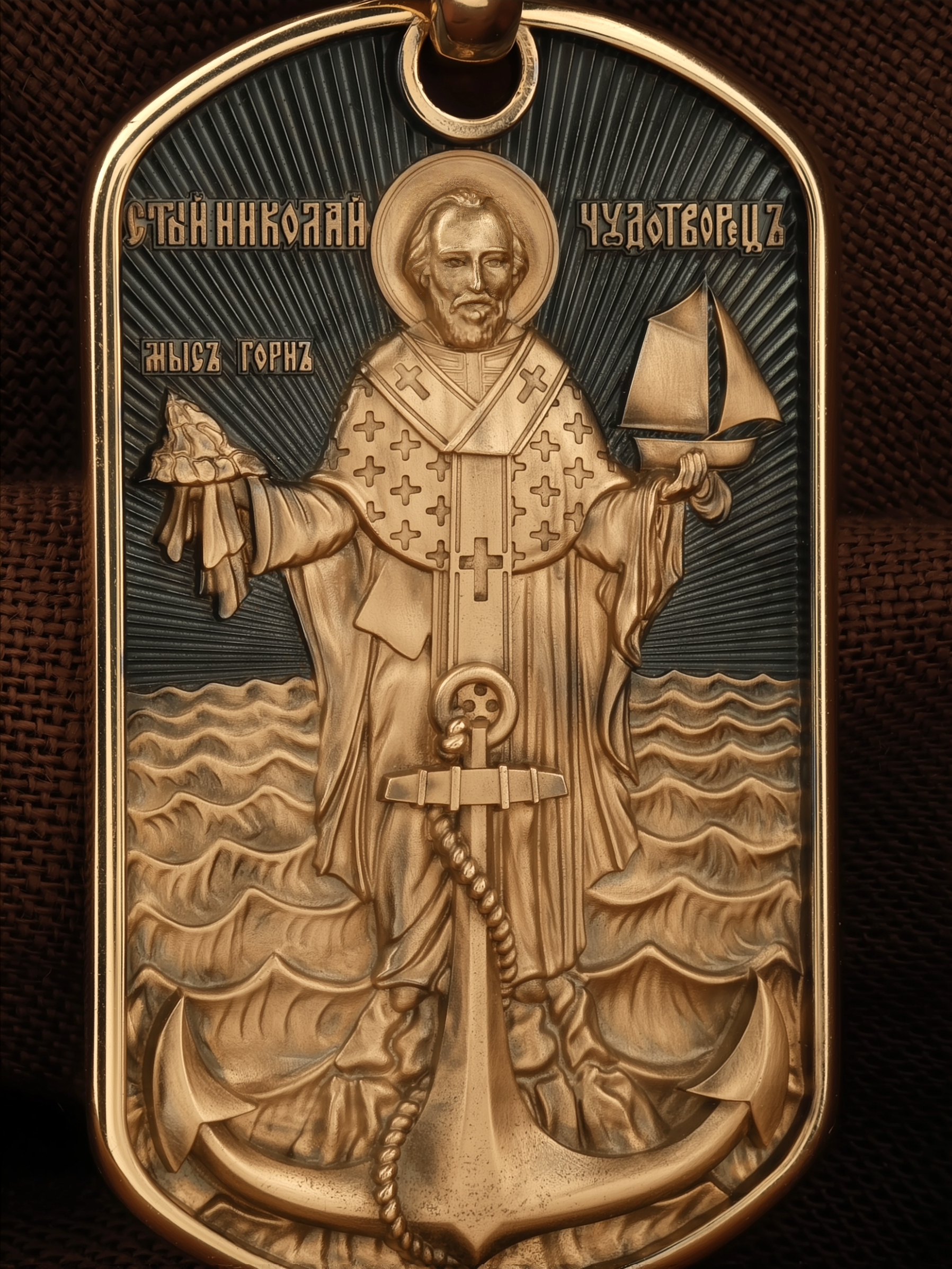 Лицевую сторону возглавляет икона Святителя Николая Чудотворца. Живший в III веке епископ Ликийского города Миры — самый почитаемый святой не только в России, но и во всем мире. Николай Чудотворец, помощник в делах, покровитель учащихся, утешитель обиженных и нуждающихся, целитель самых страшных и тяжелых недугов, предстатель и молитвенник за людей перед Богом. Также Святитель Николай Чудотворец известен своими молитвами за путешественников, когда непрестанный ветер и бушующие волны утихают и корабль заходит в спокойную гавань.