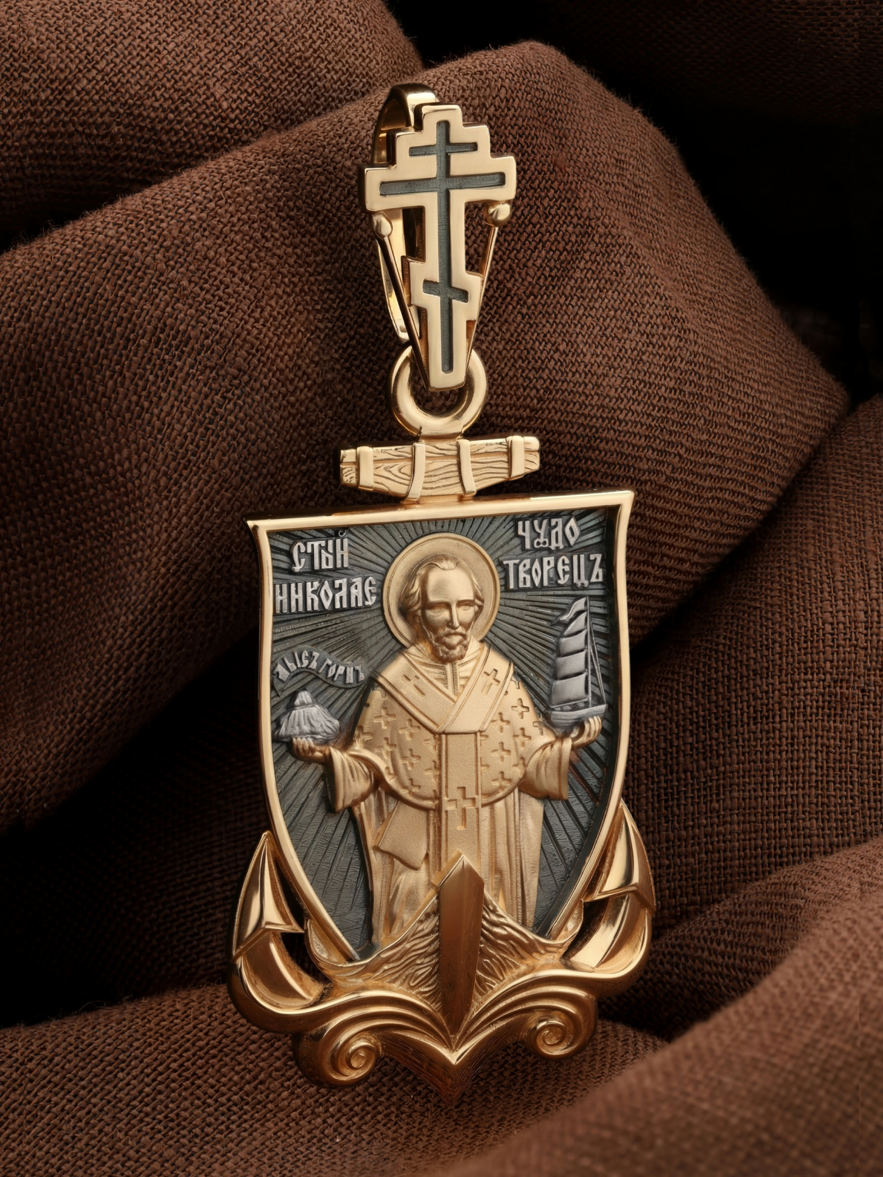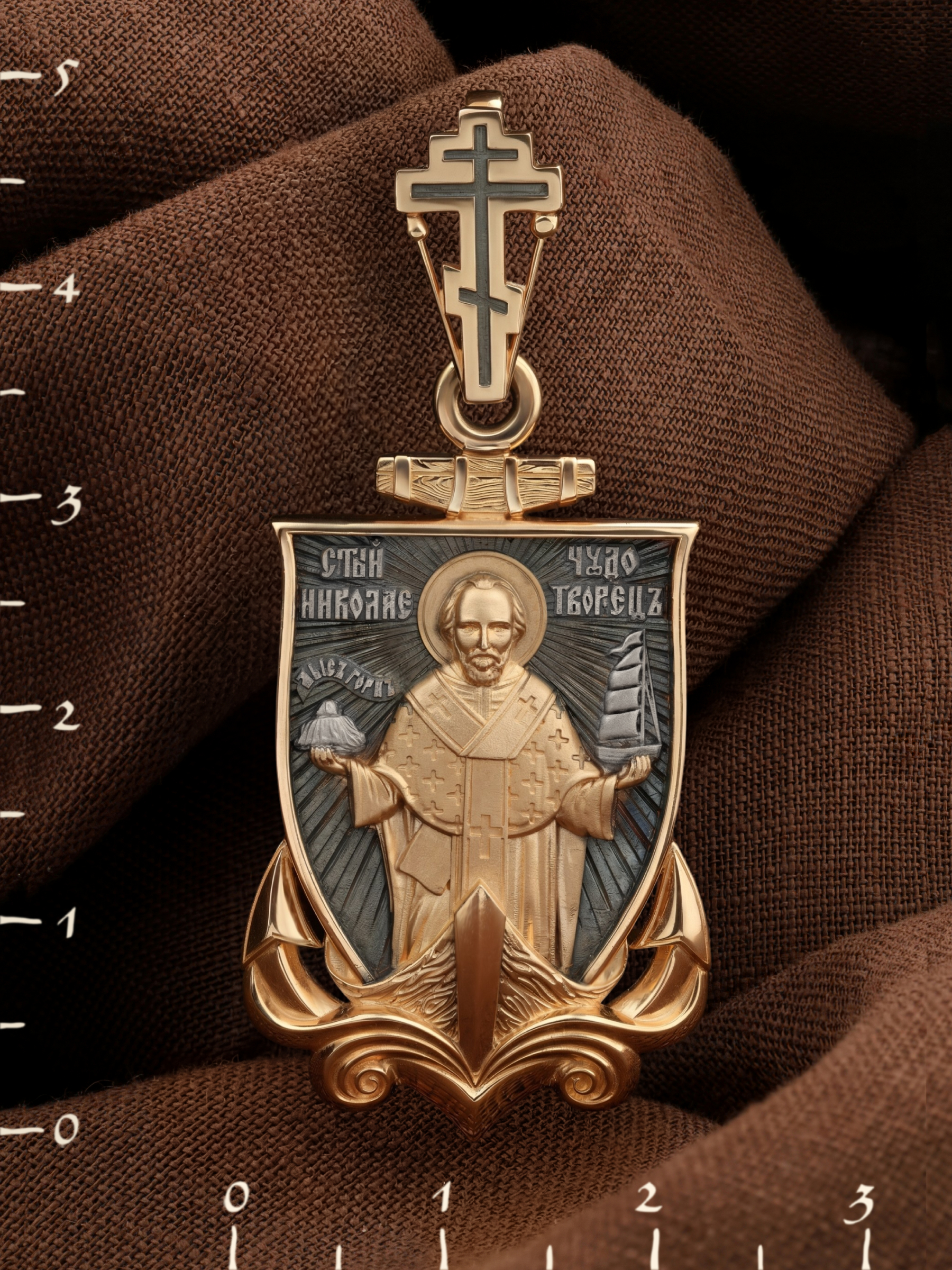 Лицевую сторону возглавляет икона Святителя Николая Чудотворца. Живший в III веке епископ Ликийского города Миры — самый почитаемый святой не только в России, но и во всем мире. Николай Чудотворец, помощник в делах, покровитель учащихся, утешитель обиженных и нуждающихся, целитель самых страшных и тяжелых недугов, предстатель и молитвенник за людей перед Богом. Также Святитель Николай Чудотворец известен своими молитвами за путешественников, когда непрестанный ветер и бушующие волны утихают и корабль заходит в спокойную гавань.
