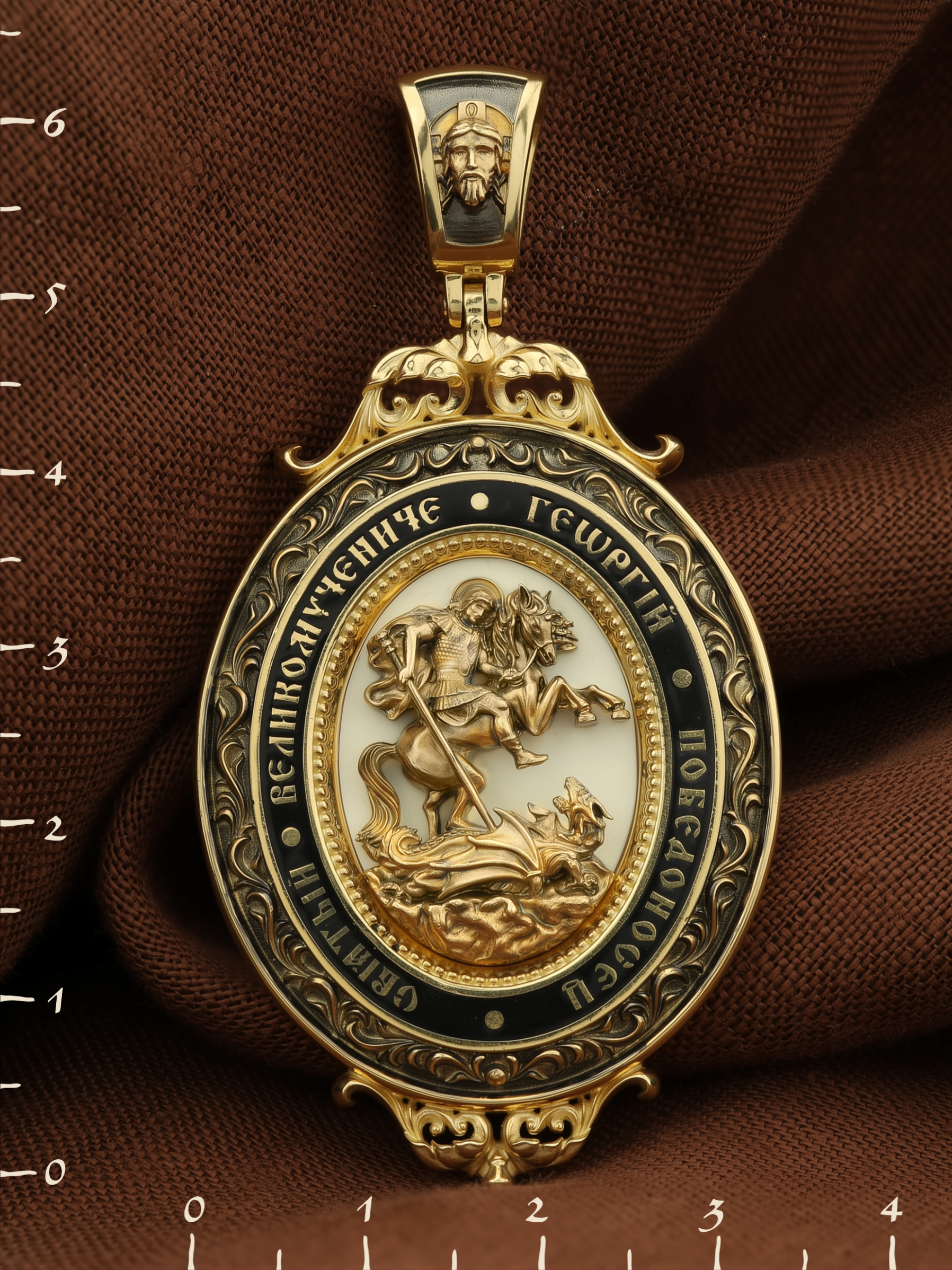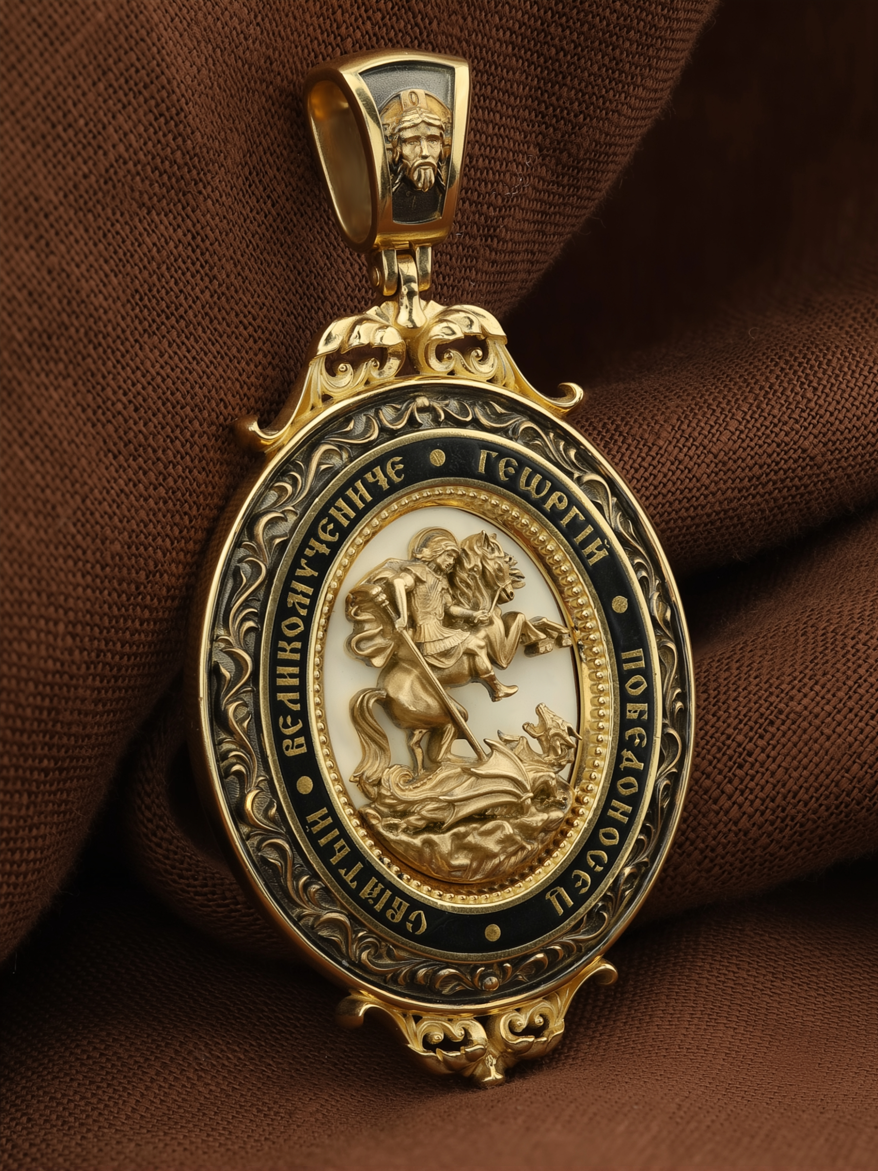 Молитва перед иконой Георгия Победоносца поможет защититься от врагов, одержать победу в сражении (военном, спортивном, духовной брани с дьяволом), содействие в установлении мира между членами семьи, избавиться от телесного недуга. На кулонном кольце изображен Спас Нерукотворный — Символ вочеловечившегося Божества и шестикрылый Серафим — самый приближенный к Господу Ангел.