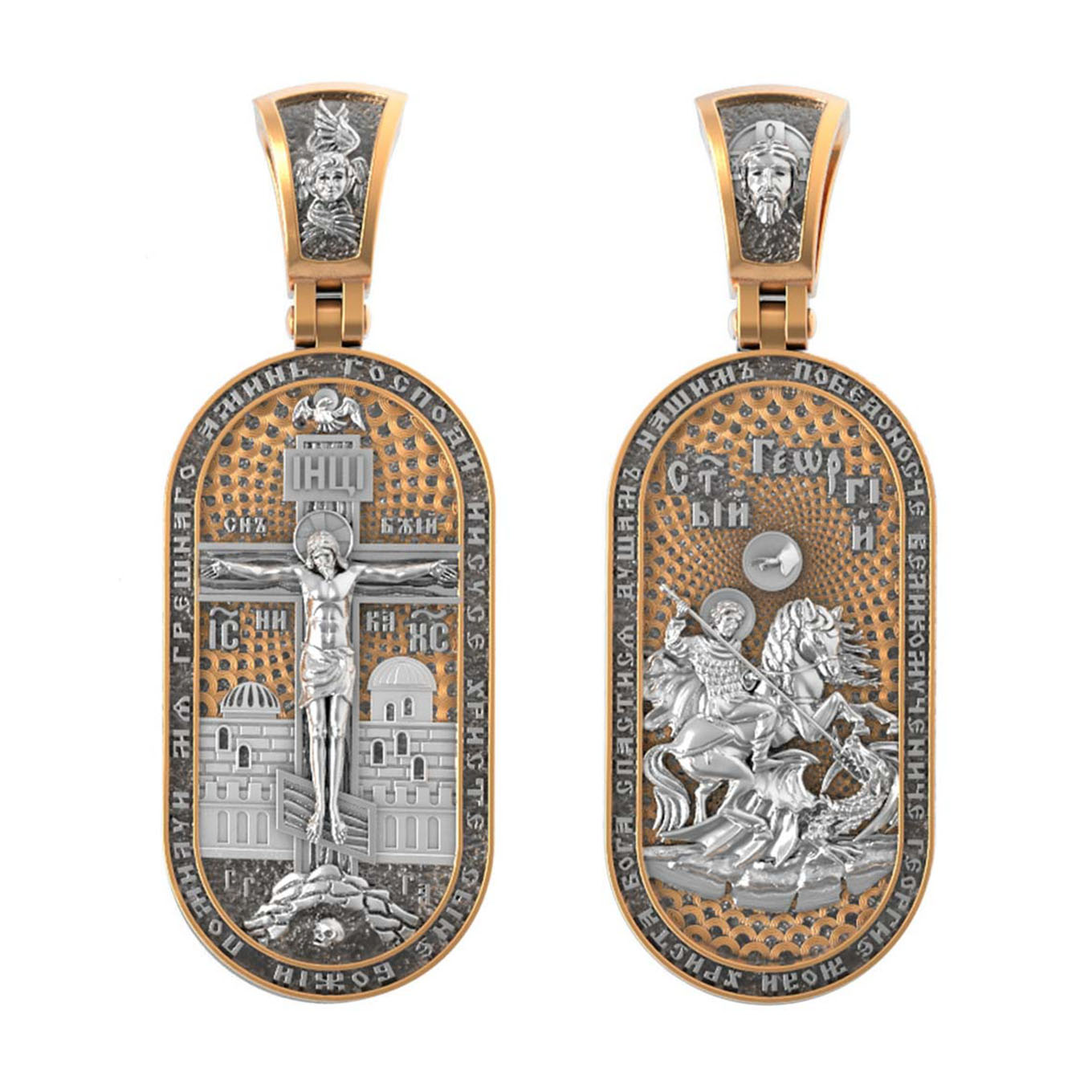 По контуру написана молитва: «Победоносче Великомучениче Георгие, моли Христа Бога спастися душам нашим». На кулонном кольце изображен Спас Нерукотворный — Символ вочеловечившегося Божества.