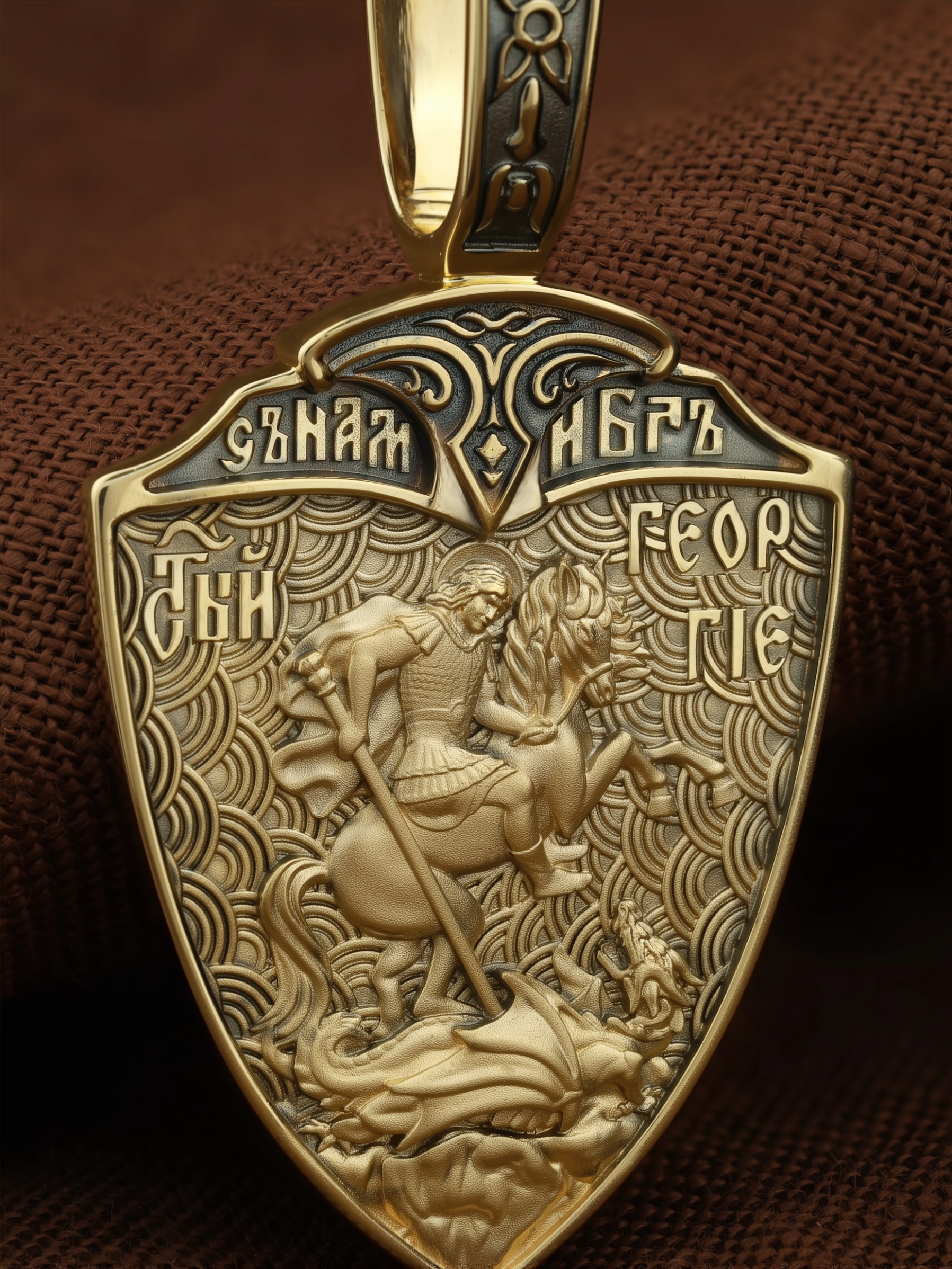 На оборотной стороне образка изображен Святой Великомученик Георгий Победоносец — один из самых почитаемых и удивительных святых. На Руси он известен как Юрий или Егорий, заступник для верующих, чья жизнь имеет какое-либо отношение к военным делам, помощник в крестьянском труде. На образке Георгий изображен как воитель, сидящий на вздыбленном коне и поражающий копьем огнедышащего змея. Змей символизирует собою сатанинские силы. Молитвами вознесенными к Всевышнему и своей непреклонной верой он смог одолеть чудовище. Святой убил змея, спас царскую дочь, принесенную в жертву, и жителей города, их души от влияния дьявола, породив в них надежду и веру в Господа, призывая людей принять христианскую веру.