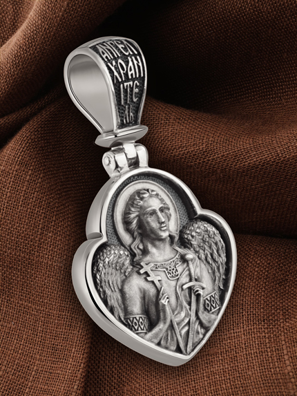 На лицевой стороне образка изображен Святой Ангел-Хранитель в виде прекрасного, светозарного юноши держащего в правой руке крест, а в левой — мечь. Ангел-Хранитель — это Ангел приставляемый Богом к человеку при крещении для охраны и помощи в добрых делах. Он невидимо находится при человеке на протяжении всей его жизни, если человек сохраняет в себе любовь к Богу и истинную веру перед Ним. Ангел-Xранитель делают для нас все, что служит к истинному нашему благу и спасению. Невидимо пребывая при нас постоянно, он, руководствуя нас ко спасению, не только по нашему желанию таинственно наставляет нас на все доброе и полезное, не только возносит наши молитвы к Богу, но еще и сам от себя охраняют и защищают нас от врагов видимых и невидимых и ходатайствует за нас пред Богом.
