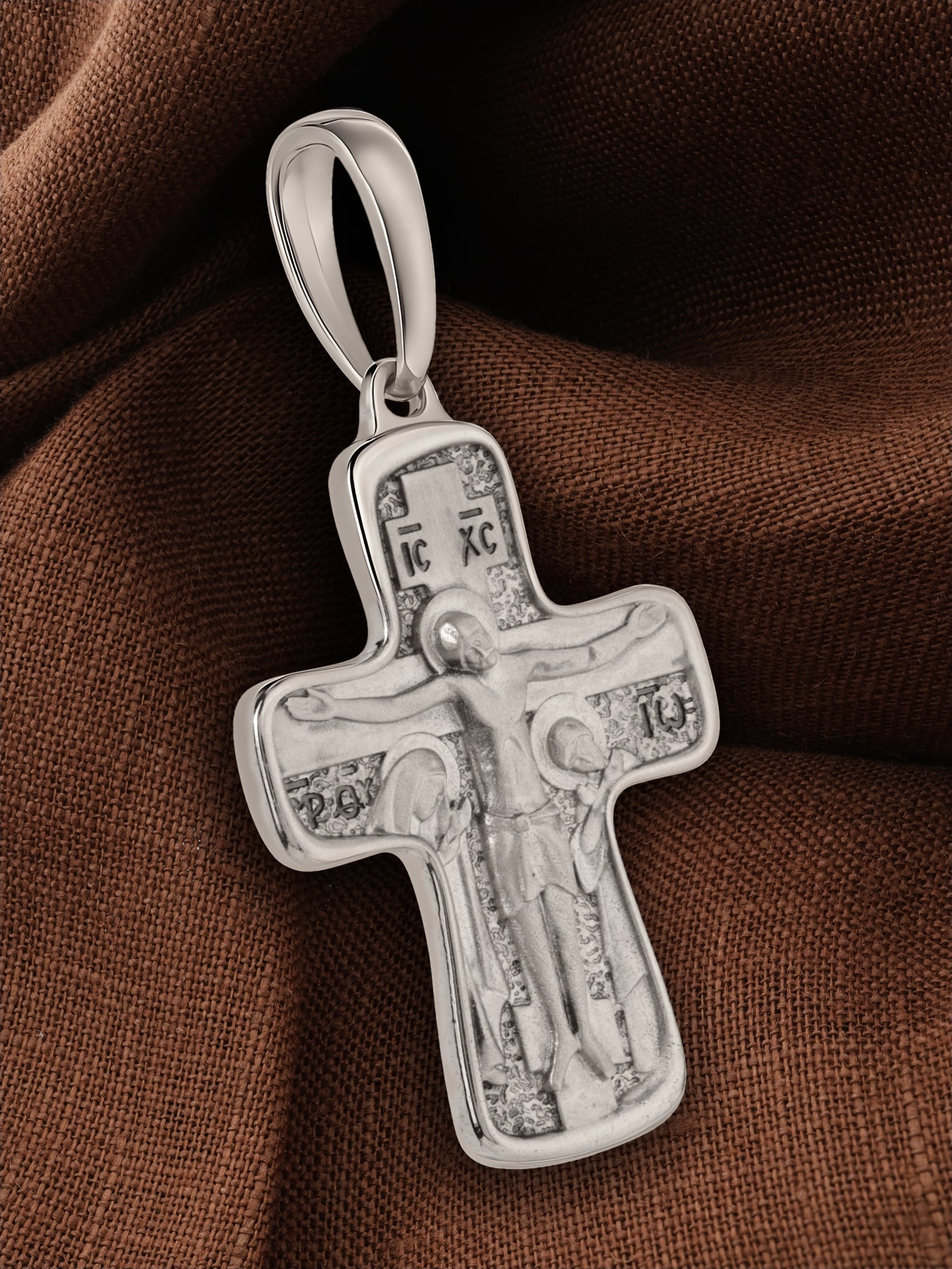 На лицевой стороне креста изображено Распятие Господа и Спасителя нашего Иисуса Христа. Крест- символ спасения и искупления рода человеческого, знамение победы над смертью и адом. Иисус Христос, как искупительная жертва освобождения человечества от власти греха, умер крестной смертью и в третий день воскрес. На верхней табличке, выше головы Иисуса расположена надпись «IС» « ХС», которая означает Иисус Христос. Слева и справа от Распятия стоят оплакивающие Господа Пресвятая Богородица и возлюбленный ученик Иисусов, Иоанн Богослов. По преданию, увидя, что они горько плачут, Иисус сказал Матери Своей: «Жено! Се сын Твой!» Потом сказал ученику: «Се мати твоя». С этого времени Иоанн взял Матерь Божию к себе, и Она жила в его доме до самой смерти.