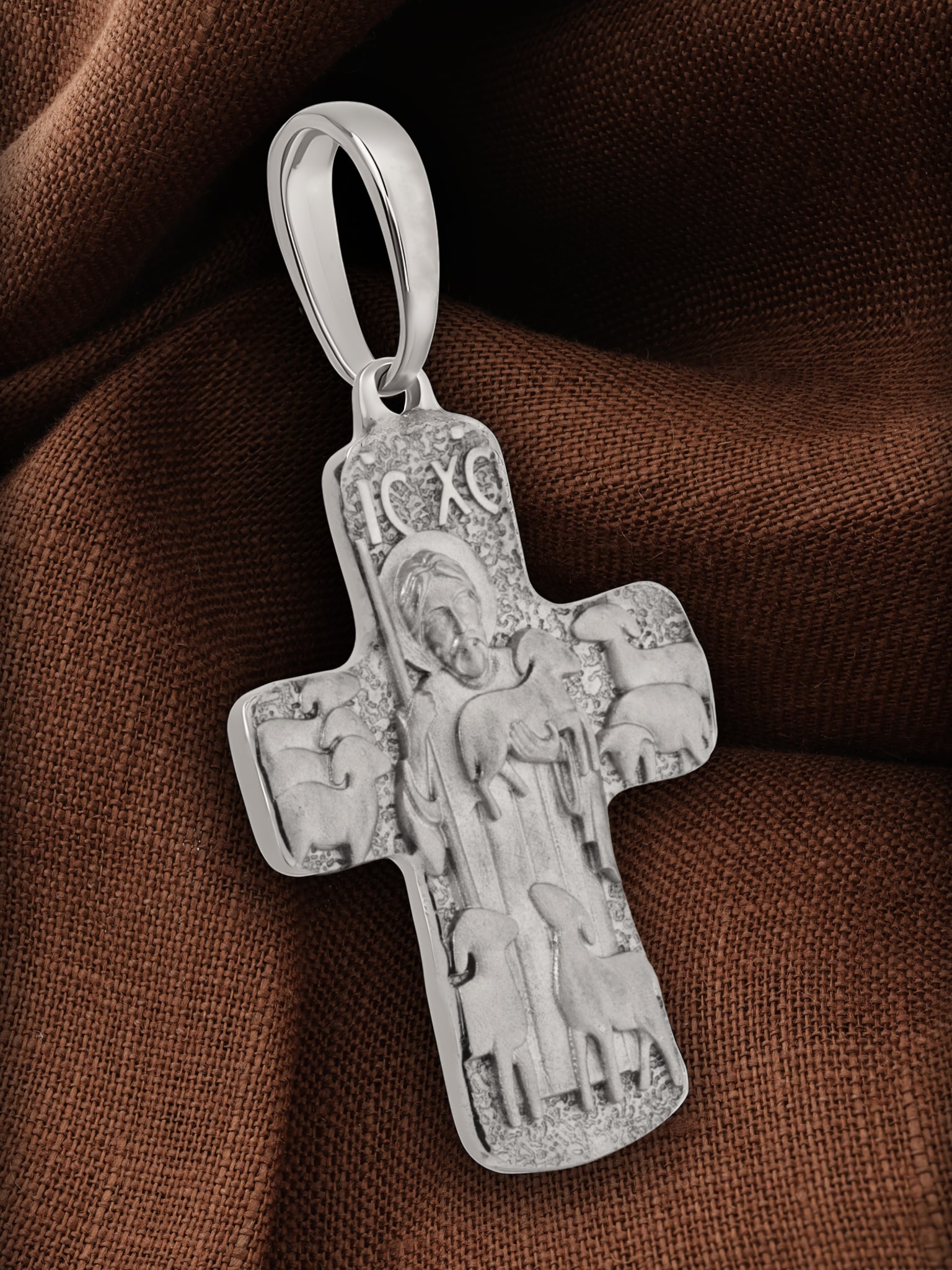 На оборотной стороне креста изображен Господь Иисус Христос в виде Пастыря, окруженного овцами и держащим на руках овцу. Смысл образа раскрывается в евангельских словах: «Я есмь пастырь добрый: пастырь добрый полагает жизнь свою за овец» (Ин.10:11). Как пастырь, Иисус готов отдать свою жизнь за своих овец. И в качестве жертвы за своих овец Он сам становится Агнцем Божьим, взявшим на себя грехи мира. В этом ключе икона Доброго Пастыря обретает множественное символическое значение, напоминая как о пастырской роли Иисуса, так и о его жертвенной роли.