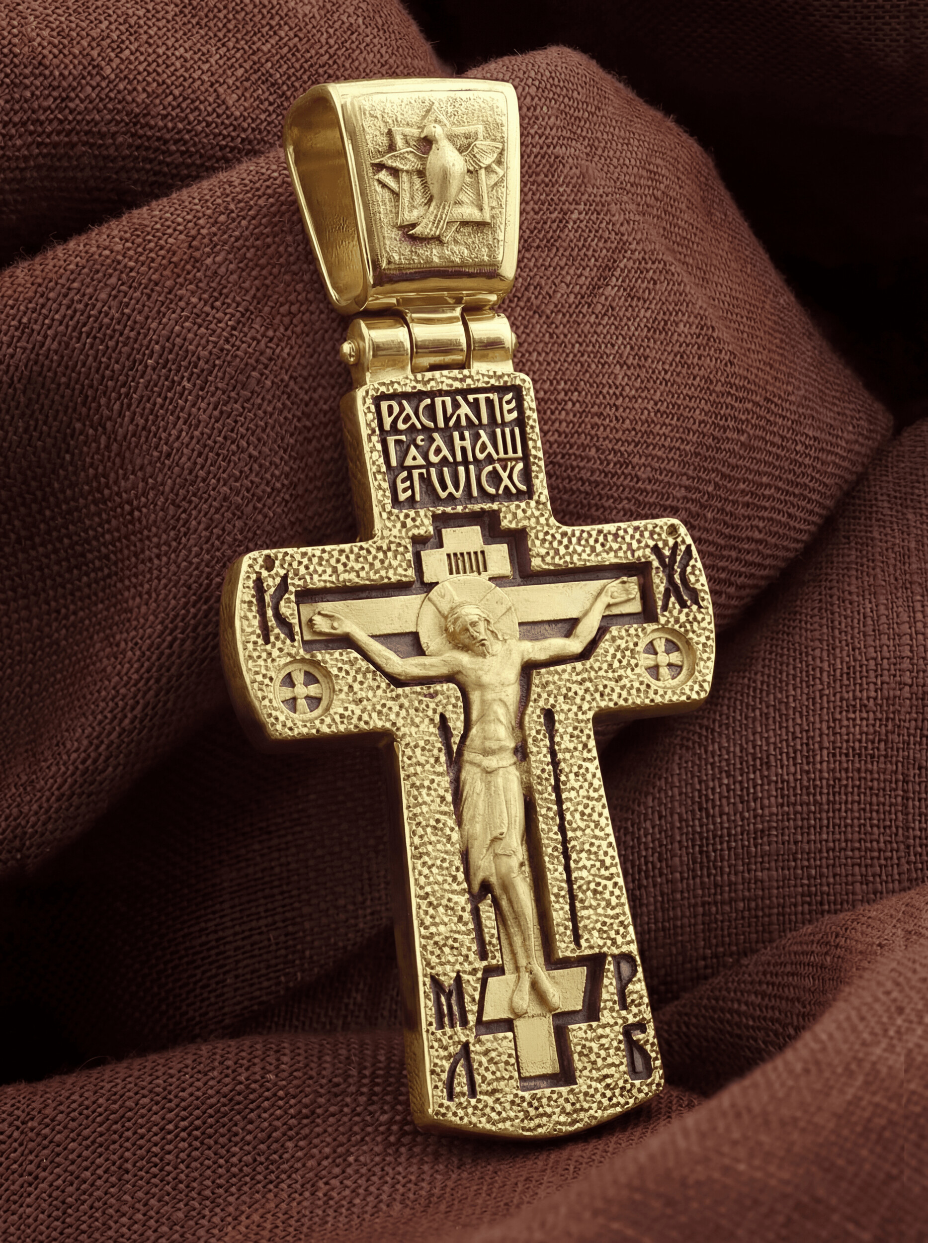 На лицевой стороне креста изображено Распятие Иисуса Христа. Господь представлен свободно покоящимся на кресте с простертыми руками и как бы обнимающим всю Вселенную. Он — Спаситель, искупивший грехи мира, «поправший смертию смерть» и призывающий к Себе «все концы земли». Верхняя перекладина символизирует титло — табличку, на которой, согласно Евангелию, было начертано: Иисус Назорей Царь Иудейский (IНЦI). Также Распятие сопровождается надписями, олицетворяющими Христа. Это святое имя Христа «IC» (Иисус) «ХС» (Христос). Возвышение, на котором стоит Крест, символизирует гору Голгофу, на которой произошло Распятие. У подножия пишутся четыре буквы «МЛ» и «РБ» — «Место Лобное» и «Рай Бысть».