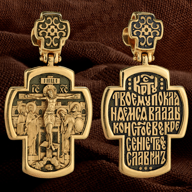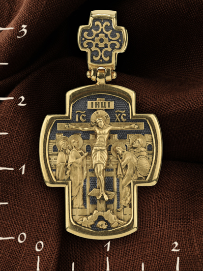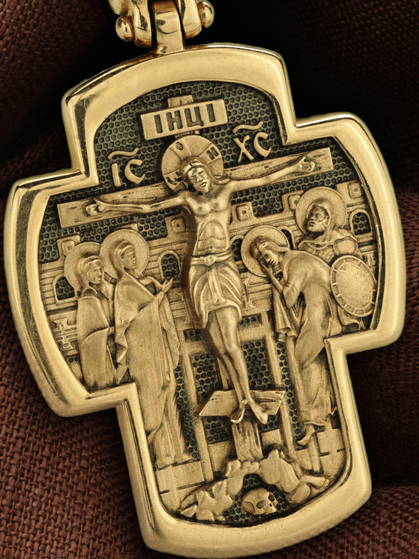 На лицевой стороне креста изображено Распятие Господа и Спасителя нашего Иисуса Христа. Своими крестными страданиями Господь смыл наши грехи, покрыл наш долг перед Богом или, на языке Писания, нас «искупил». В Голгофе сокрыта непостижимая тайна бесконечной правды и любви Бога. Крест стал символом победы добра над злом, жизни над смертью, напоминанием бесконечной Божьей любви, предметом радости. Воплотившийся Сын Божий Своею кровью освятил крест и сделал его проводником Своей благодати, источником освящения верующих. На верхней табличке, выше головы Иисуса, расположена надпись, составленная Понтием Пилатом — «IНЦI». Она означает «Иисус Назорей, Царь Иудейский». Ниже перекладины написано сокращенно имя Спасителя «IC» «XC» — Иисус Христос. Крест стоит на горе камней, символизирующих Голгофу. Под подножием Креста изображена покоящаяся голова (череп) Адама. Слева от Распятия стоят оплакивающие Господа Пресвятая Богородица и святая мироносица Мария Клеопова. Справа — апостол и евангелист Иоанн Богослов, один из ближайших учеников Иисуса Христа и сотник Лонгин. По преданию, увидя, что они горько плачут, Иисус сказал Матери Своей: «Жено! Се сын Твой!» Потом сказал ученику Иоанну: «Се мати твоя». С этого времени Иоанн взял Матерь Божию к себе, и Она жила в его доме до самой смерти.