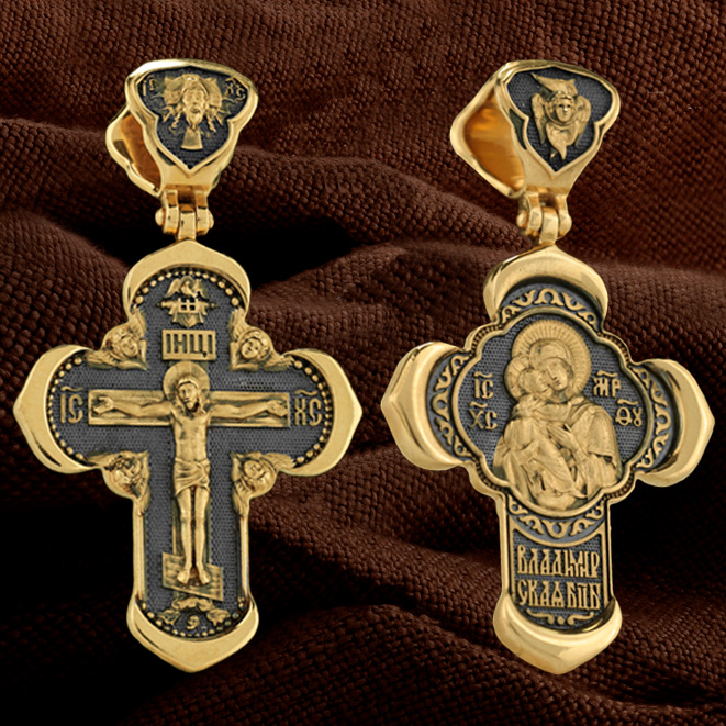 В центре оборотной стороне креста помещен образ Владимирской иконы Божией Матери — один из самых чтимых святынь Русской православной церкви. По преданию, икона была написана Святым апостолом и евангелистом Лукой во время земной жизни Богородицы. Икона Владимирской Божией Матери вплоть до V века находилась в Иерусалиме, затем была перевезена в Византию. На Русь икона была привезена в 1131 г. За прошедшие столетия святыня неоднократно переезжала из Владимира в Москву и обратно, не раз спасая страну от захватчиков. Русская Православная Церковь установила троекратное празднование Владимирской иконе Божией Матери. Каждый из дней празднования связан с избавлением русского народа от порабощения иноплеменниками по молитвам ко Пресвятой Богородице