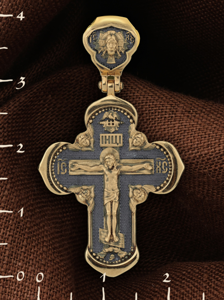 На лицевой стороне креста изображено Распятие Господа и Спасителя нашего Иисуса Христа, отдавшего Себя на смерть, для искупления грехов мира. Крест является символом жертвенной любви Всеблагого Бога к падшим людям, всепобеждающим духовным оружием христиан, основанием и средоточием церковной жизни. Господь сказал: «кто хочет идти за Мною, отвергнись себя, и возьми крест свой, и следуй за Мною». (Мк. 8: 34). На верхней табличке, выше головы Иисуса, расположена надпись, составленная Понтием Пилатом — «IНЦI». Она означает «Иисус Назорей, Царь Иудейский». Надпись «IC» «ХC», означает Иисус Христос, помещается на разных сторонах поперечной перекладины креста. Крест стоит на горе камней, символизирующих Голгофу. В ее основании различается череп– это голова Адама. На кулонном кольце изображен Нерукотворный образ Господа и Спасителя нашего Иисуса Христа, чудесно отпечатавшийся на плате, которым Христос вытер свой лик.
