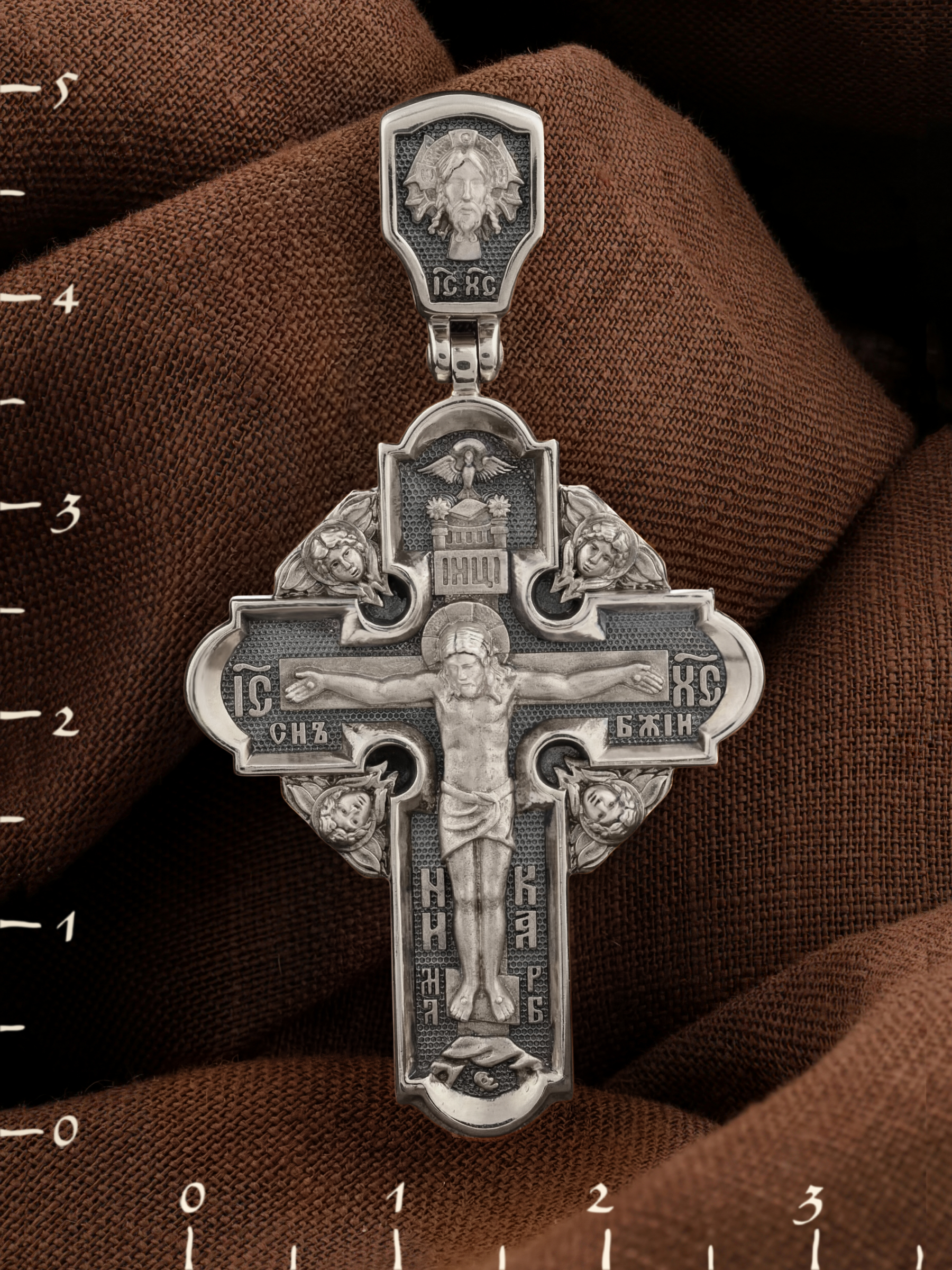 На лицевой стороне креста изображено Распятие Господа и Спасителя нашего Иисуса Христа, отдавшего Себя на смерть, чтобы другие могли жить — жить вечной жизнью, жить с Богом. Своею кровью Господь освятил крест и сделал его проводником Своей благодати, источником освящения верующих. На верхней табличке, выше головы Иисуса, расположена надпись, составленная Понтием Пилатом — «ИНЦИ». Она означает «Иисус Назорей, Царь Иудейский». Надпись «IС ХС» означает Иисус Христос помещается на разных сторонах поперечной (большой) перекладины креста. На кулонном кольце помещено изображение Духа Святого в виде голубя, сходящего с Небес