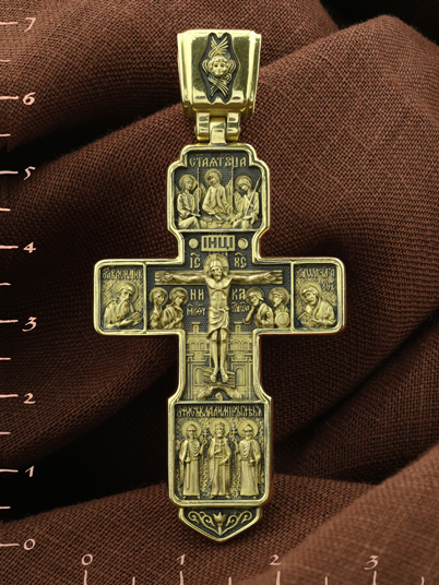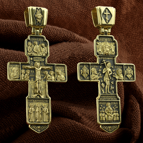 На концах горизонтальной балки креста помещены образы вселенских святителей и творцов литургии Василия Великого и Иоанна Златоуста. В кулонном кольце изображены райские врата с их стражем — Херувимом. Врата, которые открылись благодаря крестной жертве Христа.