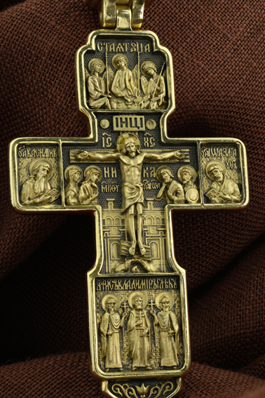 В центре лицевой стороны изображена фигура Спасителя на восьмиконечном кресте, на фоне Иерусалимской стены. Ему предстоят скорбящие Богородица, Иоанн Богослов, Мария Магдалина и сотник Лонгин. Над крестом — солнце и луна. Крест стоит на горе камней, символизирующих Голгофу, в основании которой различается череп. Это голова Адама. Распятие сопровождается каноническими надписями. Над Распятием в оглавии изображен образ Пресвятой Троицы. Это образ Триединого Бога явившегося в виде трех Ангелов праотцу Аврааму. Ангелы сидят за трапезным столом вокруг чаши, которая символизирует грядущую жертву Второго Лица Пресвятой Троицы, Бога Сына.