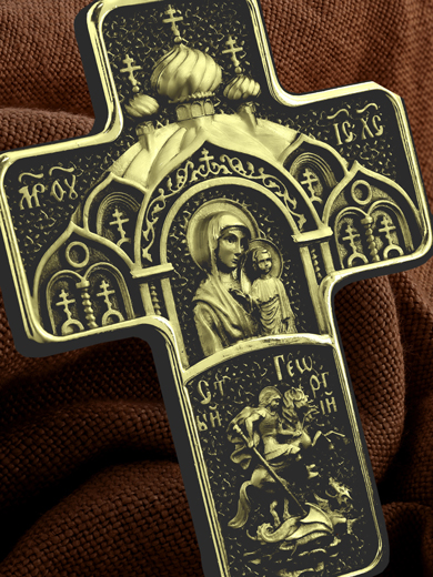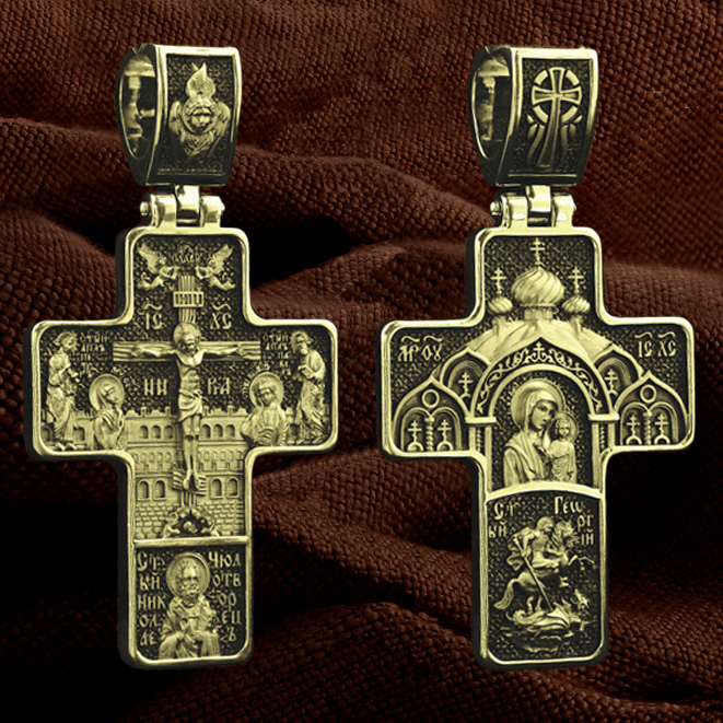 На центральной части оборотной стороны креста изображена Казанская икона Божией Матери в киоте. Она является одной из главных православных святынь на Руси. Ниже помещен образ Святого Великомученика Георгия Победоносца — одного из самых почитаемых и удивительных святых. На образке он изображен как воитель поражающий копьем огнедышащего змея. Змей символизирует собою сатанинские силы. На кулонном кольце помещен крест.