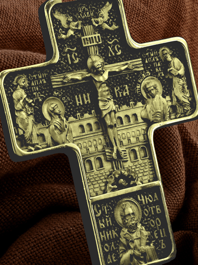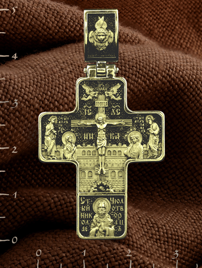 На лицевой стороне креста изображено Распятие Господа и Спасителя нашего Иисуса Христа, отдавшего Себя на смерть, для искупления грехов мира. Крест является символом жертвенной любви всеблагого Бога к падшим людям, всепобеждающим духовным оружием христиан, основанием и средоточием церковной жизни. Верхняя перекладина символизирует титло — табличку, на которой, согласно Евангелию, было начертано: Иисус Назорей Царь Иудейский (IНЦI). Распятие сопровождается надписями, олицетворяющими Христа. Надпись «IС» « ХС», что означает Иисус Христос, находится над поперечной перекладиной креста. Ниже помещено слово «НИКА», что означает «победитель». Над вершиной Распятия помещена надпись «Царь Славы» и изображены парящие ангелы со свитками в руках. Слева от Распятия изображена Пресвятая Богородица, справа — апостол и евангелист Иоанн Богослов, один из ближайших учеников Иисуса Христа.. По обеим сторонам от Распятия помещены образы святых Первоверховных Апостолов — Петра и Павла. За крестом высится Иерусалимская стена, в знак того, что Господь был распят вне стен города. Возвышение, на котором стоит Крест, символизирует гору Голгофу, на которой произошло Распятие. Под подножием Креста изображена покоящаяся голова (череп) Адама. Ниже Распятия помещен образ Святителя Николая архиепископа Мир Ликийских, Чудотвореца. На кулонном кольце изображен шестикрылый Серафим.
