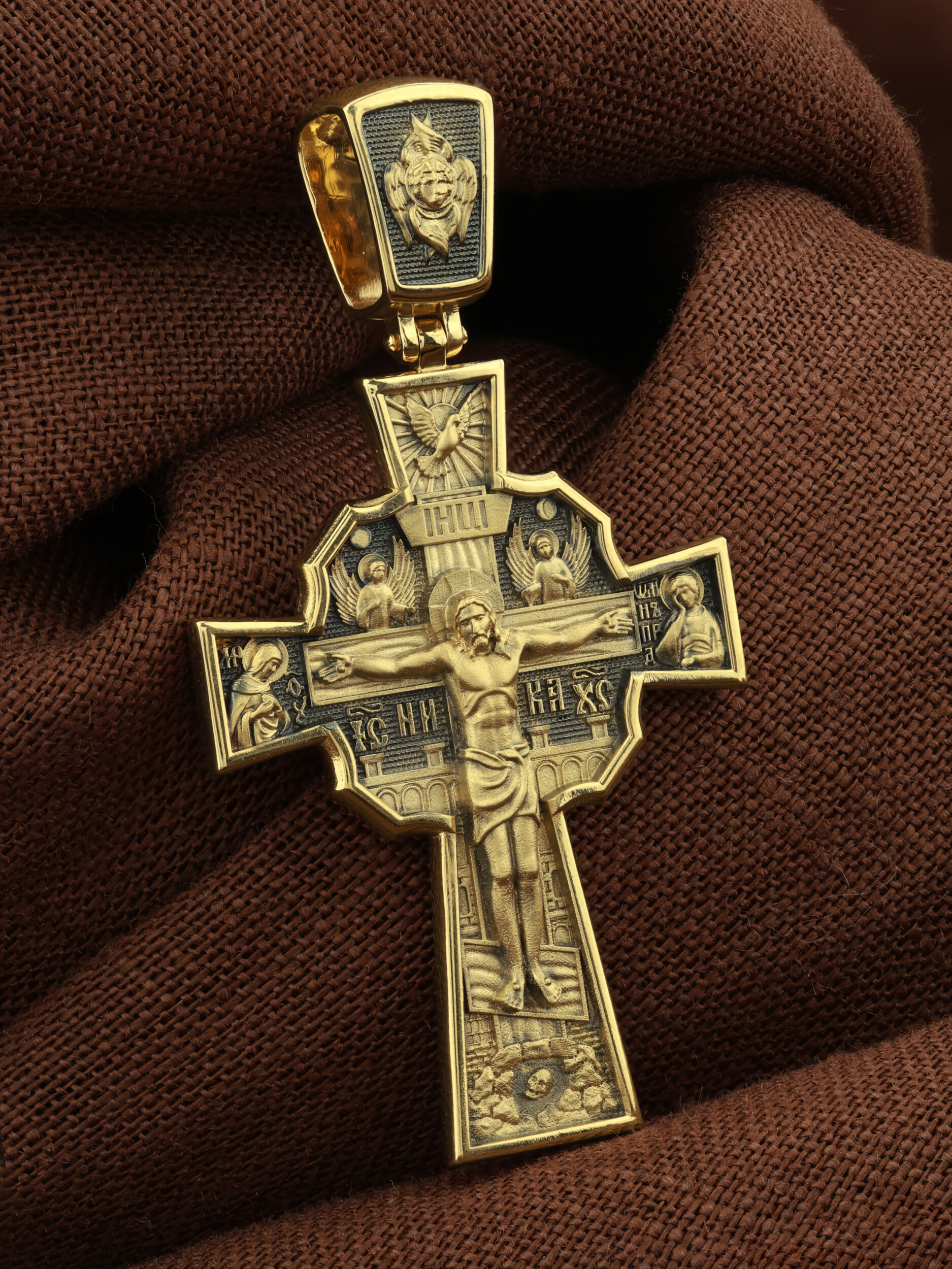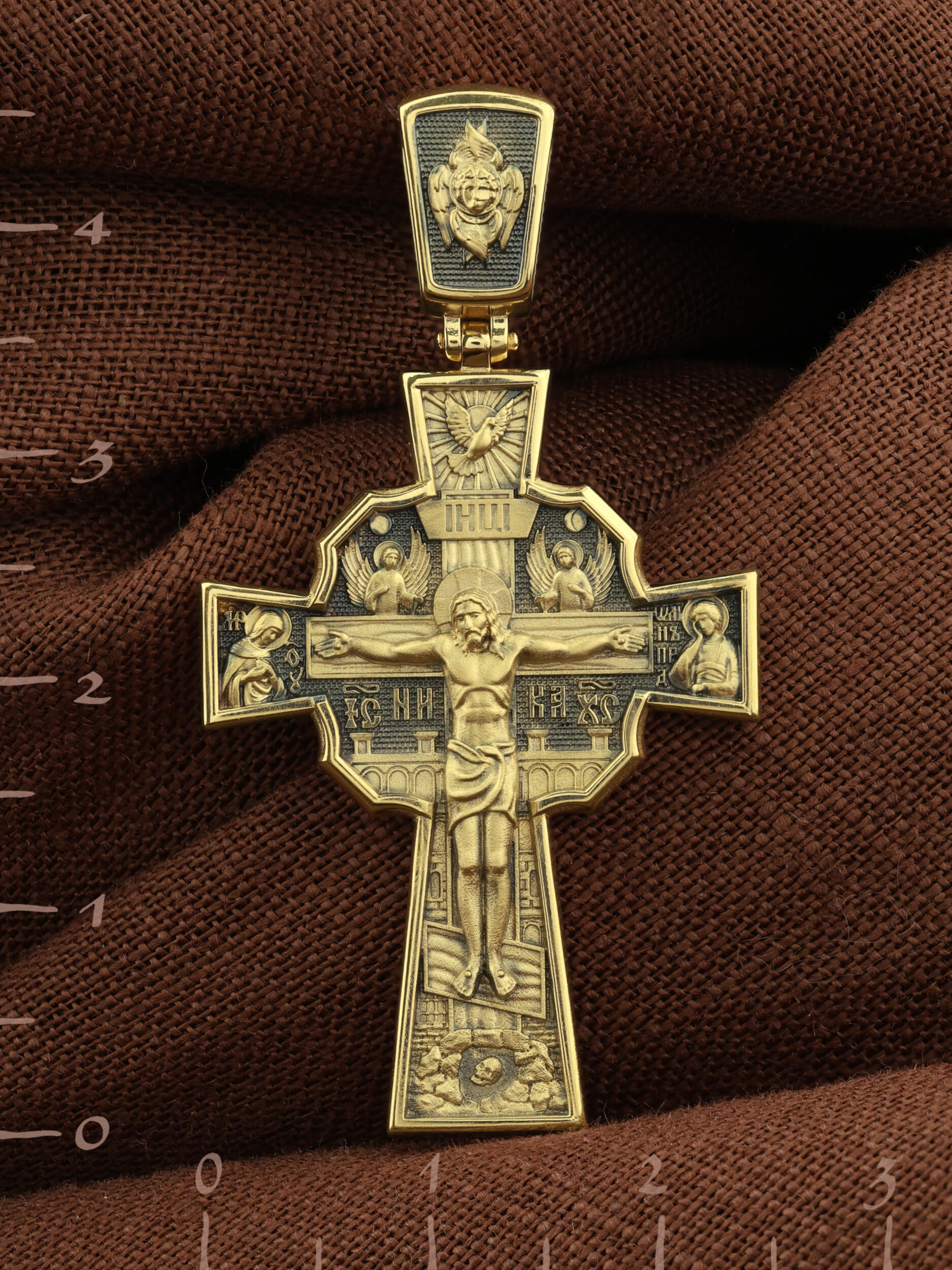 На лицевой стороне креста изображено Распятие Господа и Спасителя нашего Иисуса Христа, отдавшего Себя на смерть, для искупления грехов мира. Верхняя перекладина символизирует титло — табличку, на которой, согласно Евангелию, было начертано: Иисус Назорей Царь Иудейский (IНЦI). Распятие сопровождается надписями, олицетворяющими Христа. Надпись «IС» « ХС», что означает Иисус Христос, и слово «НИКА», что означает «победитель», помещаются ниже поперечной перекладины креста. Над вершиной Распятия помещено изображение Святого Духа, в виде голубя сходящего с небес, и двух Ангелов. Слева от Распятия изображена Пресвятая Богородица, справа — апостол и евангелист Иоанн Богослов, один из ближайших учеников Иисуса Христа. За крестом высится Иерусалимская стена, в знак того, что Господь был распят вне стен города. Возвышение, на котором стоит Крест, символизирует гору Голгофу, на которой произошло Распятие. Под подножием Креста изображена покоящаяся голова (череп) Адама. На кулонном кольце помещено изображение шестикрылого Серафим.