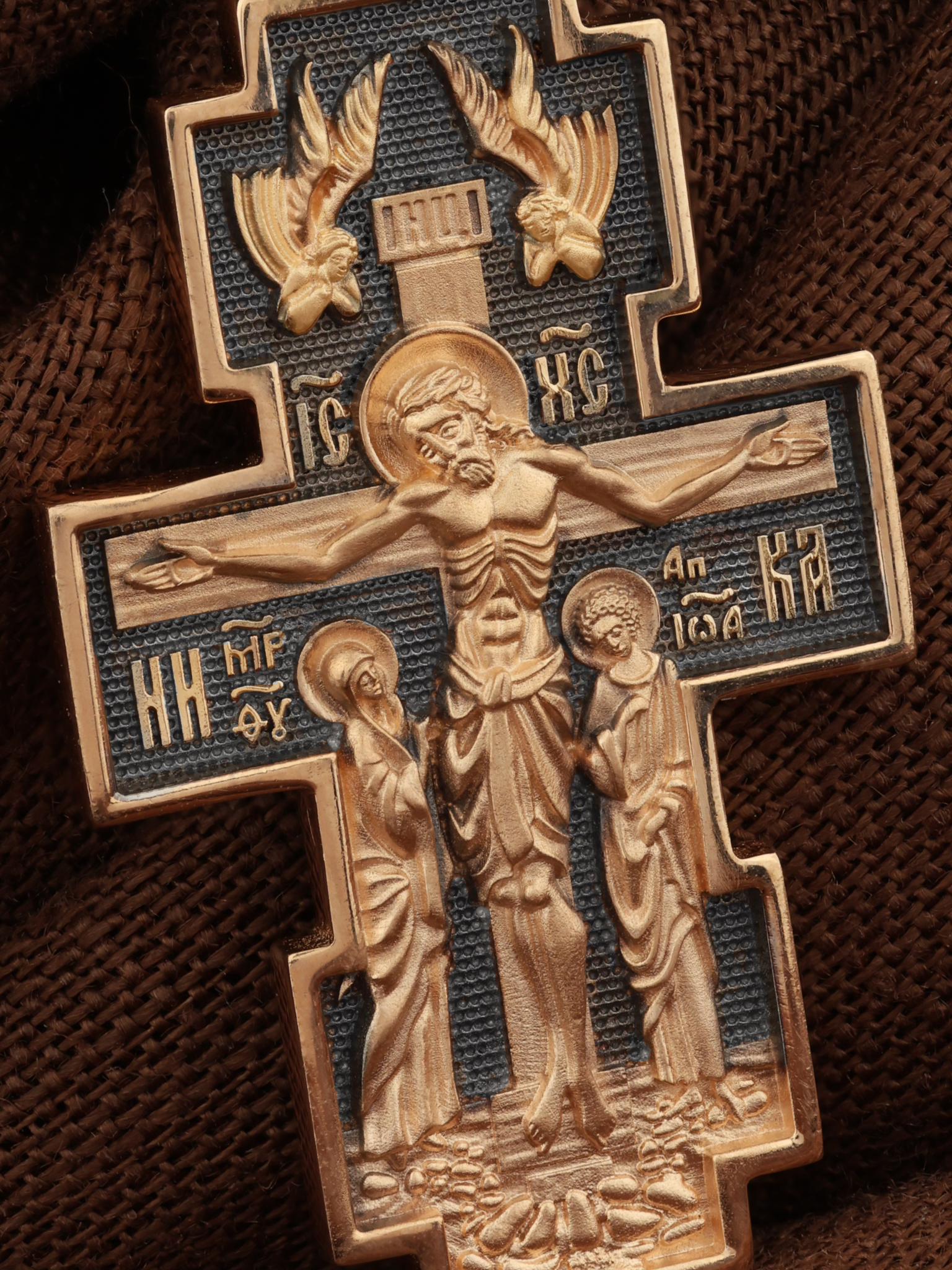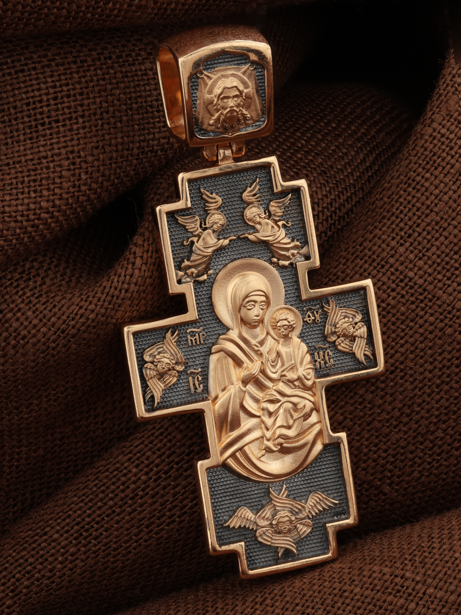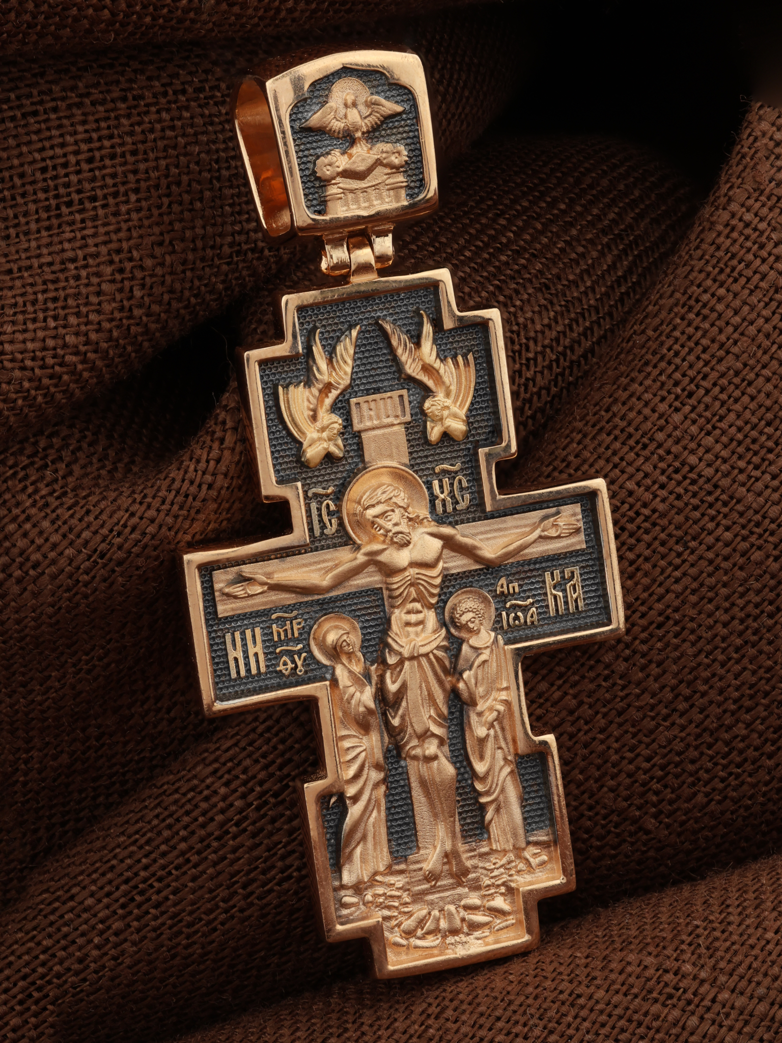 На лицевой стороне креста изображено Распятие Христово — величественный, торжественный образ христианства, знак победы над смертью. Христос, принеся Себя в Жертву на Кресте, искупил грехи всего мира и дал людям возможность обрести спасение. Слева и справа от Креста стоят Богоматерь и апостол Иоанн Богослов. По преданию, именно они до последнего не оставляли Спасителя в Его страданиях, были с Ним до самой смерти. Во главе образка изображен парящий голубь — символ Святого Духа и Его благодати. Сверху над Распятием парят Ангелы. Они изображены летящими с Небес вниз, к Кресту. Ангелы словно поддерживают табличку над головой Спасителя, на которой написано IНЦИ — «Иисус Назарянин Царь Иудейский». Эта табличка — титло — была приколочена римскими палачами как указание на «вину» Христа, то, за что Он был казнен.