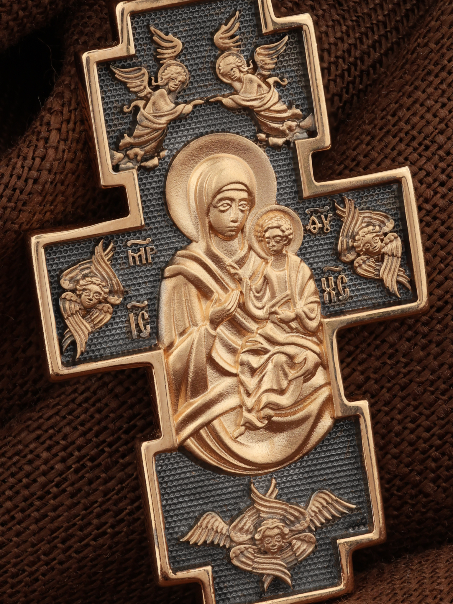 На обороте креста помещена величайшая святыня России, самая любимая и почитаемая верующими икона Пресвятой Богородицы — Казанская. С двух сторон от образа Казанской Божьей Матери расположены херувимы, под образом — серафим. Серафимы и херувимы — высшие ангелы, ближе всех Небесных Сил предстоящие Божественному Престолу.